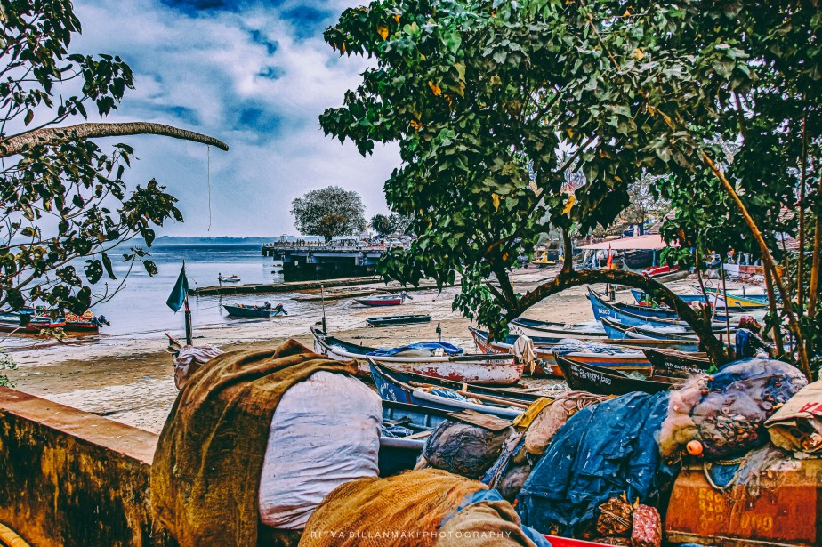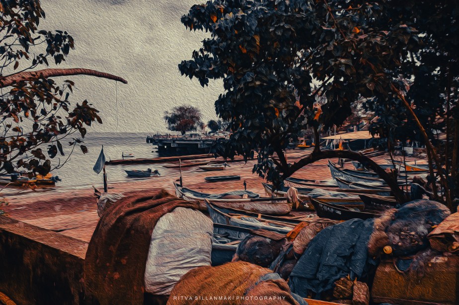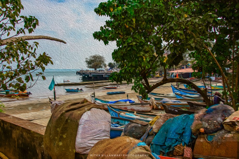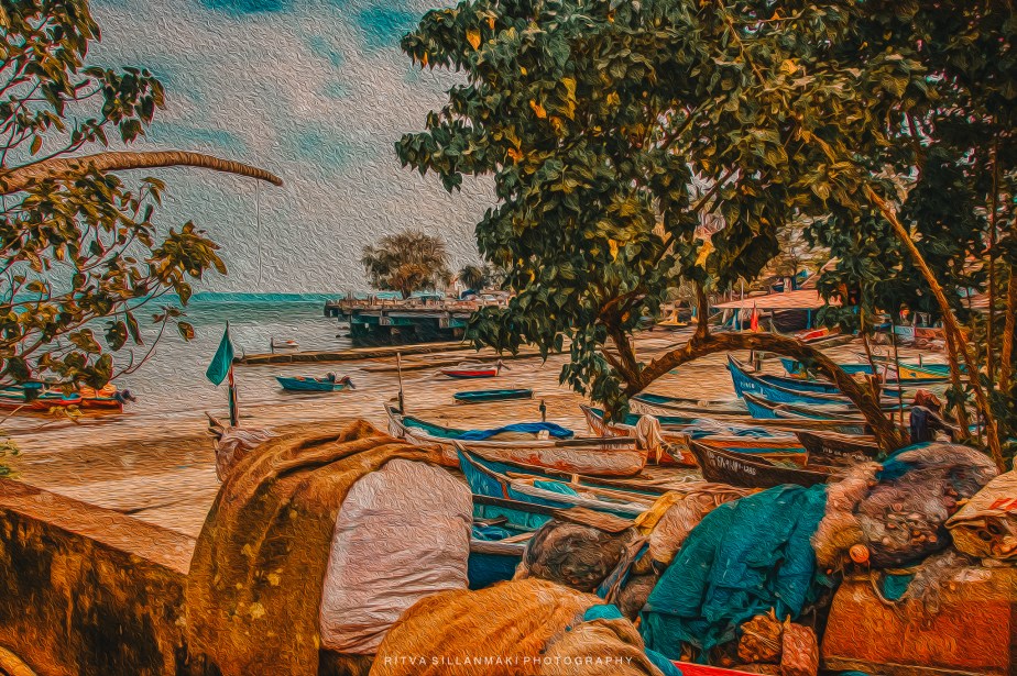 A serene view of a bay with colorful fishing boats and a quiet shoreline, framed by lush greenery. The original image.Orange and turquoise tones as a paintingMore towards greys and muted tones more event texturePainting -brush splatters, slightly blue tones