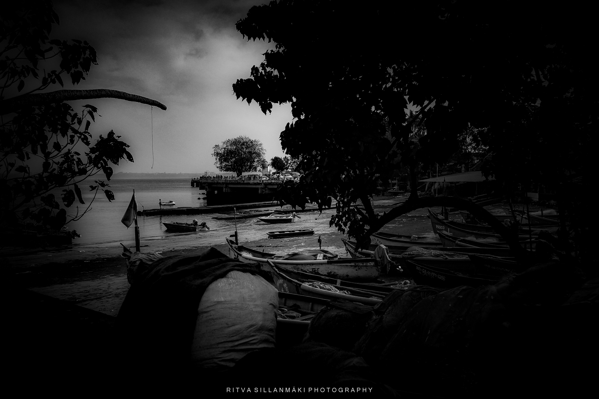 A moody black and white photograph of boats docked at a waterfront, surrounded by lush trees and a cloudy sky.