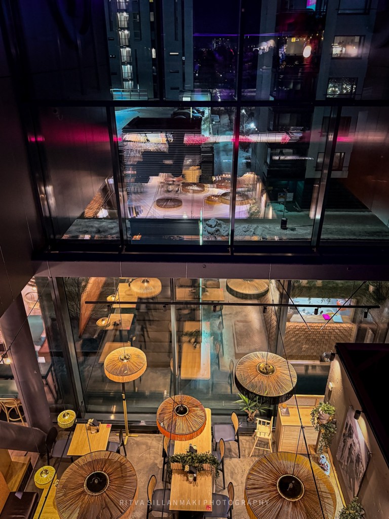 Aerial view of a cozy restaurant interior featuring modern decor, wooden tables, and unique pendant lighting.