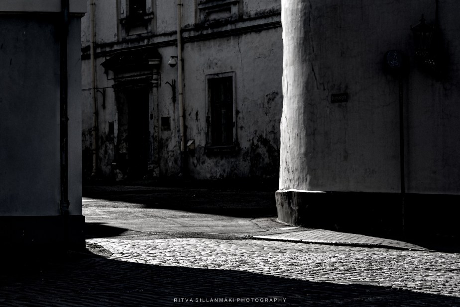 A dimly lit urban street corner with a strong contrast between light and shadow in Riga. The cobblestone pavement in the foreground is brightly illuminated by sunlight, casting textured patterns, while the background buildings show signs of age with worn, cracked walls and darkened windows. The scene exudes a moody, almost mysterious atmosphere, enhanced by the deep shadows that obscure parts of the architecture and street. Minimalist in color, the photo emphasizes monochrome tones, focusing on the interplay of light, texture, and urban decay.