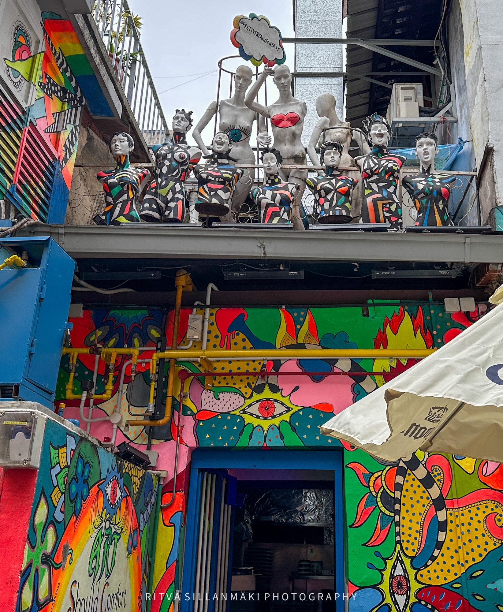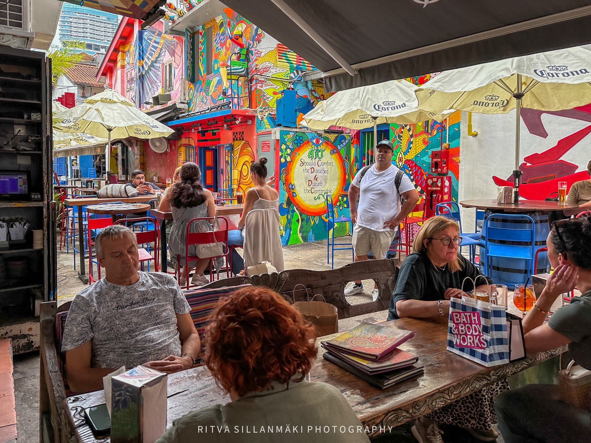 Like Monty Python used to say… And now for something completely different. From the Flyer we walked slowly to Haji Lane, a colorful and lively area filled with artisan shops, restaurants and small cafes. Very eye-catching were the murals along the area. The area is quite small but so different from the rest of Singapore that it is worth visiting. We stopped at a Mexican restaurant/café for relaxing and cooling drinks while waiting for the afternoon tea at Atlas Bar.