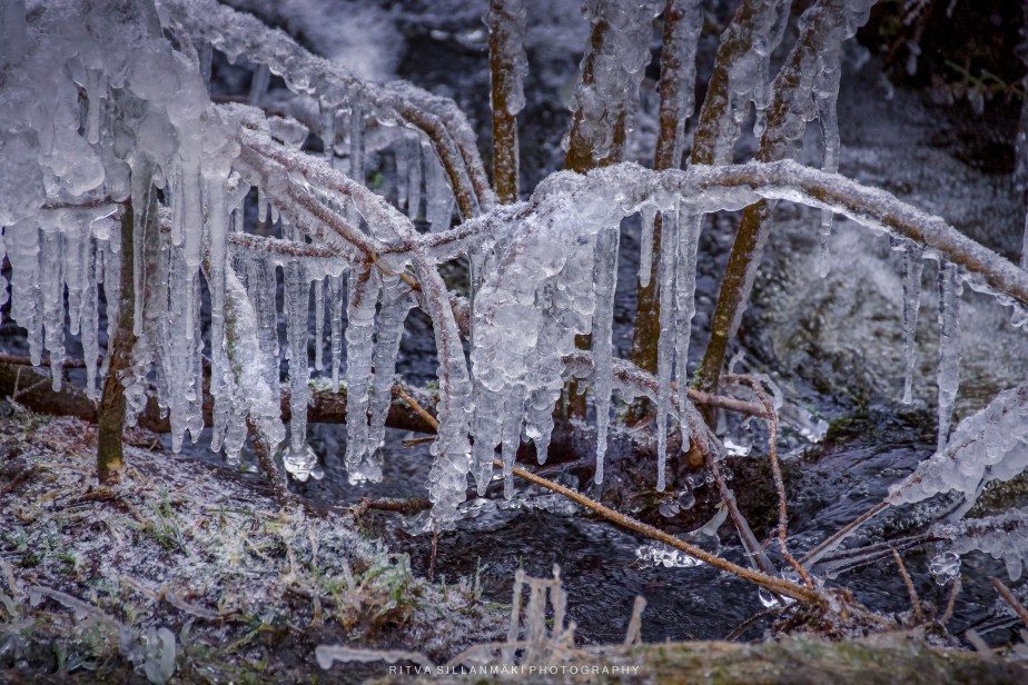 Icicles forming on branches near a flowing stream, showcasing the beauty of winter’s chill.