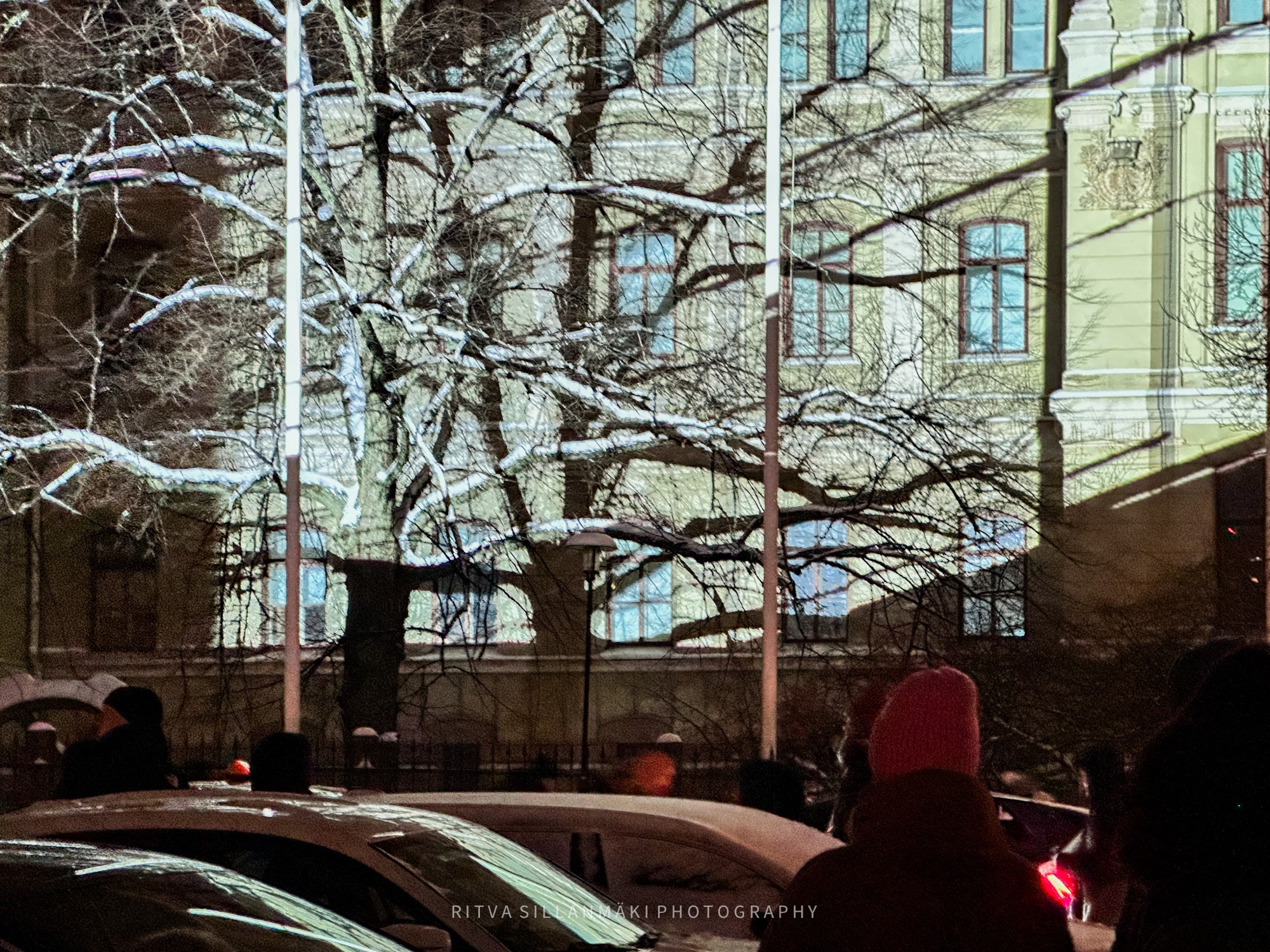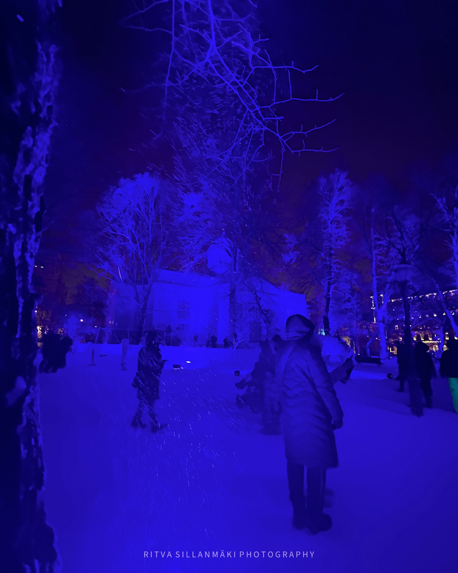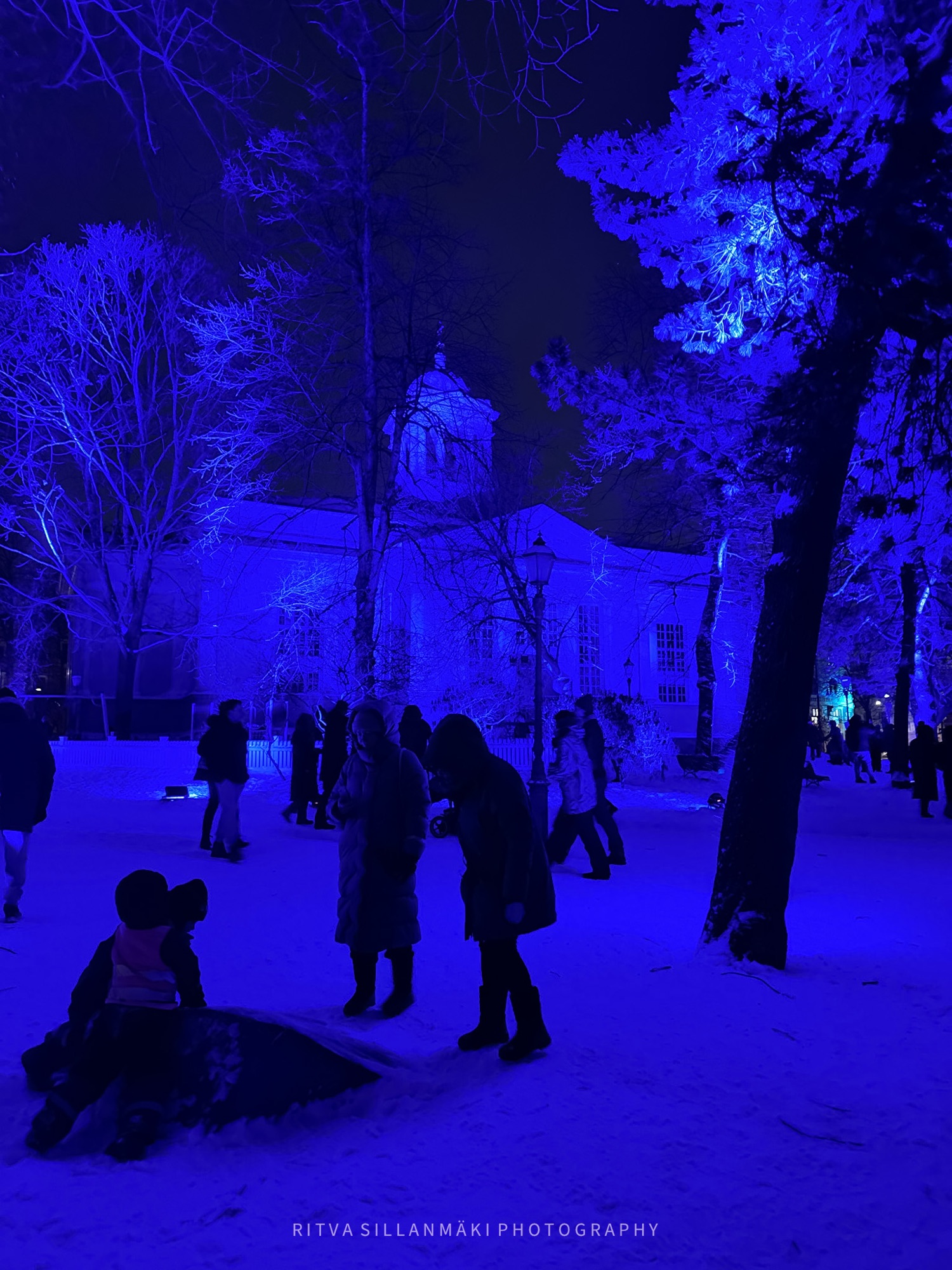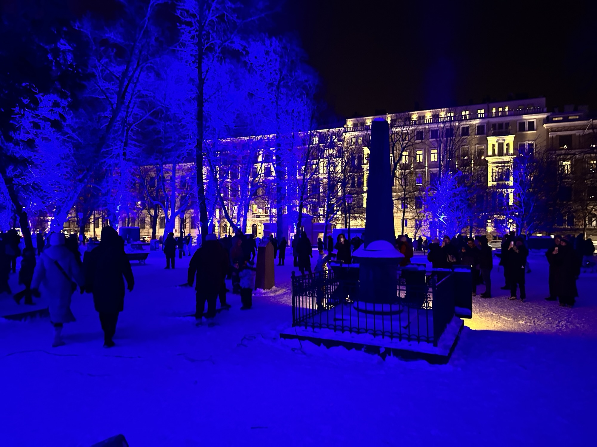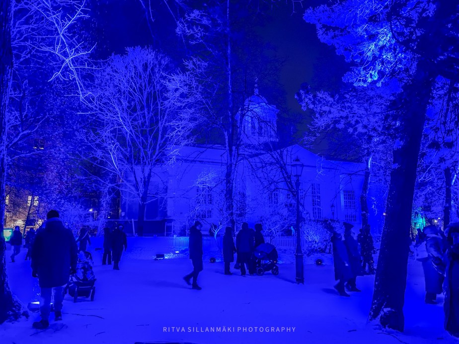 The event featured colorful light displays, particularly at the eerily beautiful Old Church Park, also known as the “Plague Park” due to its historical significance. The Blue light and snow made the place look a bit eerie. It is also known as the “Plague Park” (Ruttopuisto), as victims of the plague in 1710 were buried alongside the church. The gravestones in the Old Church Park remind of the history of cemeteries in this part of town. The park is home to the second oldest church in Helsinki and remains a popular destination within the city center, blending art and history.
