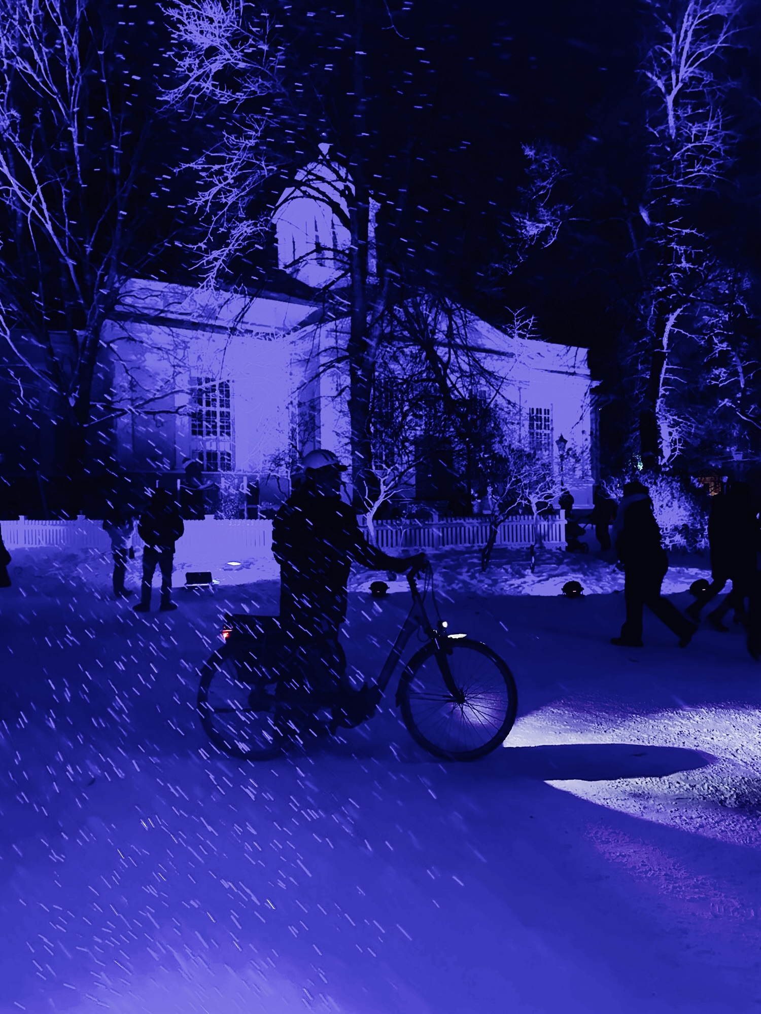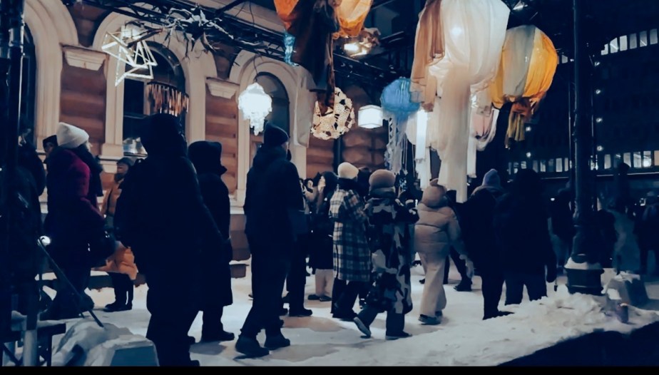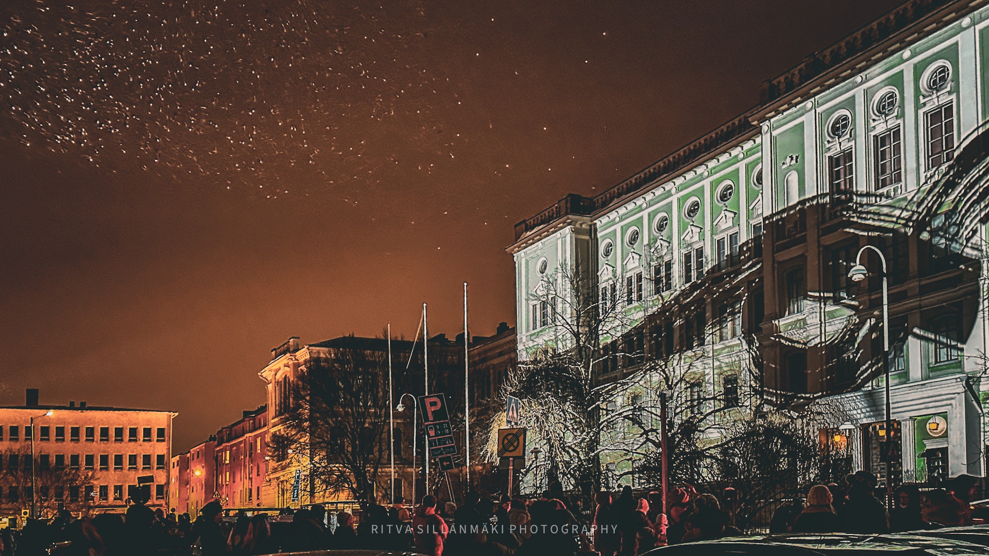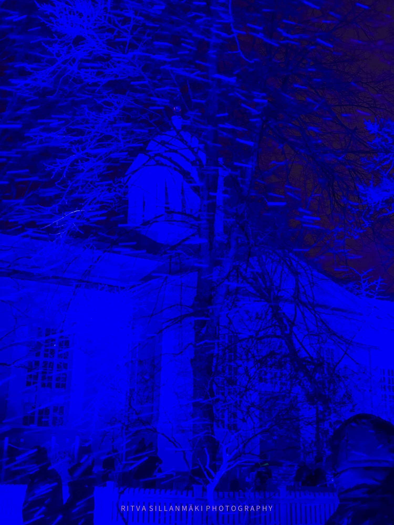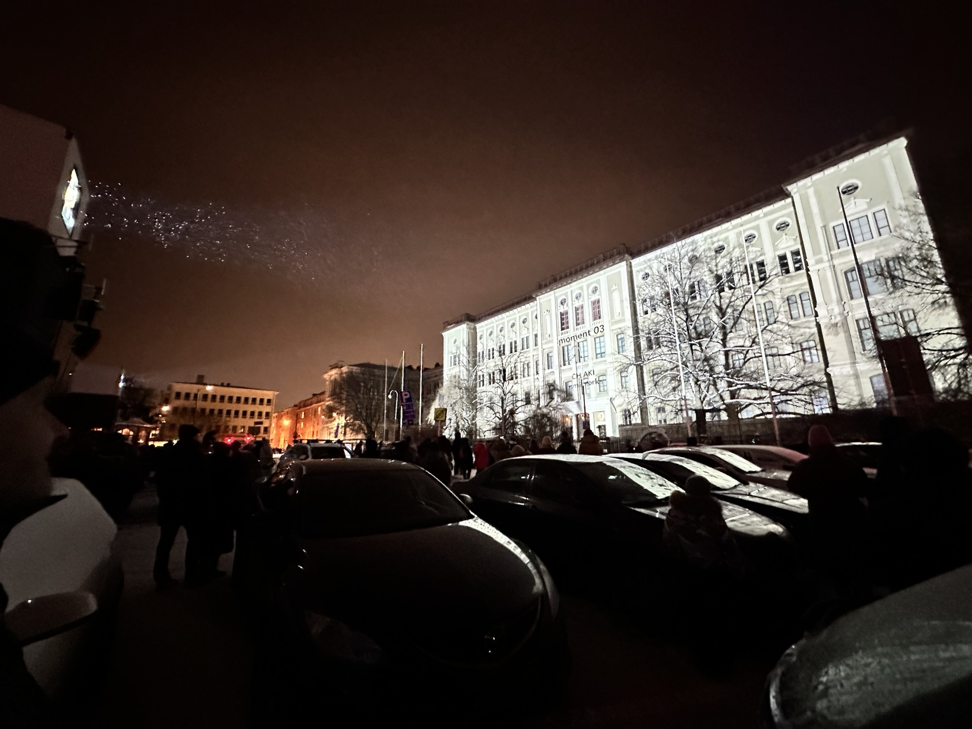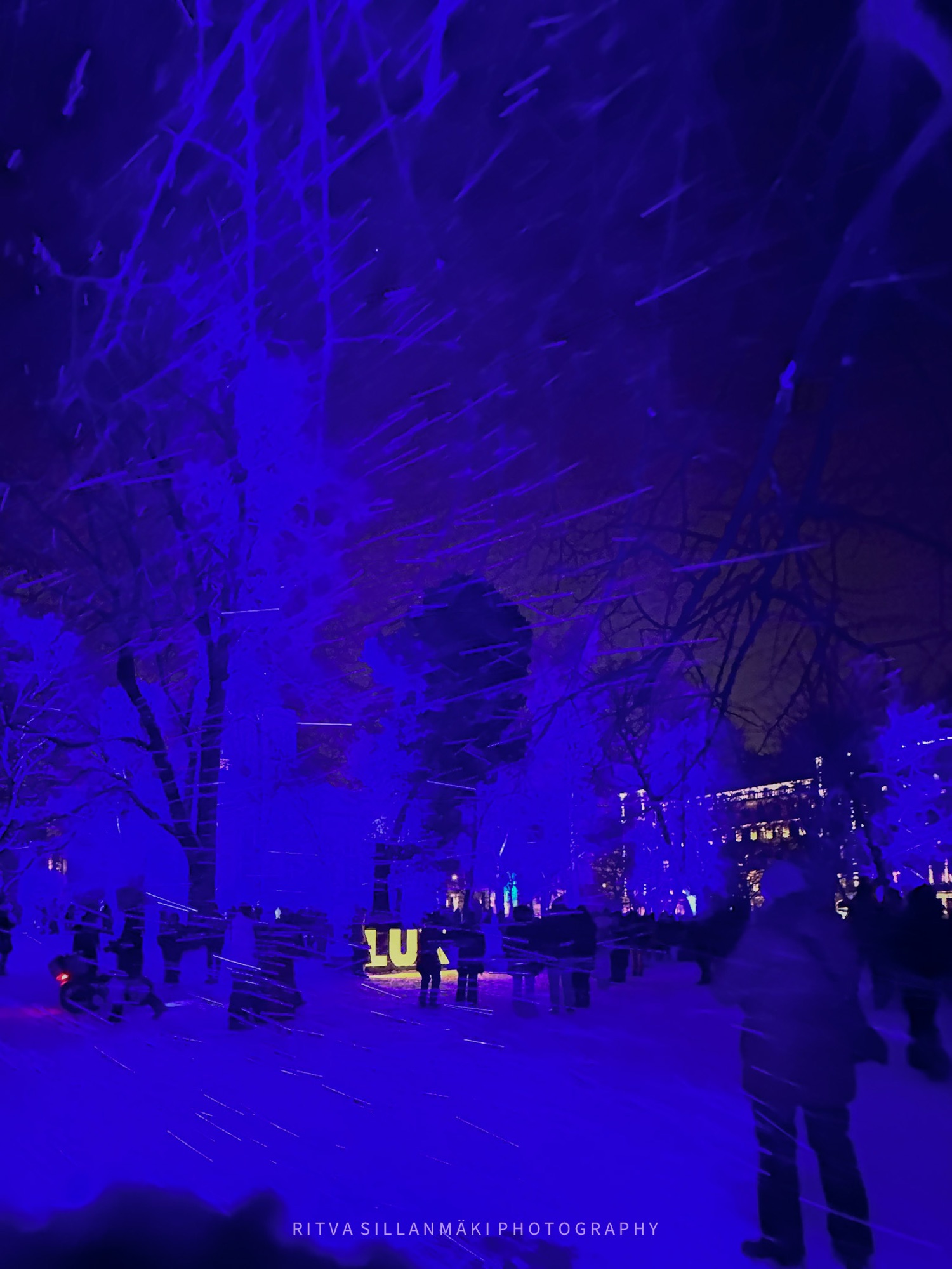 The event featured colorful light displays, particularly at the eerily beautiful Old Church Park, also known as the “Plague Park” due to its historical significance. The Blue light and snow made the place look a bit eerie. It is also known as the “Plague Park” (Ruttopuisto), as victims of the plague in 1710 were buried alongside the church. The gravestones in the Old Church Park remind of the history of cemeteries in this part of town. The park is home to the second oldest church in Helsinki and remains a popular destination within the city center, blending art and history.