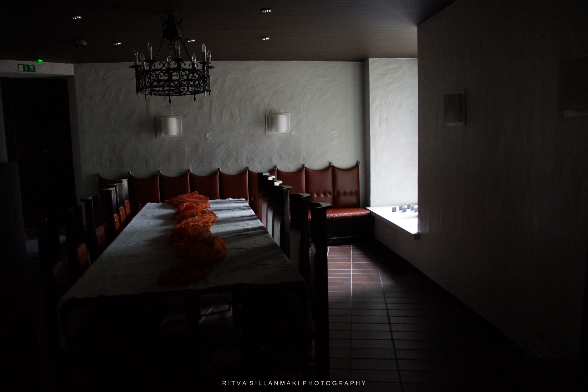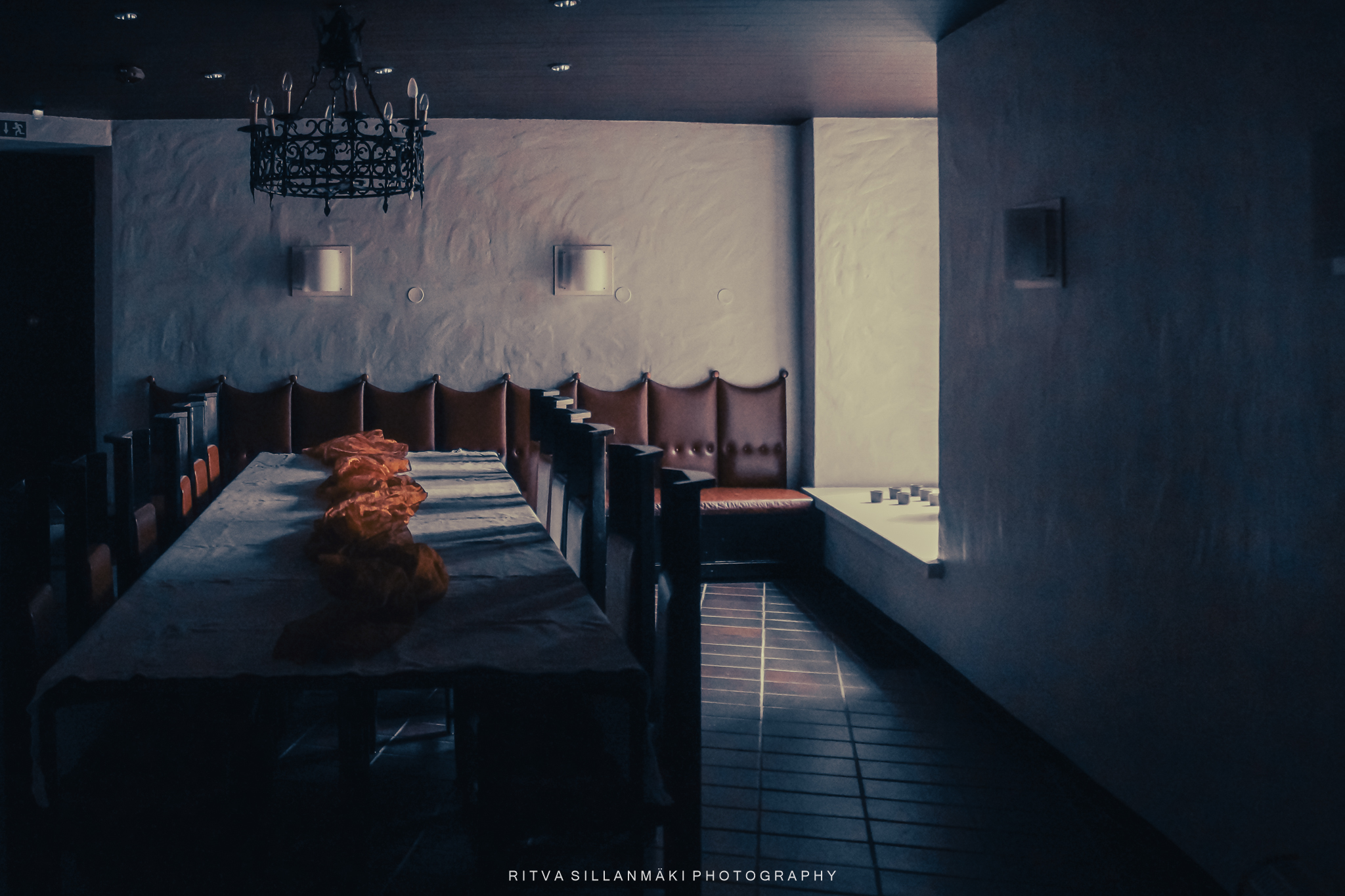 A dimly lit dining room with a long wooden table covered in a white tablecloth, adorned with orange fabric. Red upholstered leather benches line the walls, and a decorative chandelier hangs from the ceiling. In the image above, there is a lot of good, but the picture was left languishing in the archives a bit subdued, and I couldn’t find its purpose; now I decided to boldly edit it in a more cinematic direction. I spent some time battling against making it too colorful, so the third edit is the final result 👇, where I wanted to bring the fabric on the table into focus with light.