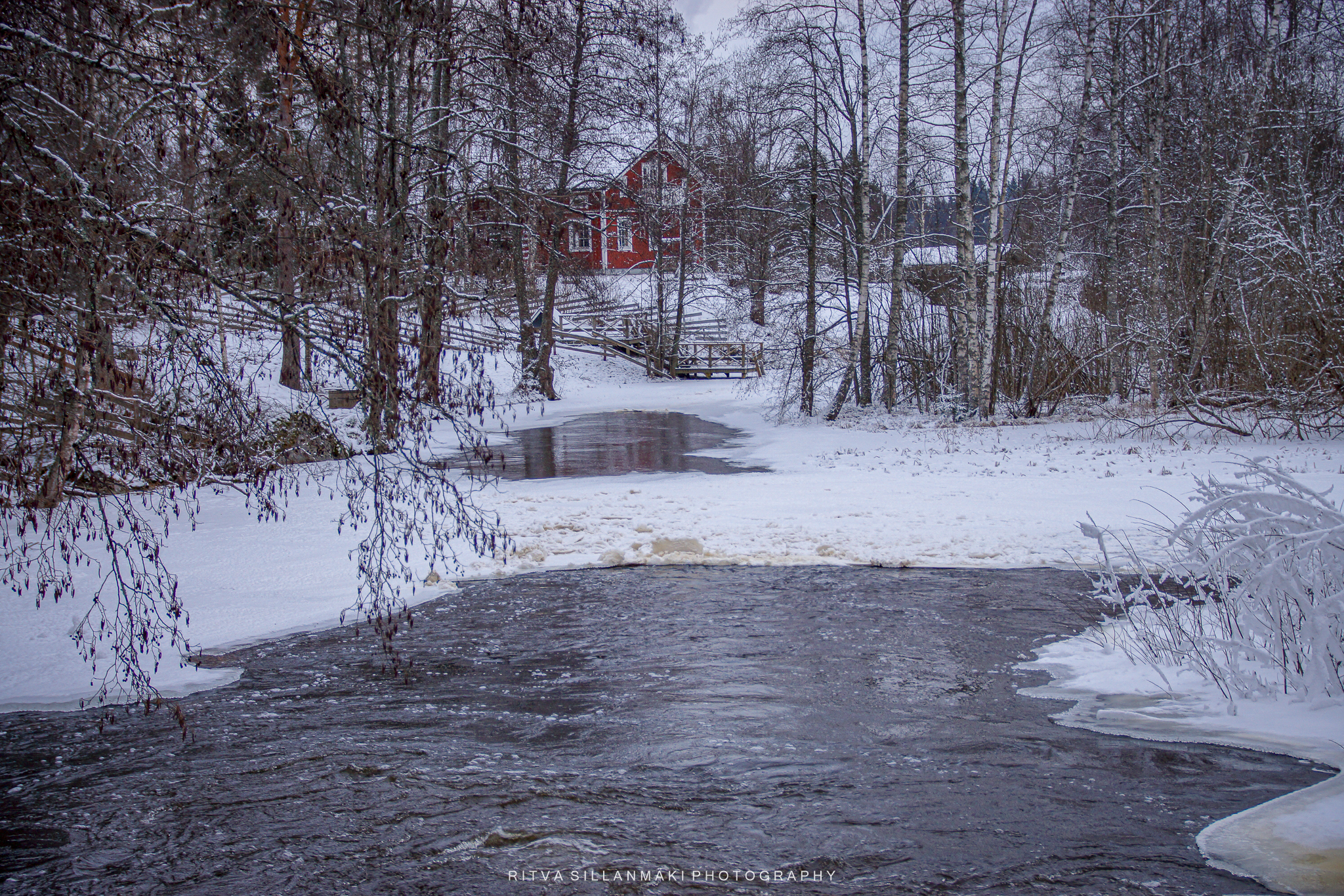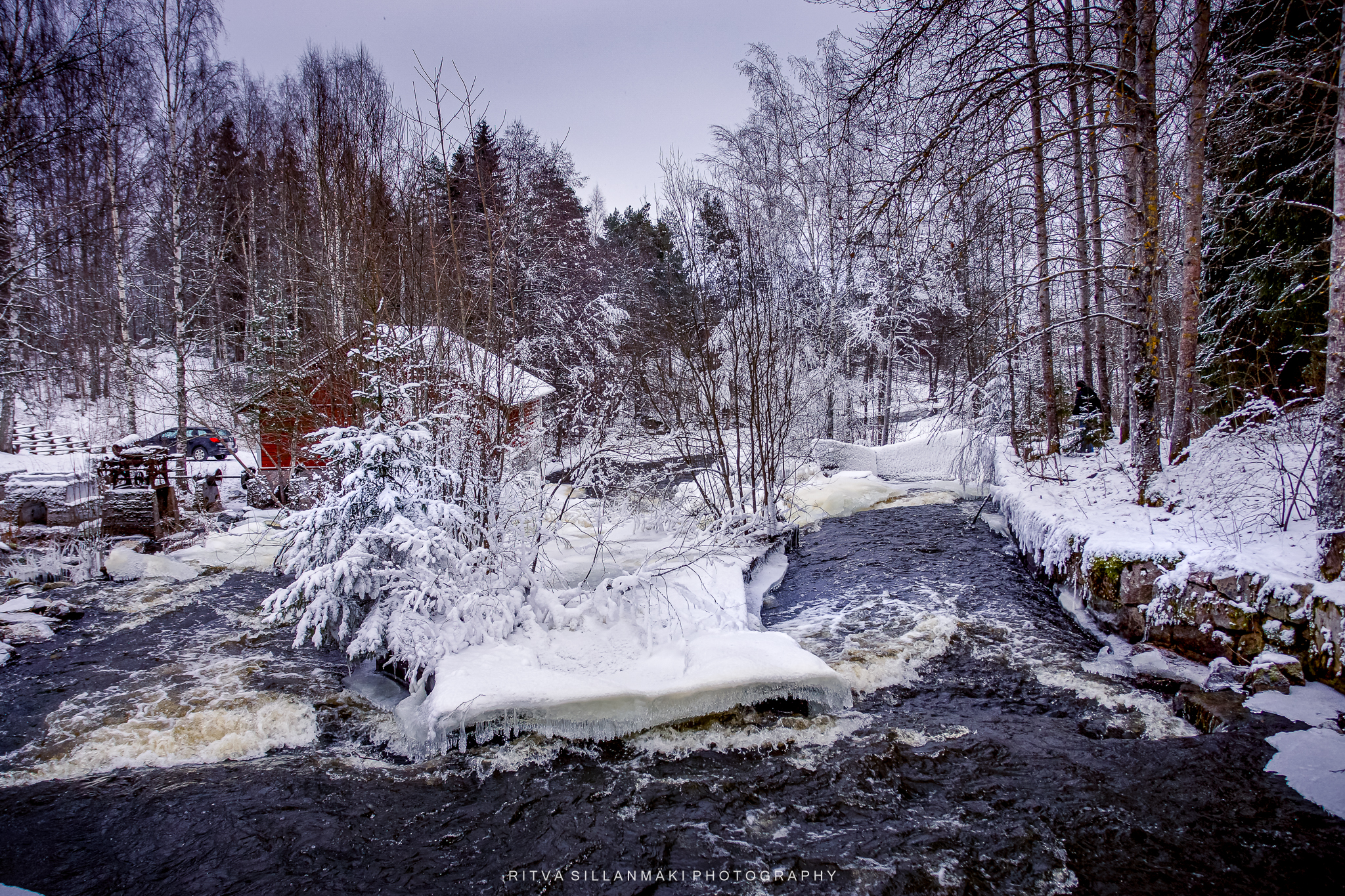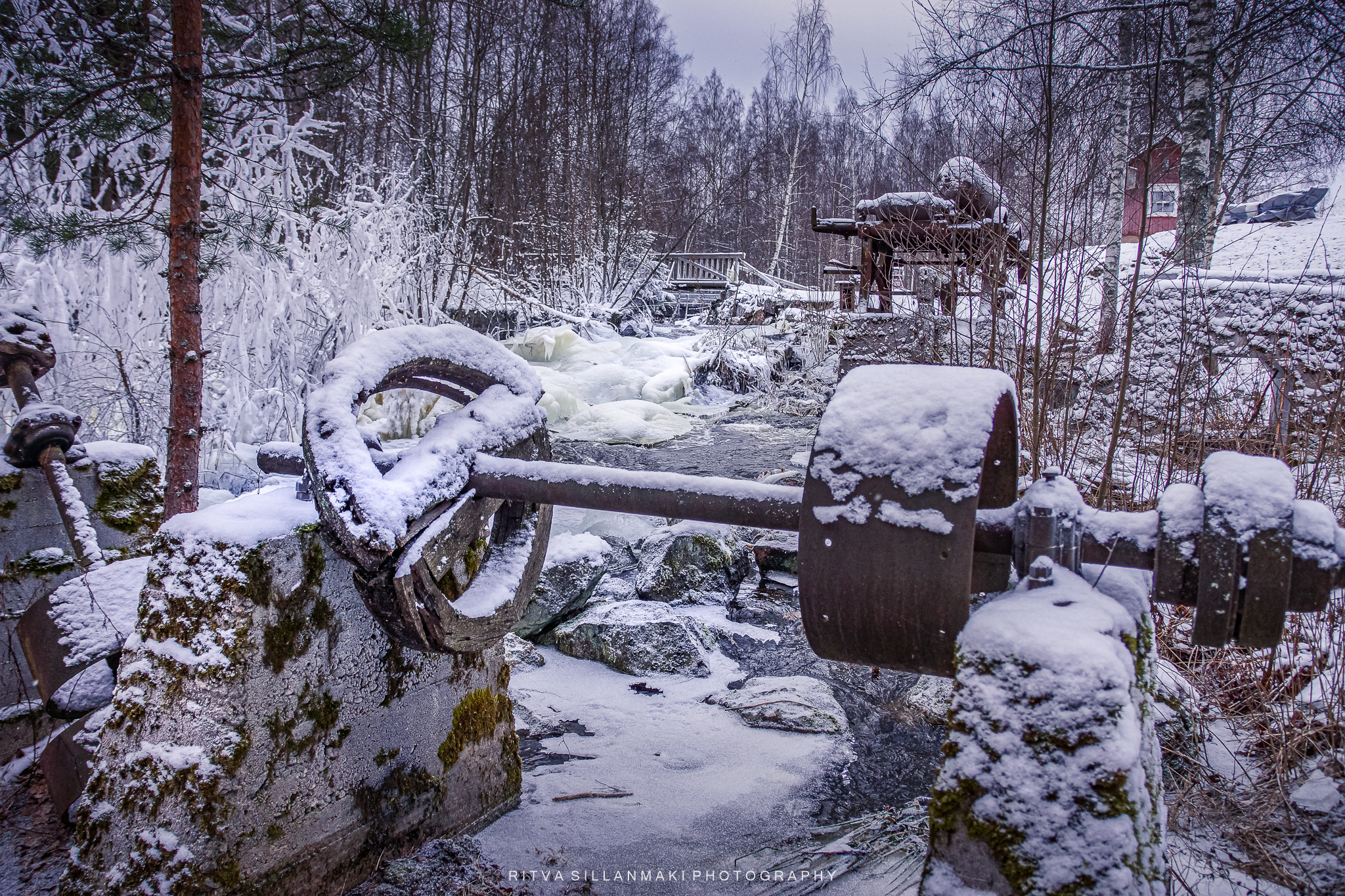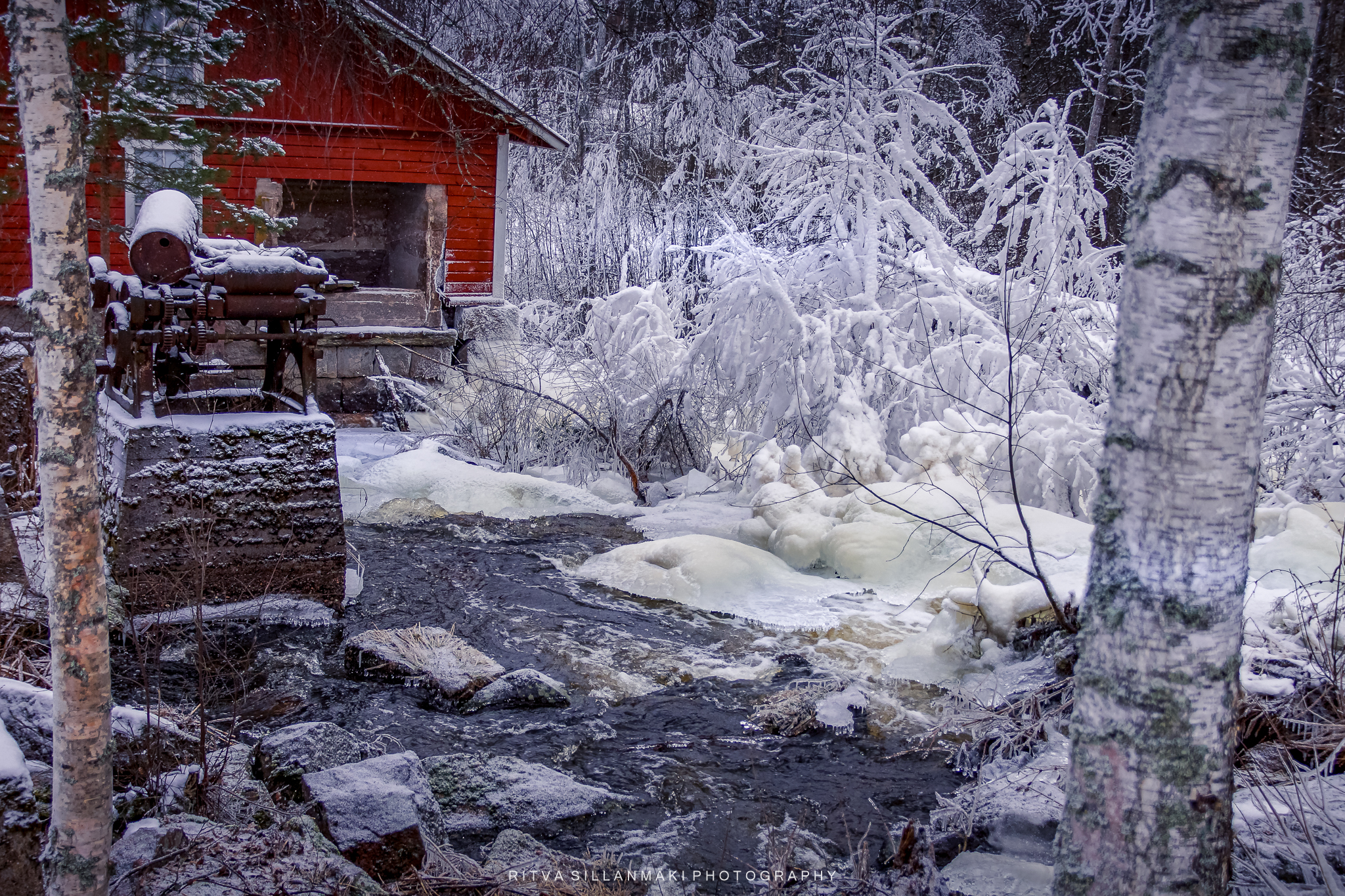 Winter and cold weather make for a nice backdrop for the old red mill in Immilä, Finland