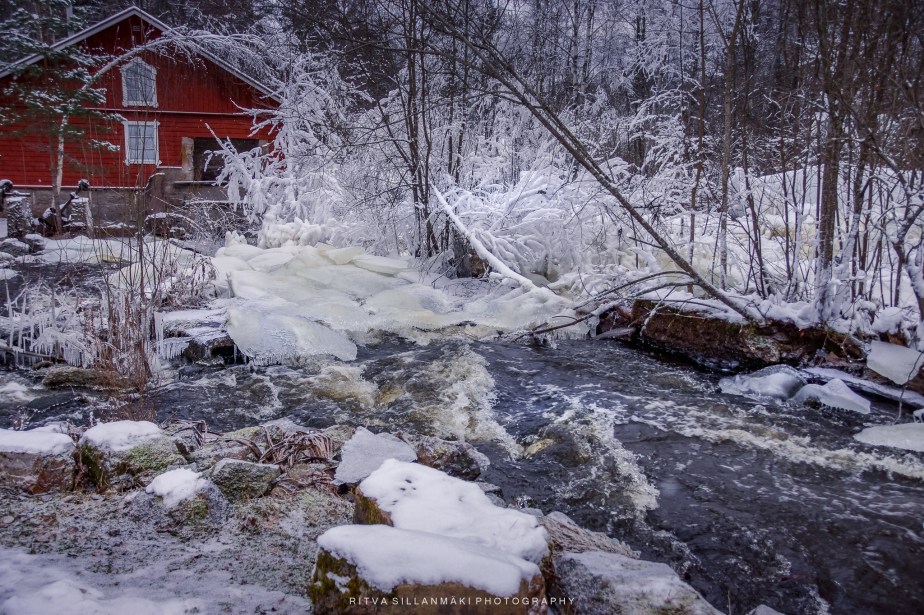 Winter and cold weather make for a nice backdrop for the old red mill in Immilä, Finland