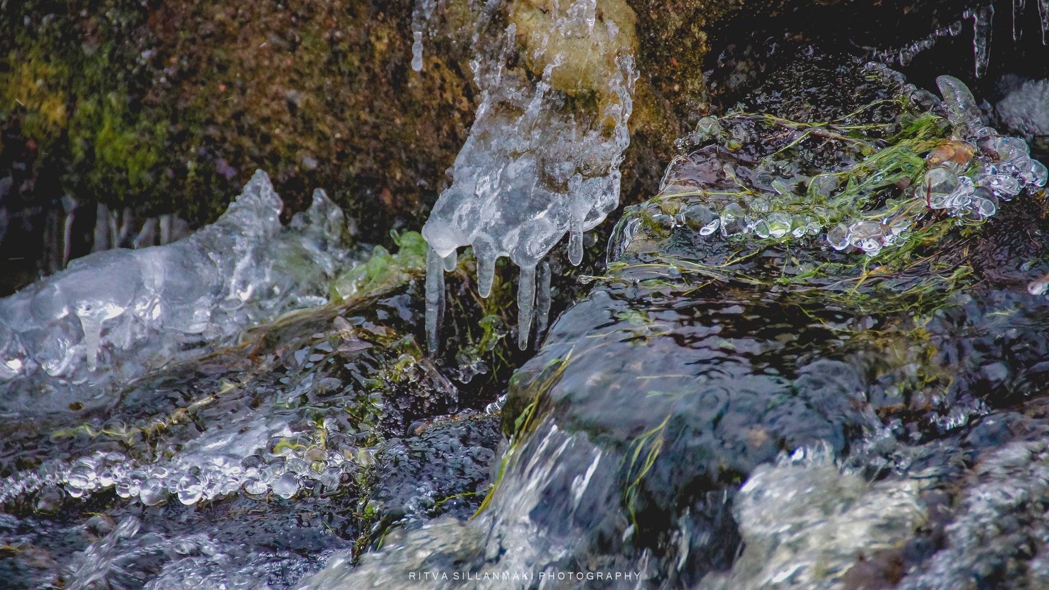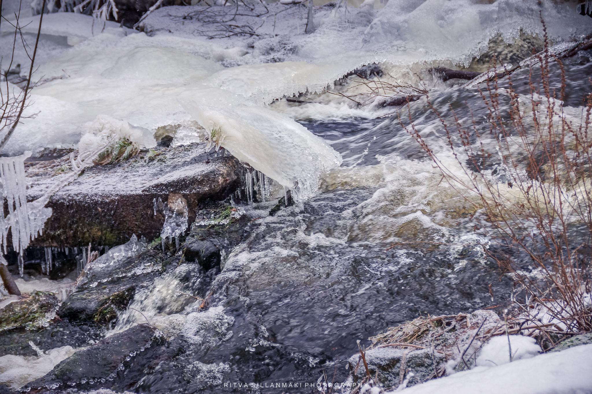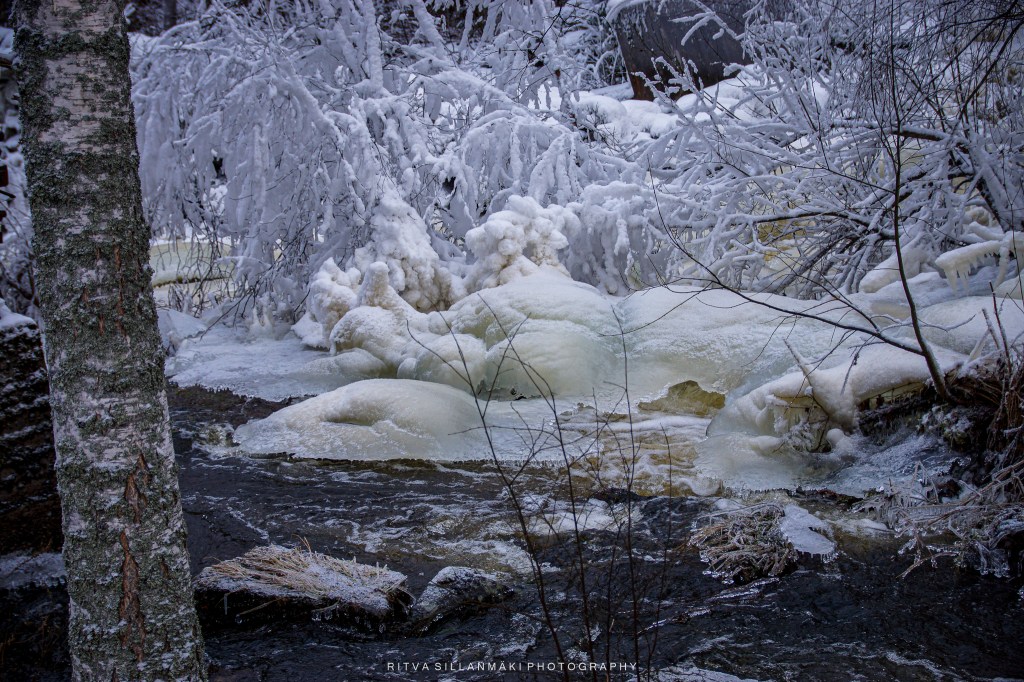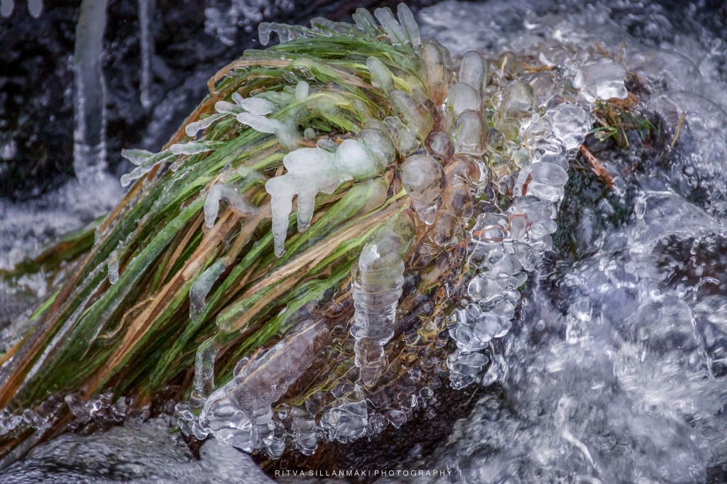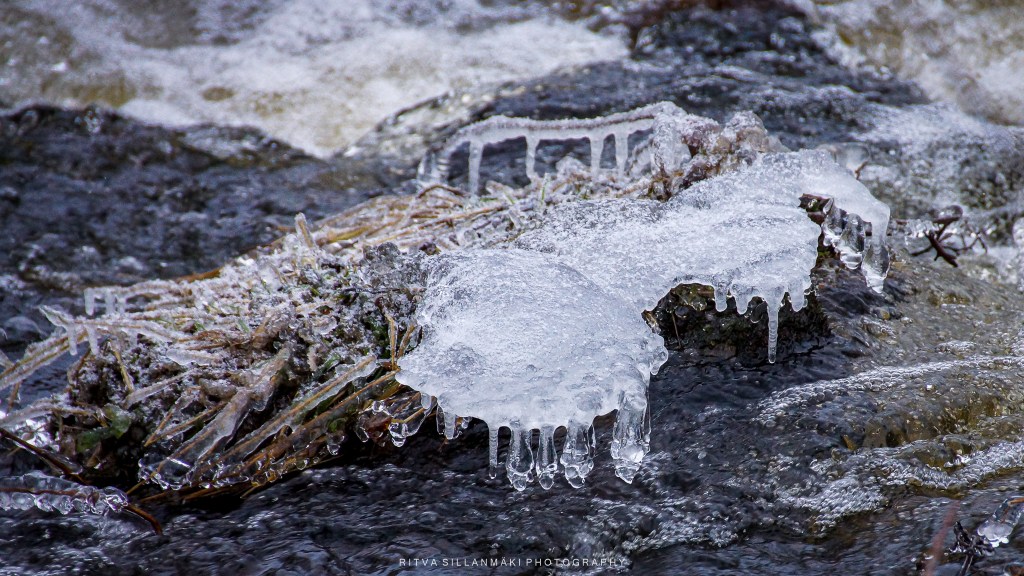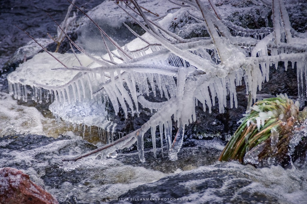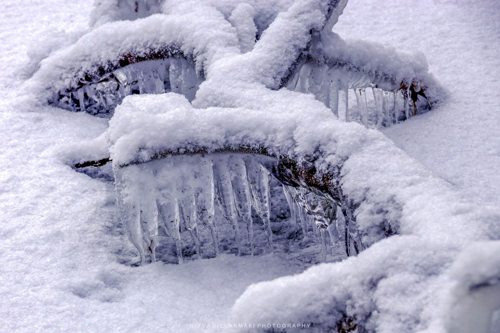 Icicles, resembling the sharp teeth of the season, elegantly hang from branches and rugged rocks, forming a scene that is both picturesque and enchanting, ideal for photography. A blanket of sparkling white snow covers the ground, beneath the soft winter sunlight, while a partially frozen stream winds gently through the landscape. It was quite chilly. The icy stones along the banks provide an artistic element to the surroundings, reflecting the glimmering light as the water flows softly over them. The fragile beauty of frozen grass, embellished with countless shimmering icicles, amplifies the wintry allure, instilling a sense of peace and awe. This breathtaking landscape captures the essence of winter’s beauty; it’s wonderful to take a moment to appreciate the serene, cold elegance crafted by nature.