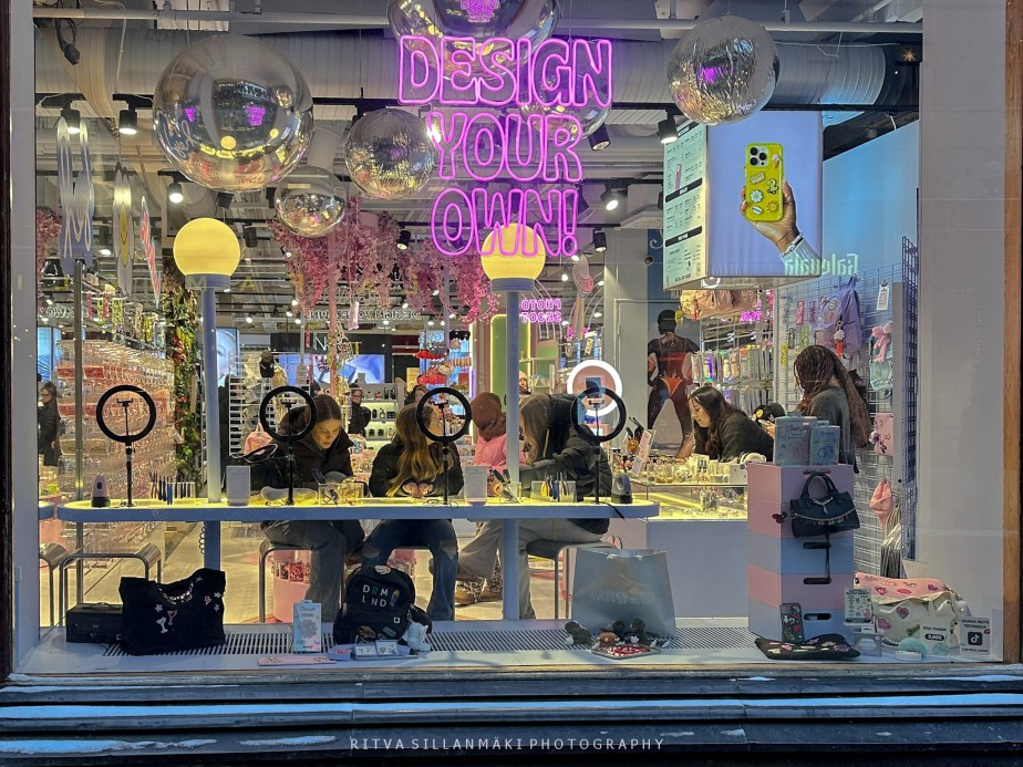 A lively storefront inviting customers to ‘Design Your Own’ personalized accessories, featuring interactive design stations and colorful decor.