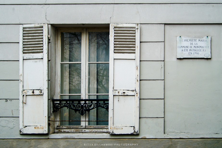 A window from the residence of the first mayor of Montmartre in Paris, accompanied by a memorial plaque.