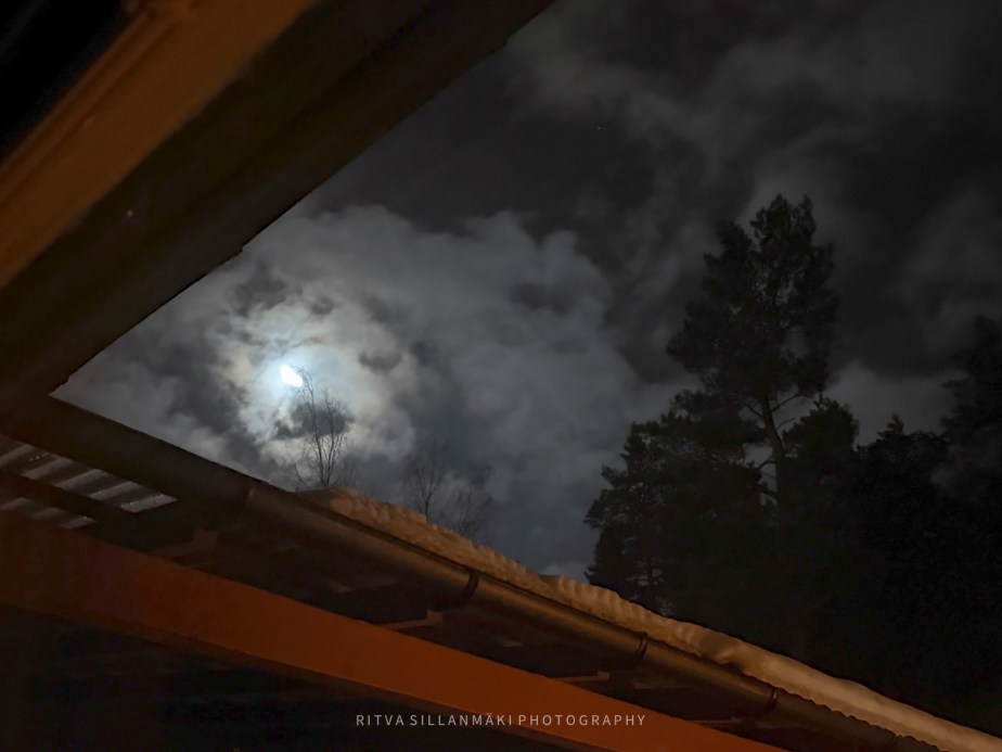 View from my bed of the moon shrouded by clouds, framed by silhouetted trees last night