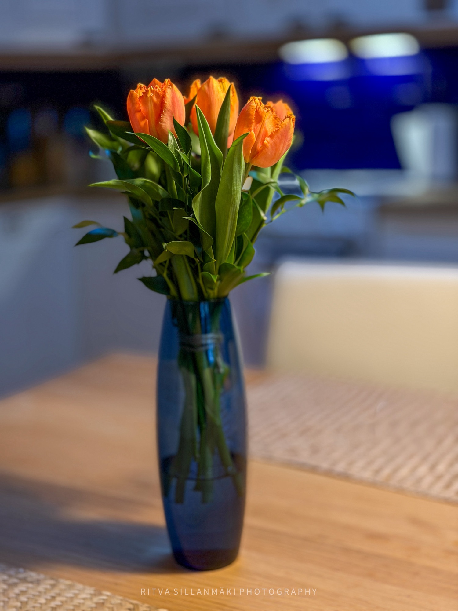 A striking contrast of black and white captures a bouquet of tulips, with the dark background emphasizing their delicate petals and complex textures in the first image in the gallery. The other two monochrome portrayals showcases the arrangement of tulips in a vase, featuring intricate details set against a gently blurred backdrop. Complementing and contrasting this is the radiant bouquet of orange tulips, artfully positioned in a cobalt blue vase atop a wooden table, exuding vibrancy and charm.