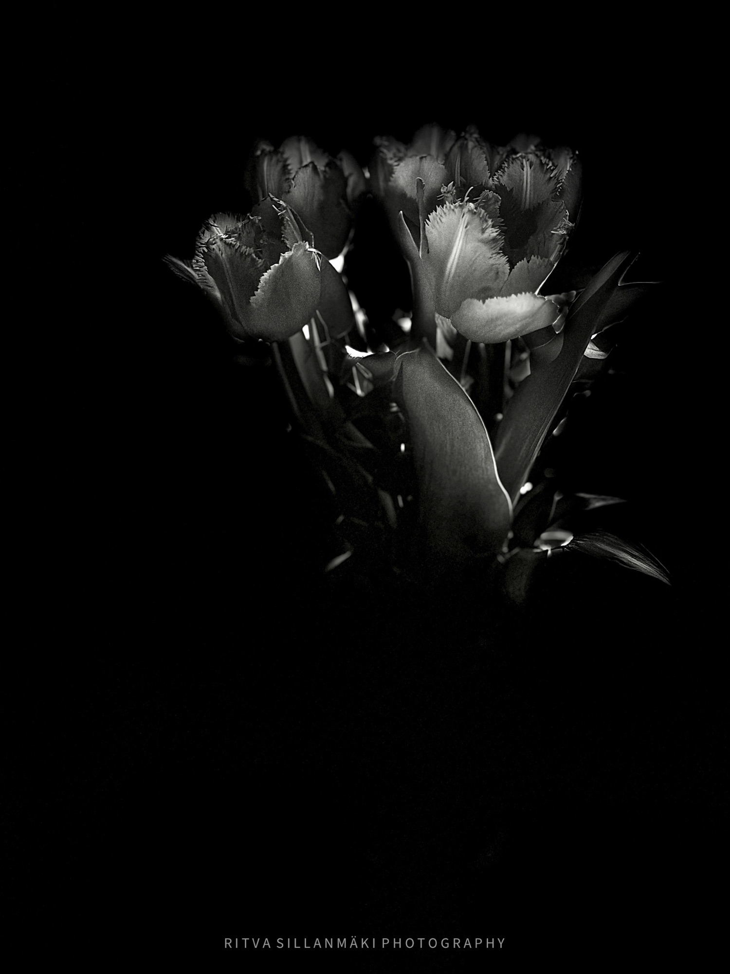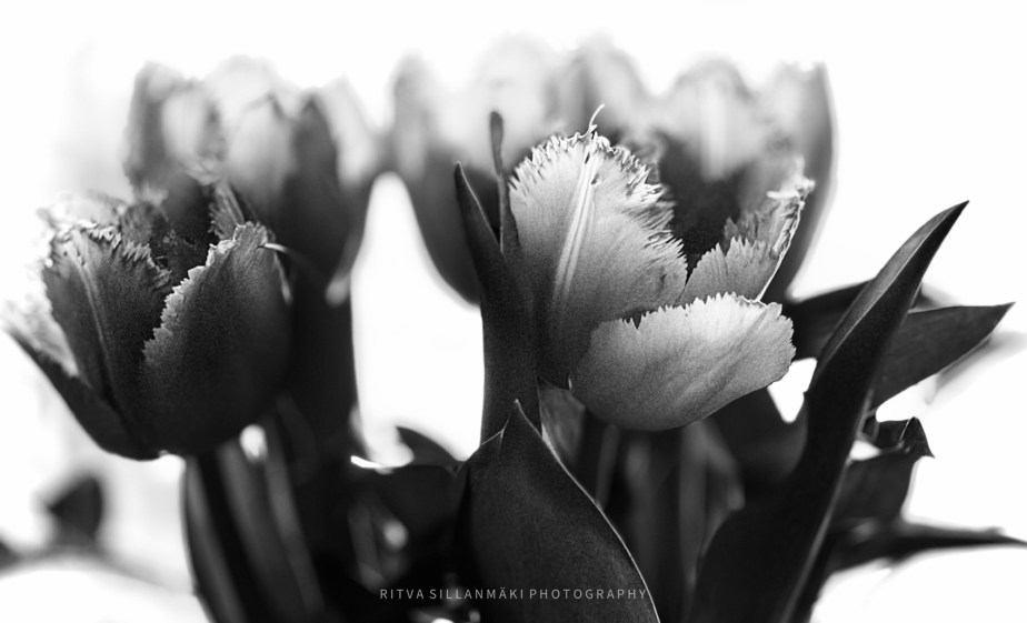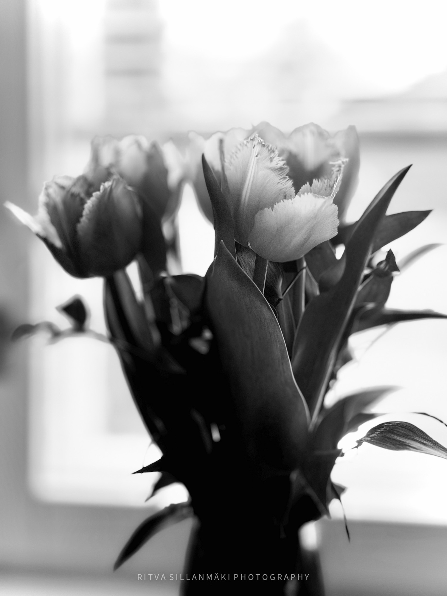 Monochrome Madness is giving us a free week, which means no specific prompt this time around—so much easier to choose the topic. I thought it would be lovely to post flowers, so this week I’m excited to share some gorgeous tulips that a dear friend gave me. I snapped these beauties against the window, using backlight to really capture the details of the petals in the monochrome images. Plus, since I’m also sharing this with TheFlowerHour, I’ve included some colorful images too, taken in light coming mostly from the side above. Just wait until you see the lovely orange shade!