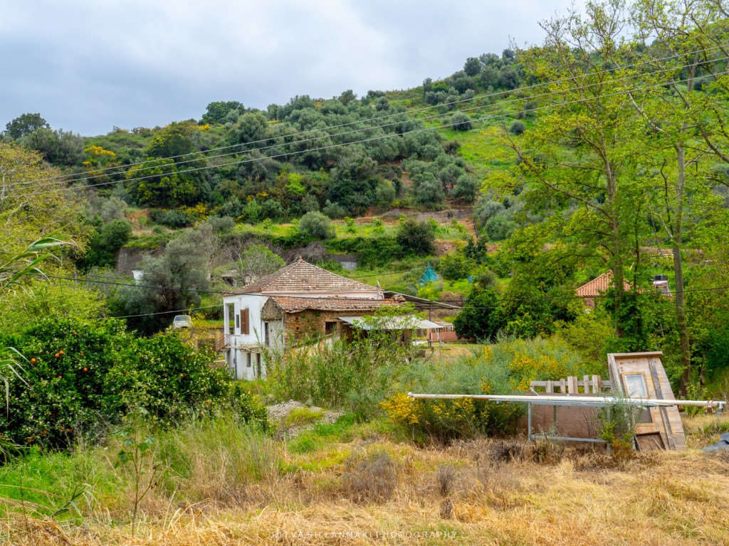 This rural Crete landscape features a quaint, rustic house with a tiled roof and white walls nestled amidst abundant greenery. Surrounding the house are various trees, bushes, and patches of wild grass, including some orange trees bearing fruit. Beyond the house, a hillside covered with dense, lush vegetation and scattered bushes rises gently under a cloudy sky, creating a peaceful and natural atmosphere. The muted, overcast lighting highlights the vibrant greens and earth tones, emphasizing the tranquil countryside setting.