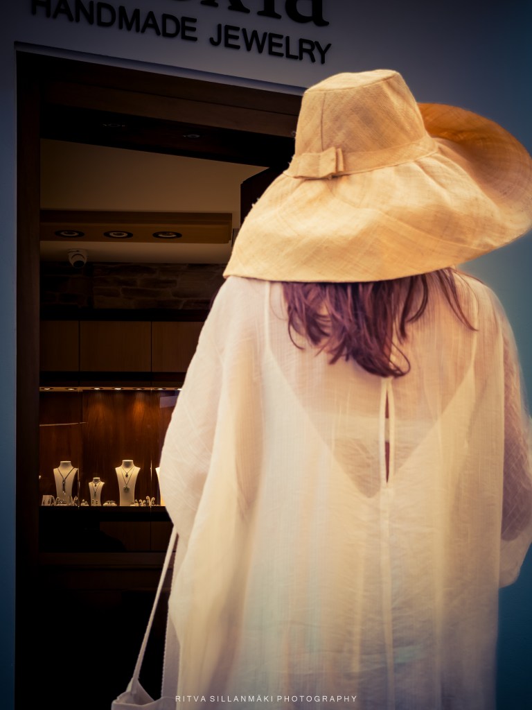 A very stylish woman. She is dressed in a flowing white outerwear and wears a wide-brimmed hat and dark sunglasses, exuding a relaxed, summery vibe. The cobblestone street and soft, diffused lighting create a quaint, charming atmosphere, suggesting a leisurely day spent exploring a picturesque Chania CityA woman from behind as she stands in front of a handmade jewelry store. She wears a large, wide-brimmed beige sunhat and a light, semi-transparent blouse that flows gently, with her brown hair visible underneath the hat. The store’s entrance is dimly lit with warm tones, showcasing several jewelry displays featuring necklaces on white busts. The focus that emphasizes the textures of the woman’s attire and the handmade fashionable jewellery
