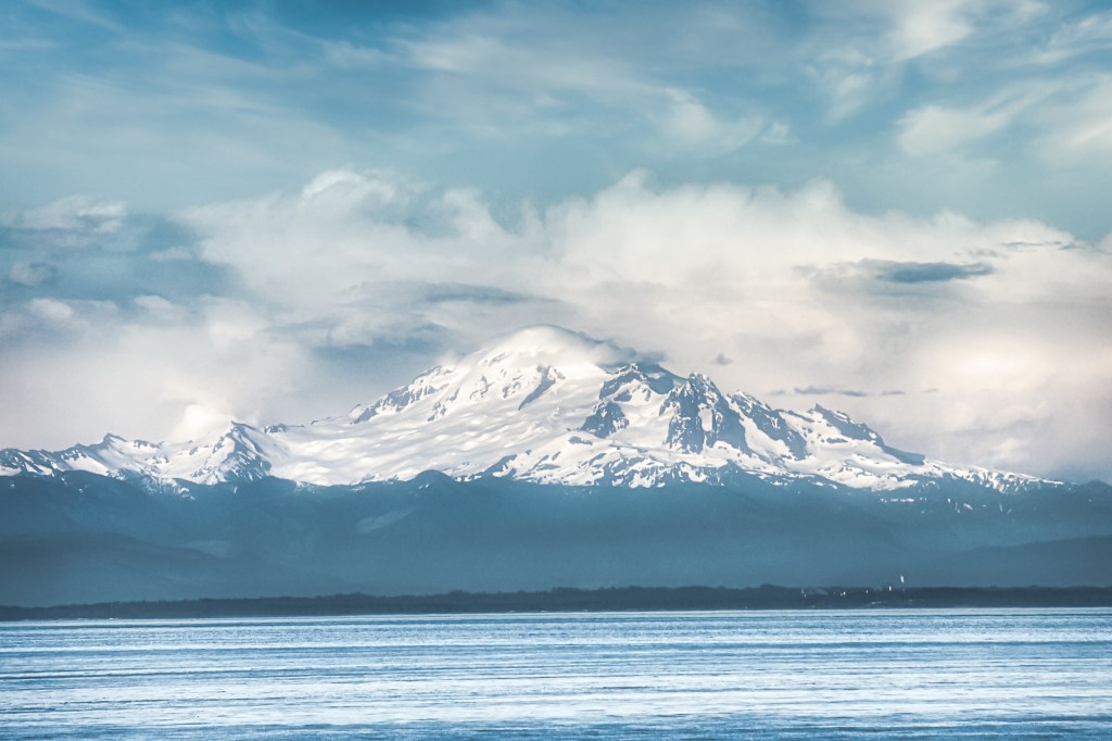 I took this few years back when I visited my sister in Fort Langley, B.C. my nephew took me on trip to Vancouver island, I took this photo of Mount Baker on the ferry on our way back to Vancouver. The snow covered mountains look so lovely with the clouds hanging over the top.