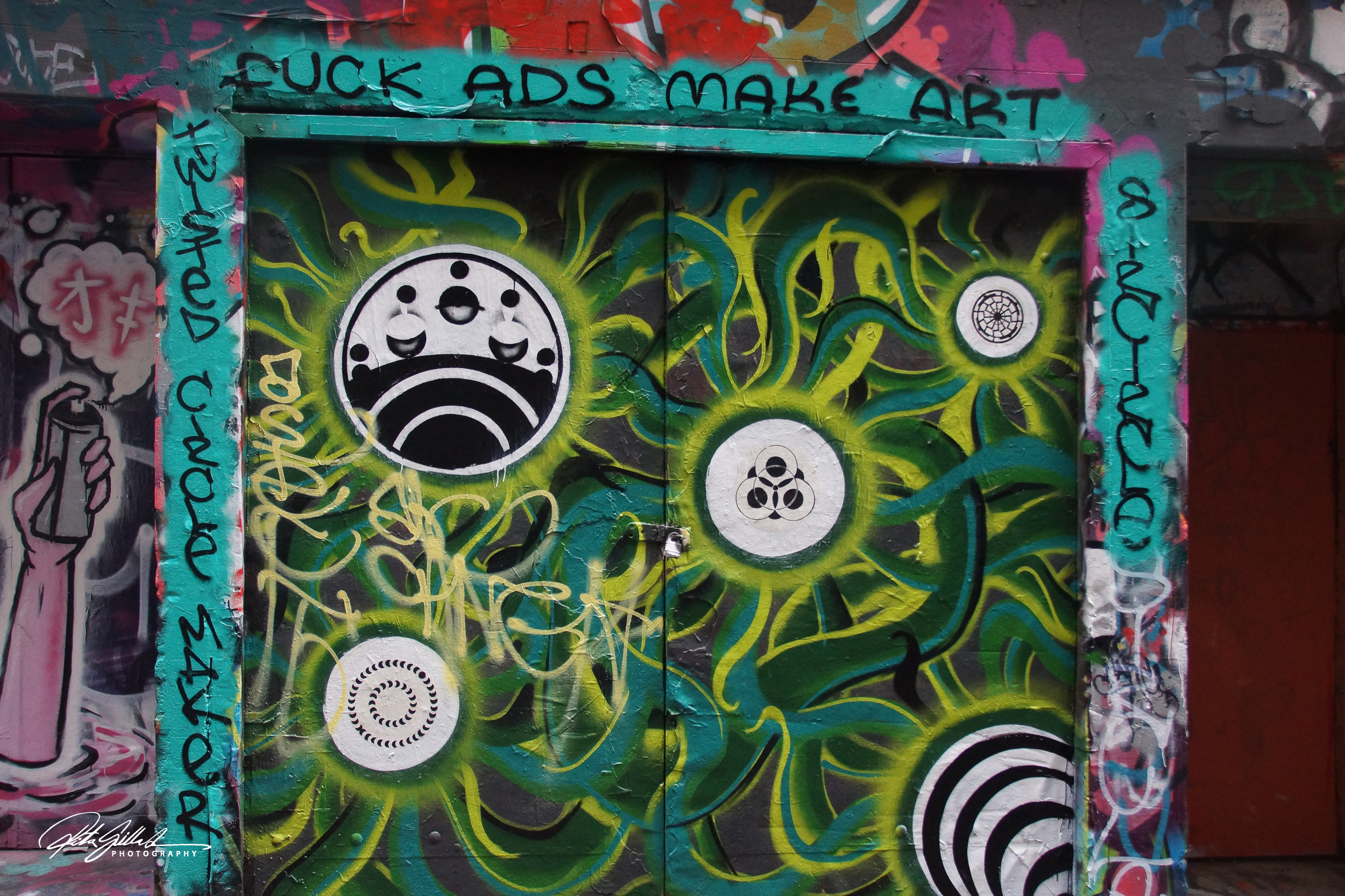 Lose yourself in a wonderland of colourful street art,. Here are some of the street art found in laneways dotted around Melbourne, these ones are on painted on doors .
