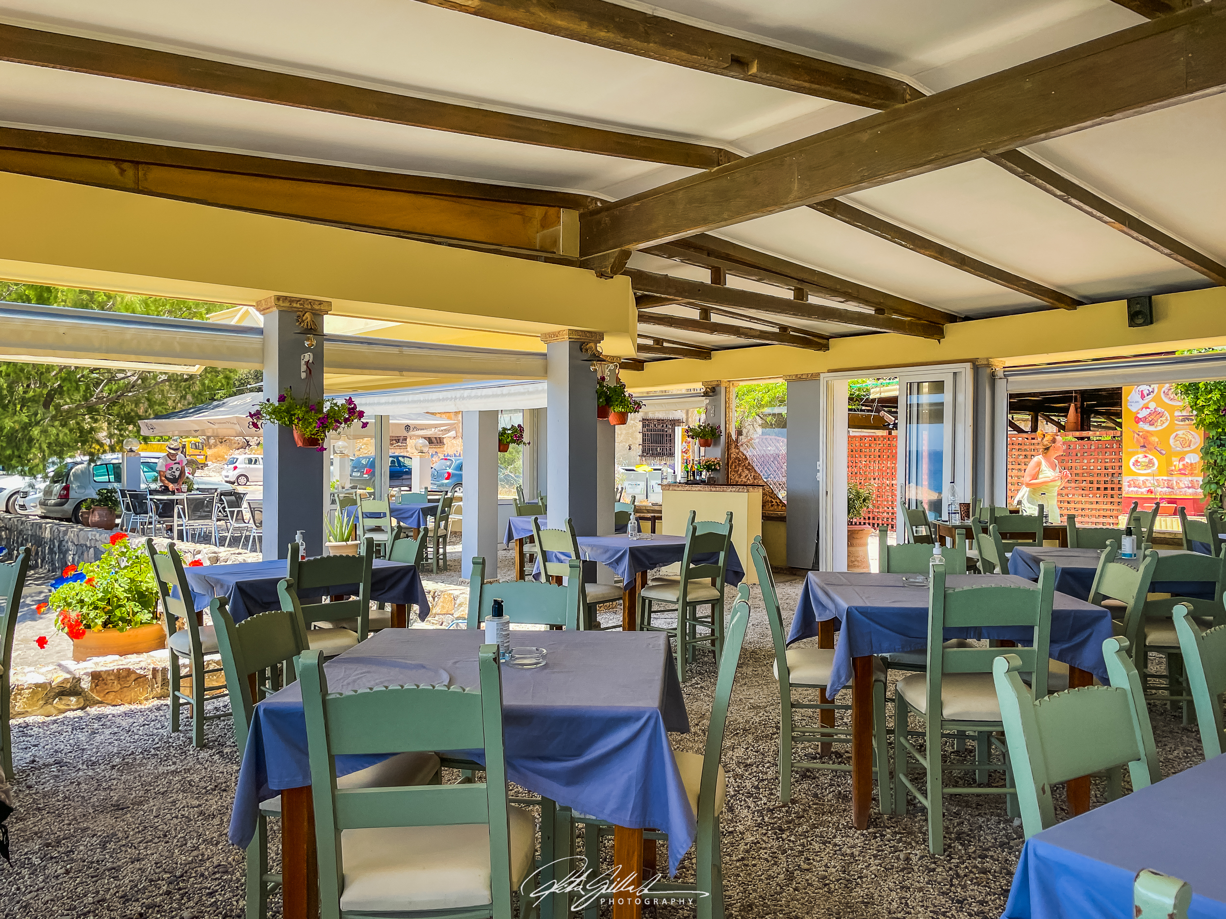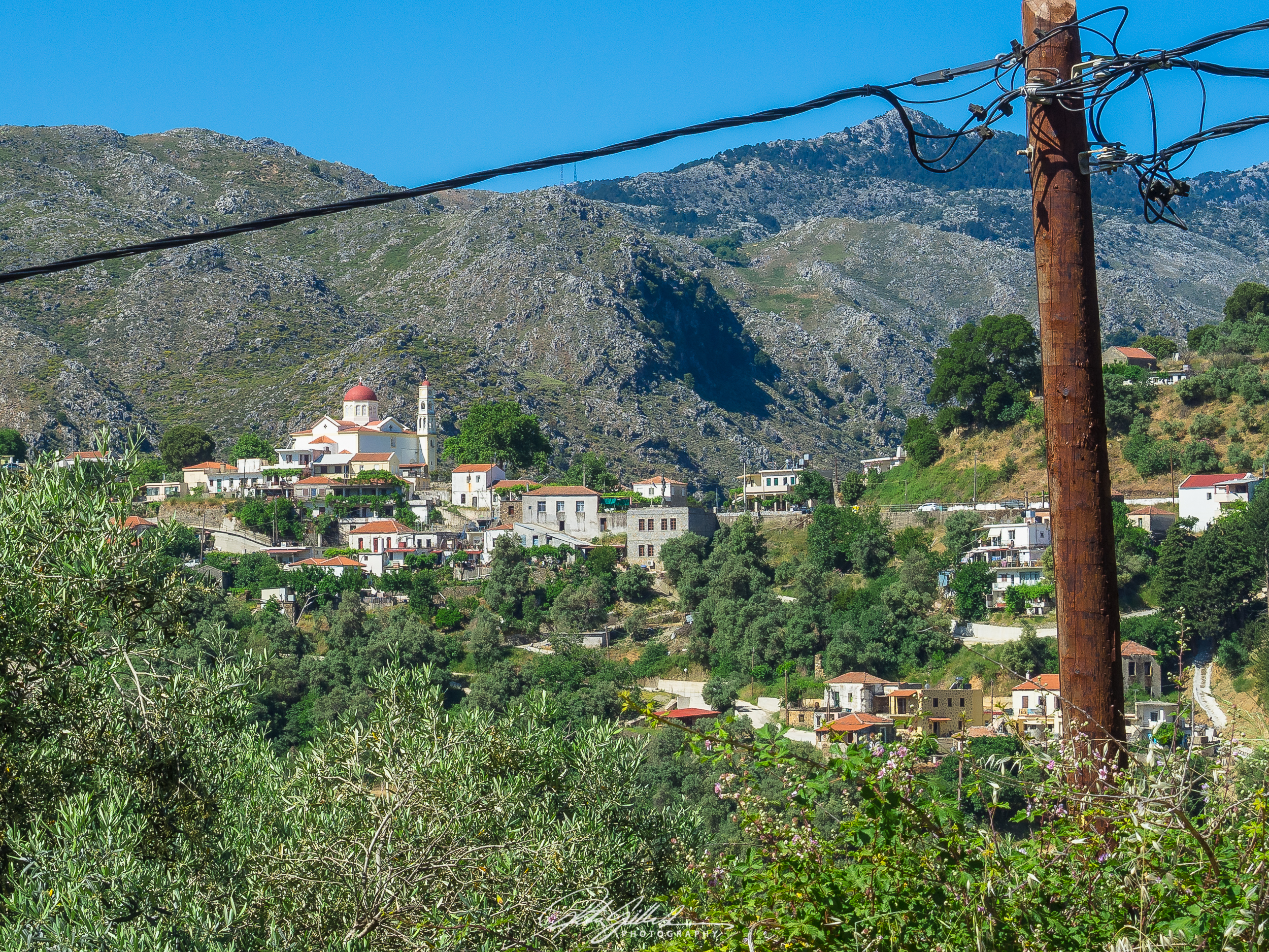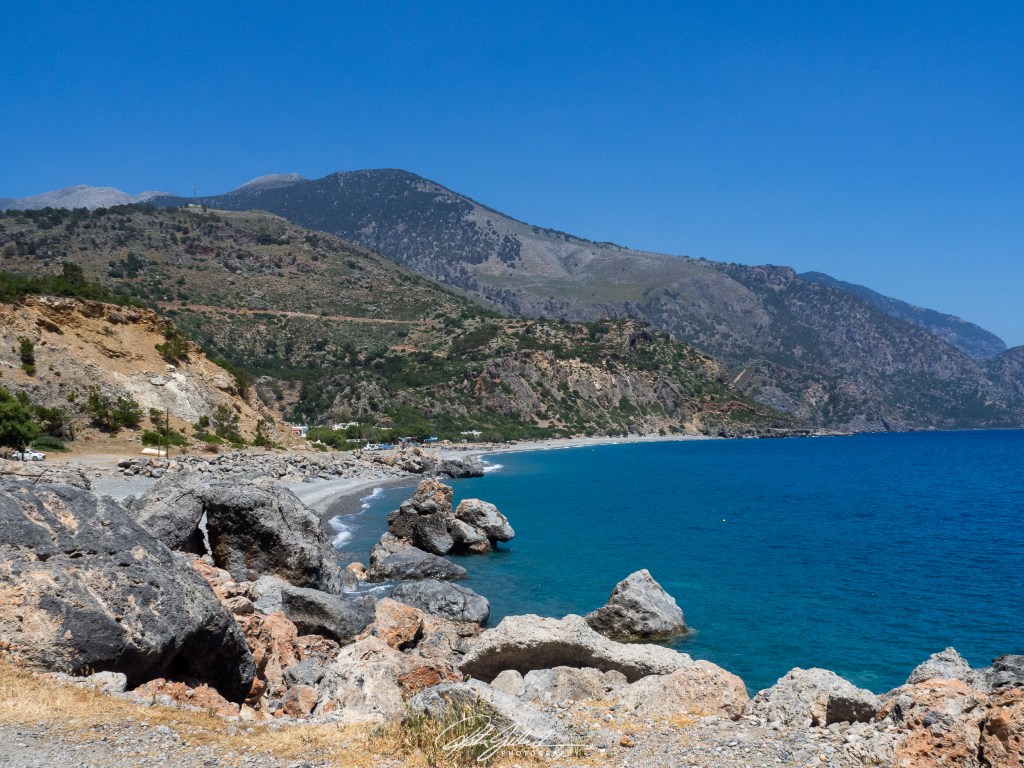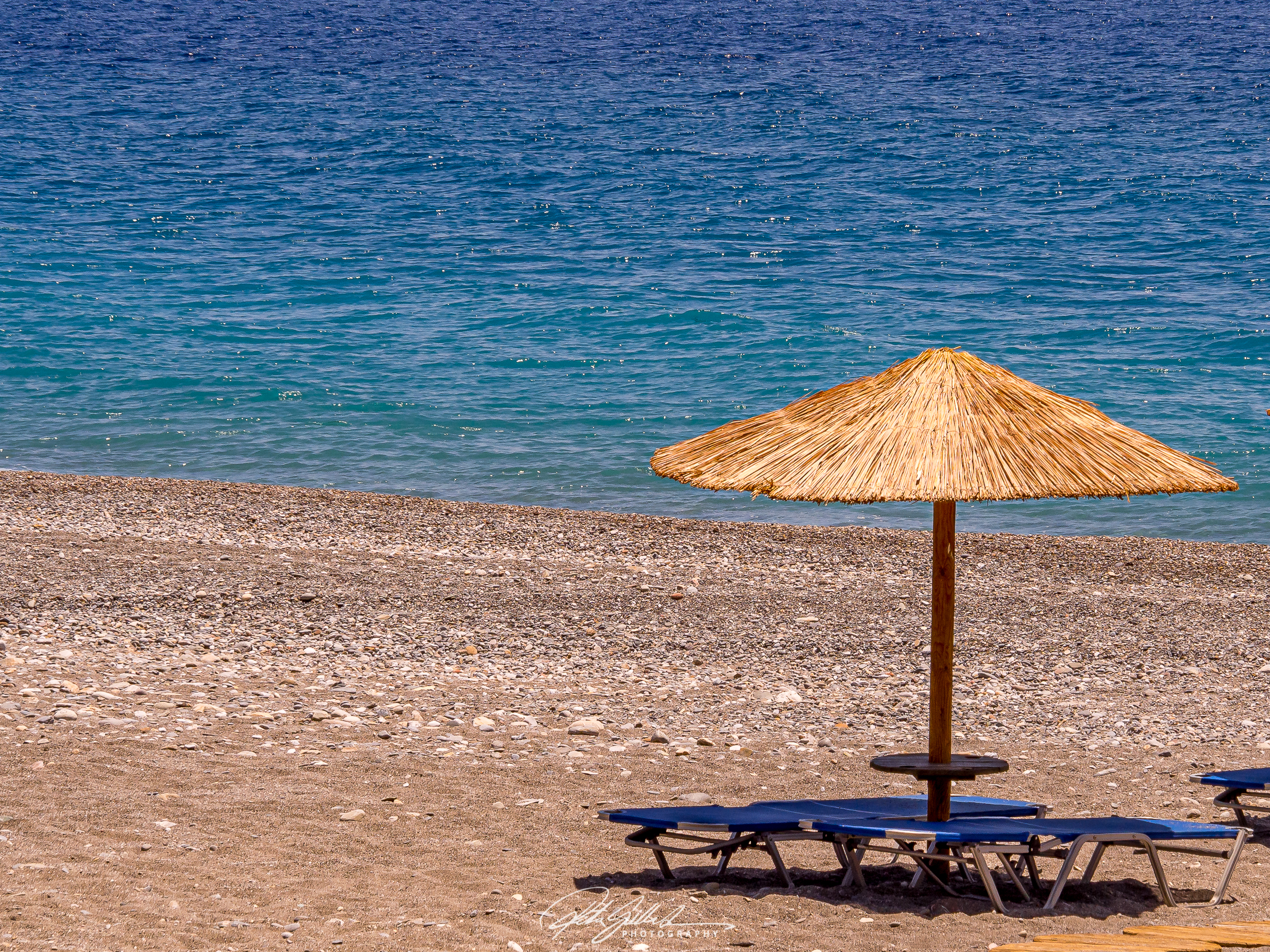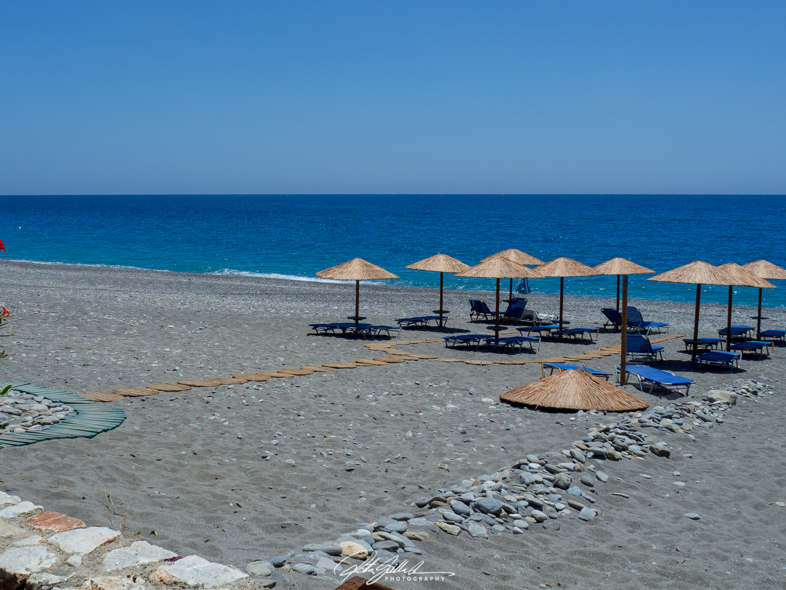 The place itself is hardly worth a mention but the beach, the Bay of Stavros, is a bathing paradise for swimming. The fine sand slopes gently to the sea and the bay is protected here from strong waves by a small promontory. There is not a lot of shade… unless you hire an umbrella and beach chair. Lying on the beach there is always something different to focus on when viewing the mountains opposite.
