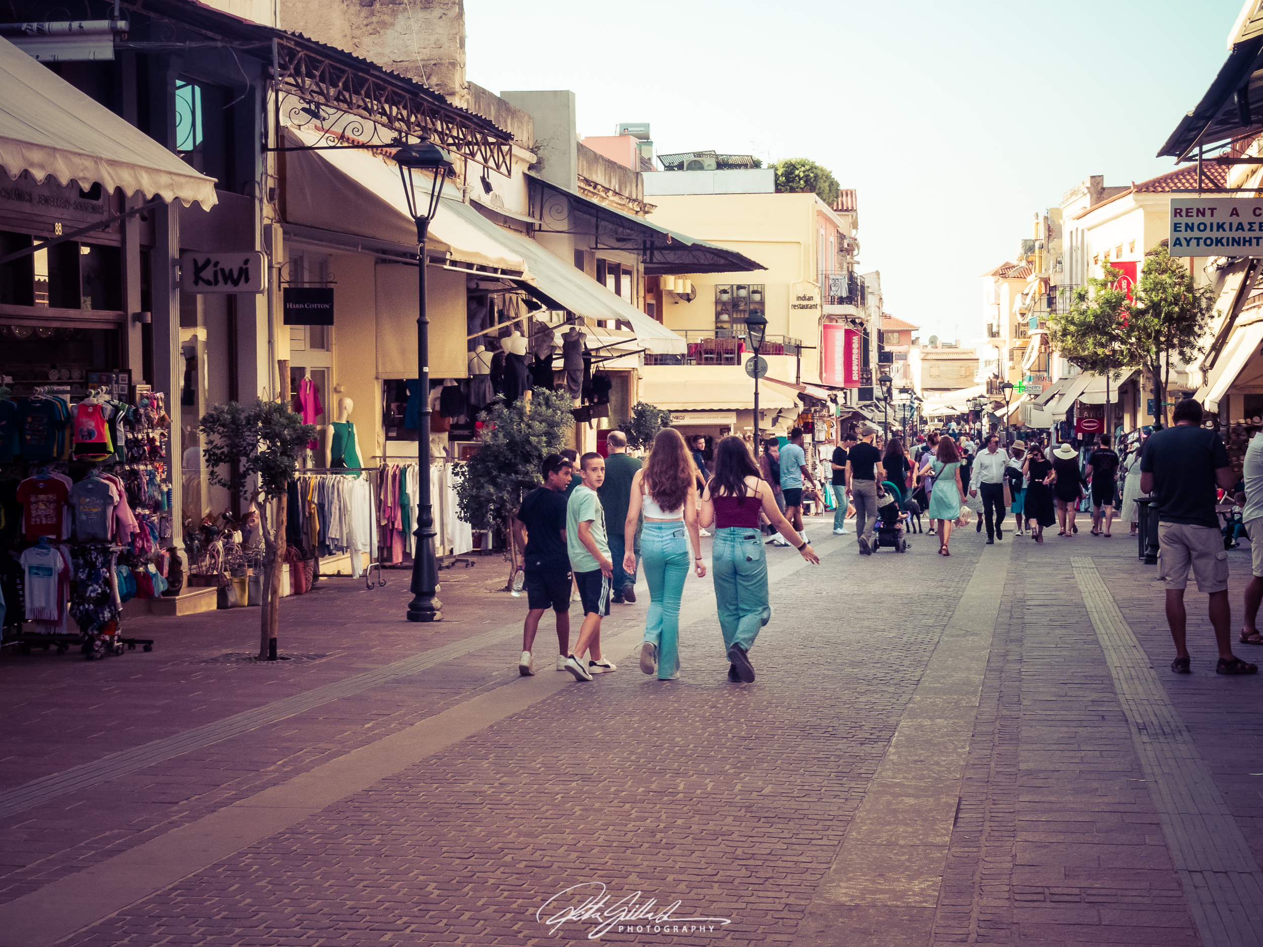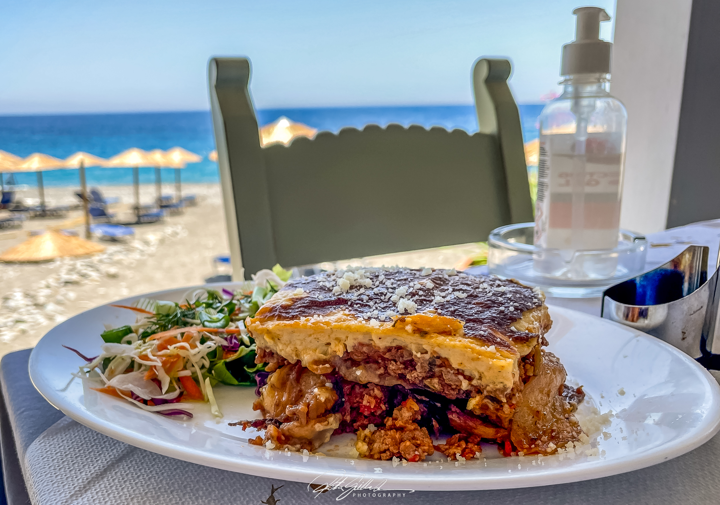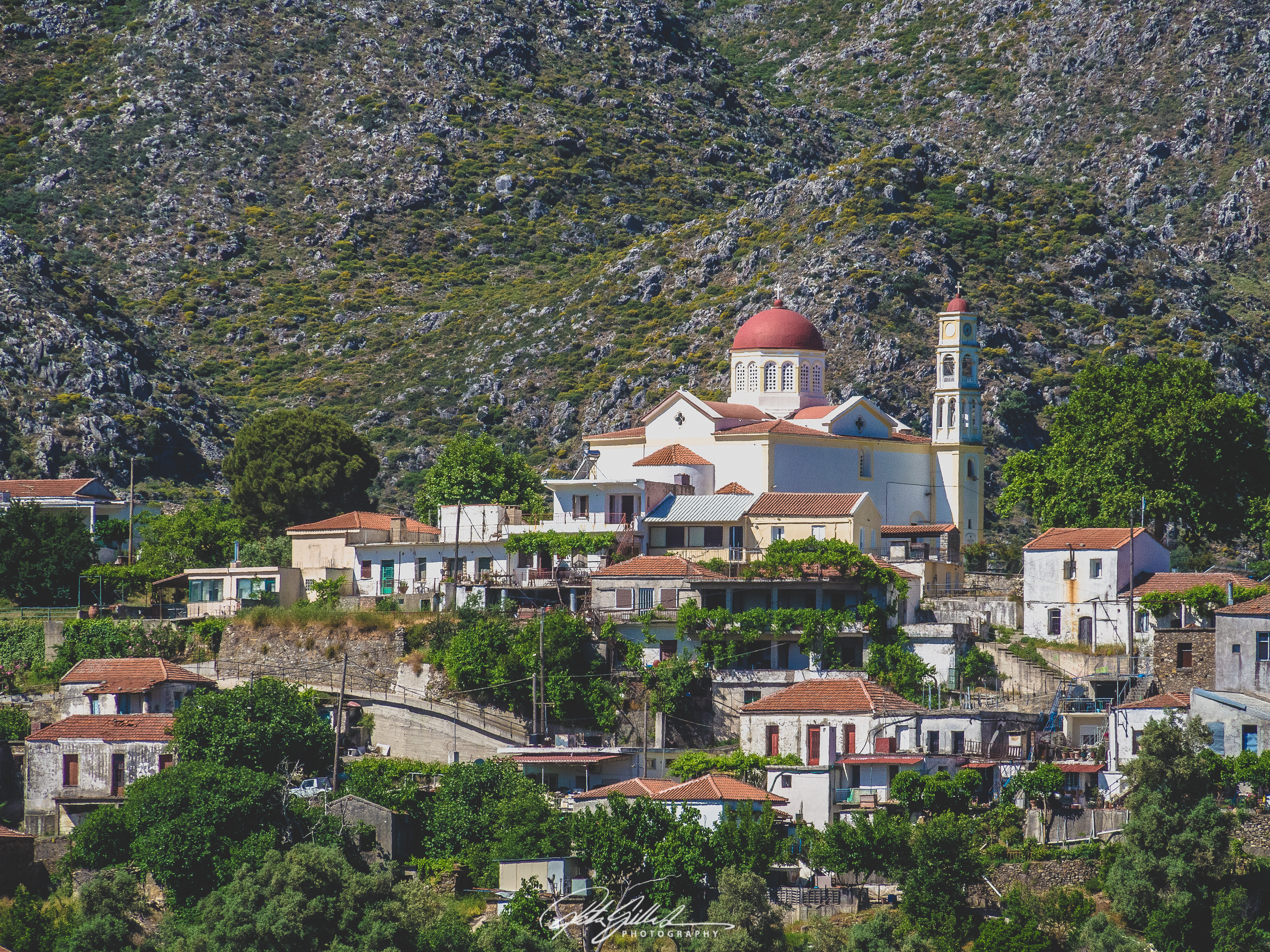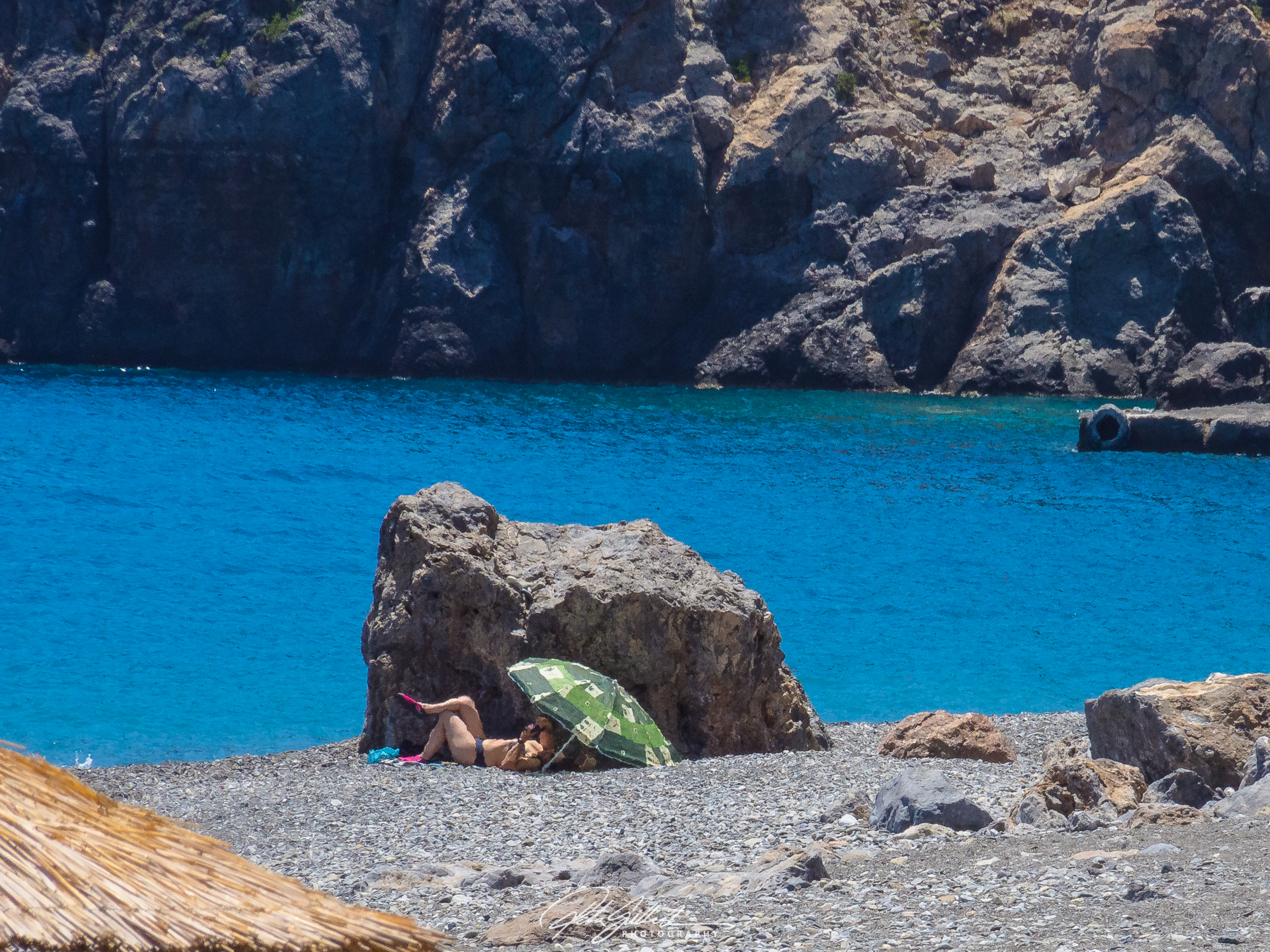 The place itself is hardly worth a mention but the beach, the Bay of Stavros, is a bathing paradise for swimming. The fine sand slopes gently to the sea and the bay is protected here from strong waves by a small promontory. There is not a lot of shade… unless you hire an umbrella and beach chair. Lying on the beach there is always something different to focus on when viewing the mountains opposite.