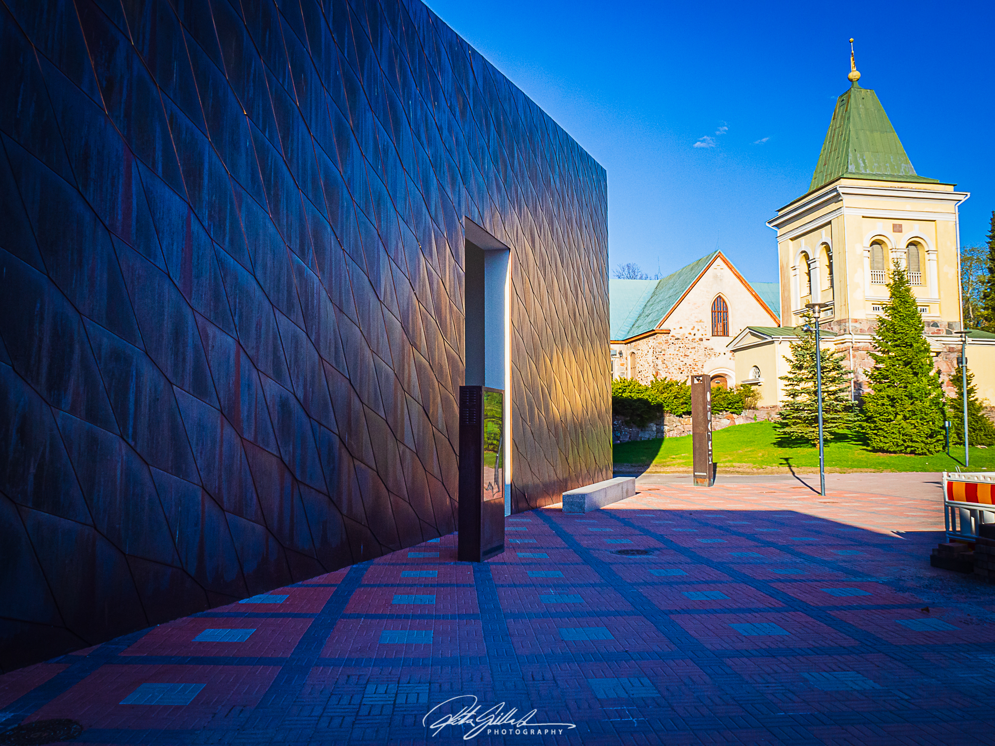 Old medieval church and new built modern Library in Kirkkonummi, Finland