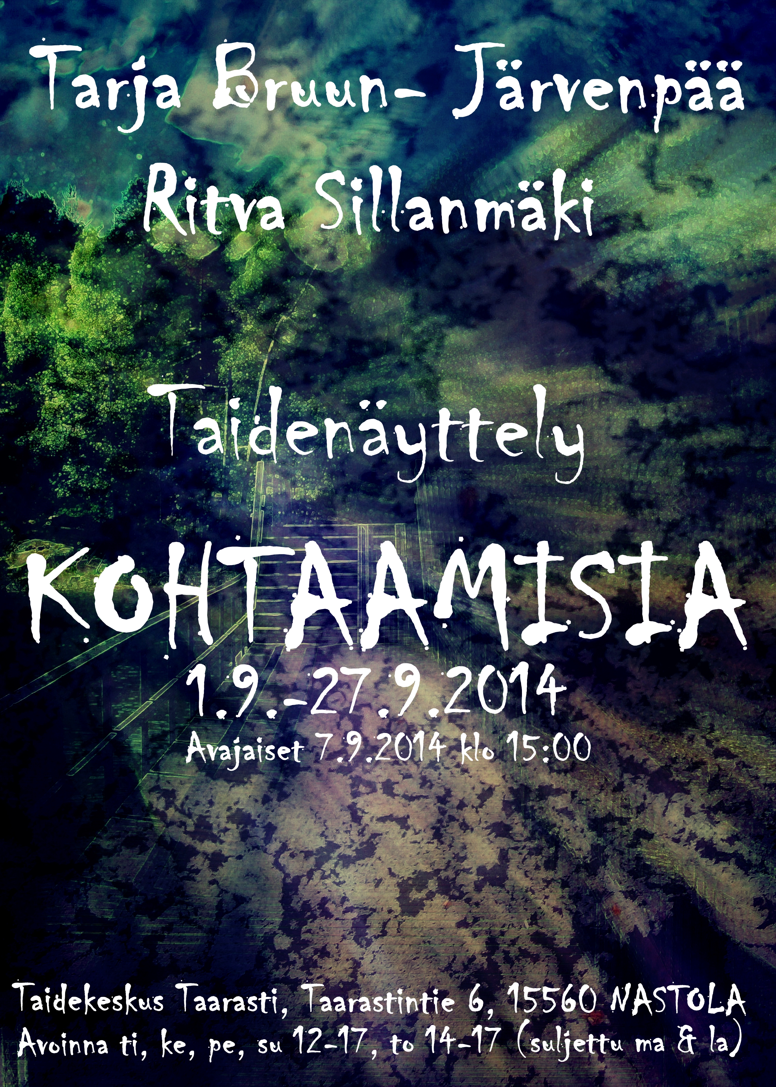 I will be having an art exhibition with a childhood friend and Artist Tarja Bruun- Järvenpää in Septemper 2014, it is named, Kohtaamisia (encounters)  at Taidekeskus Taarasti Nastola.