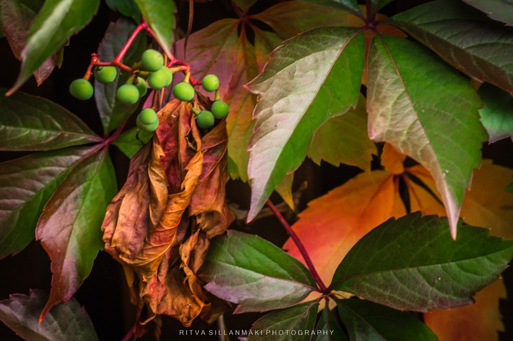These are some of the colors we still have in our backyard at home, orange, yellow, brown and green. In this post it is about Oriental Bittersweet that grows on our fence. What is left on it at the moment is orange color in the form of berries. Earlier in the autumn it was vivid yellow with yellow berries that now at the end of October have turned orange.