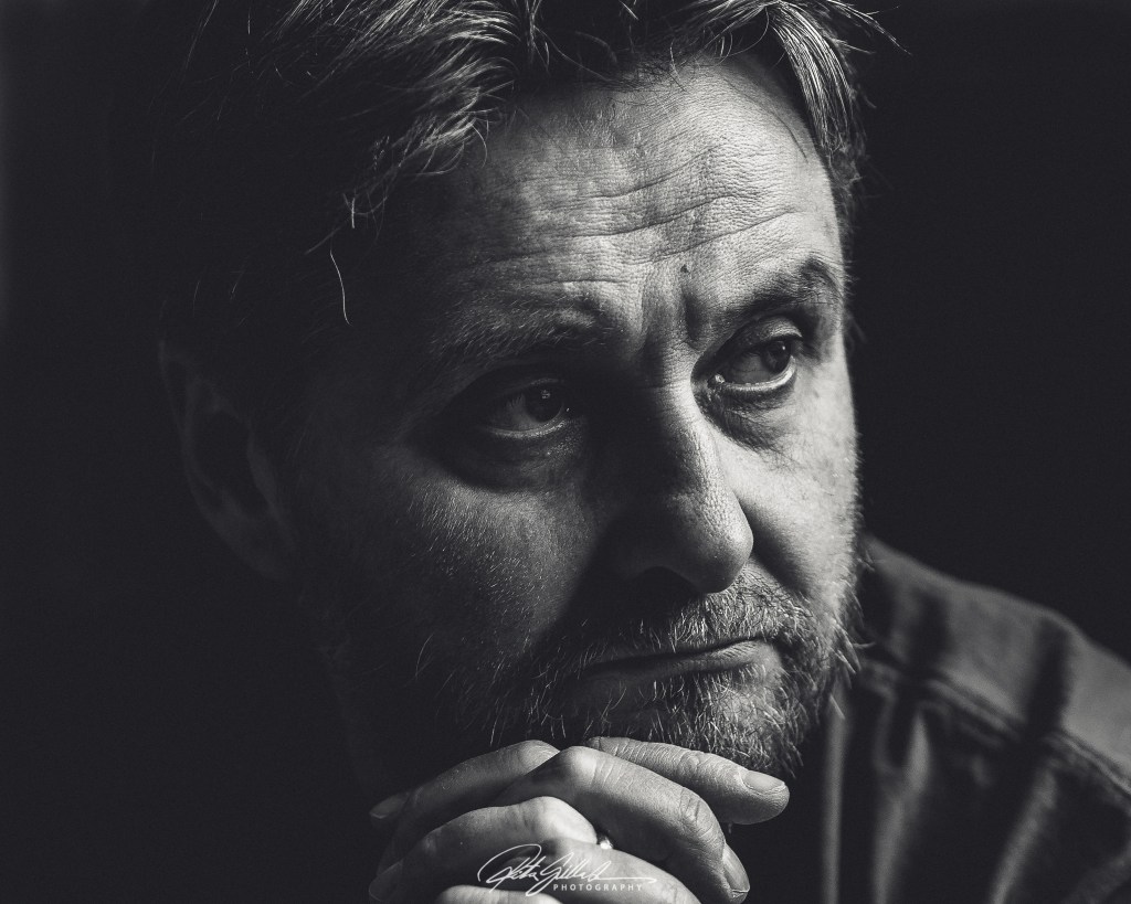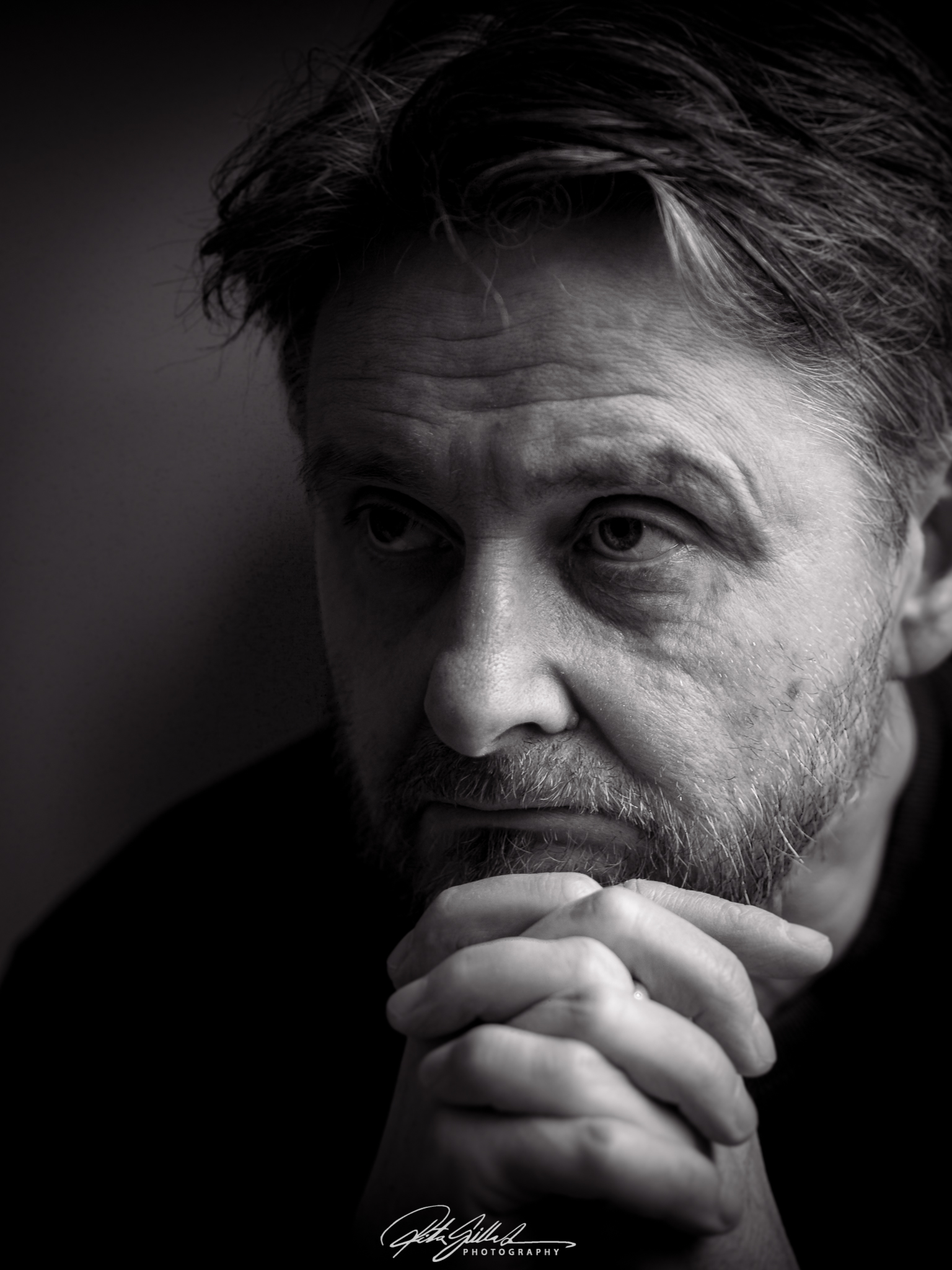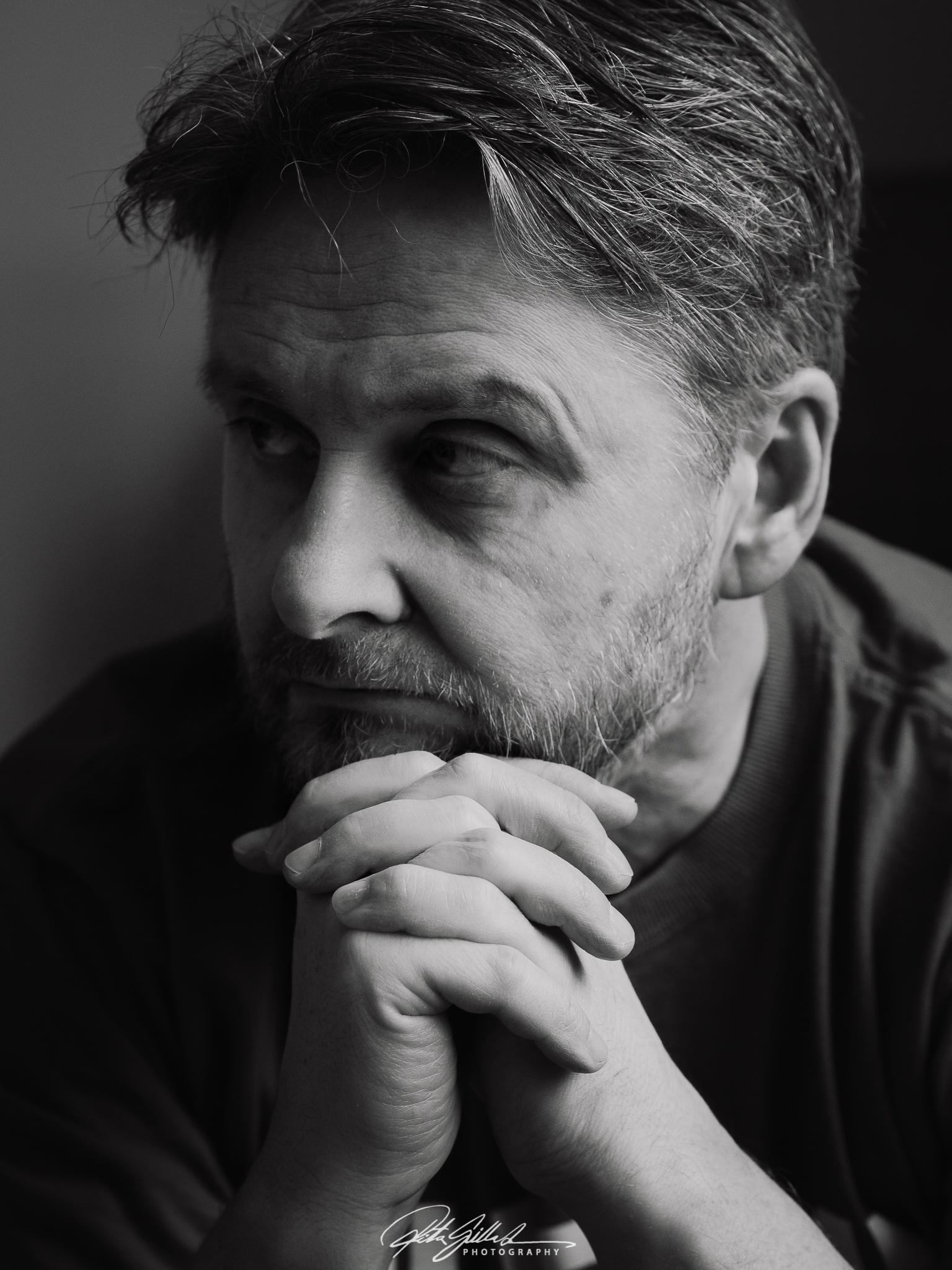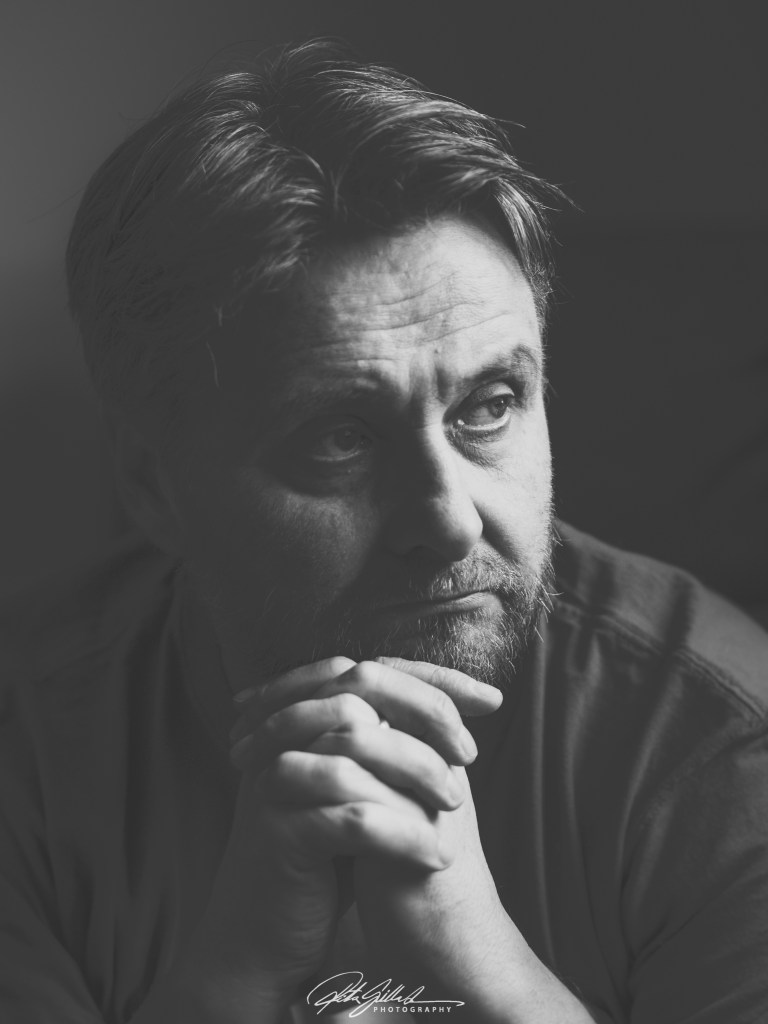 A contemplative black and white portrait of a man, reflecting deep emotion and introspection.