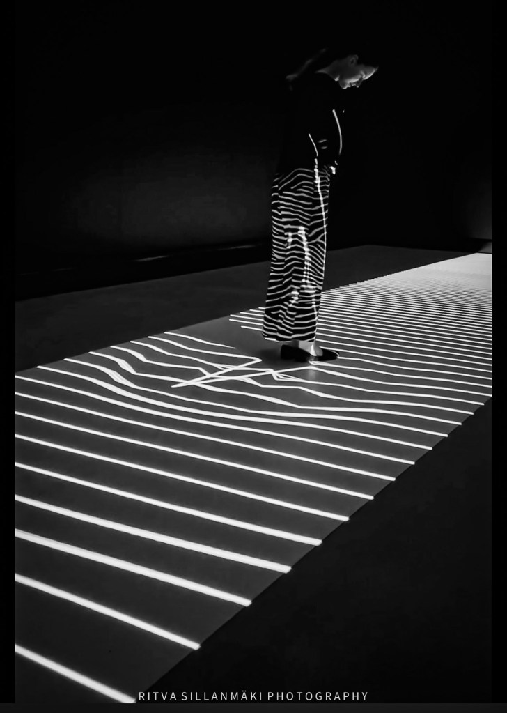 The composition features lines and shapes that convey movement, enhanced by the interplay of light and shadow. Although similar to the other image, subtle editing differences reveal distinct details, particularly the stripes under the woman’s feet and this one having a flat muted surface