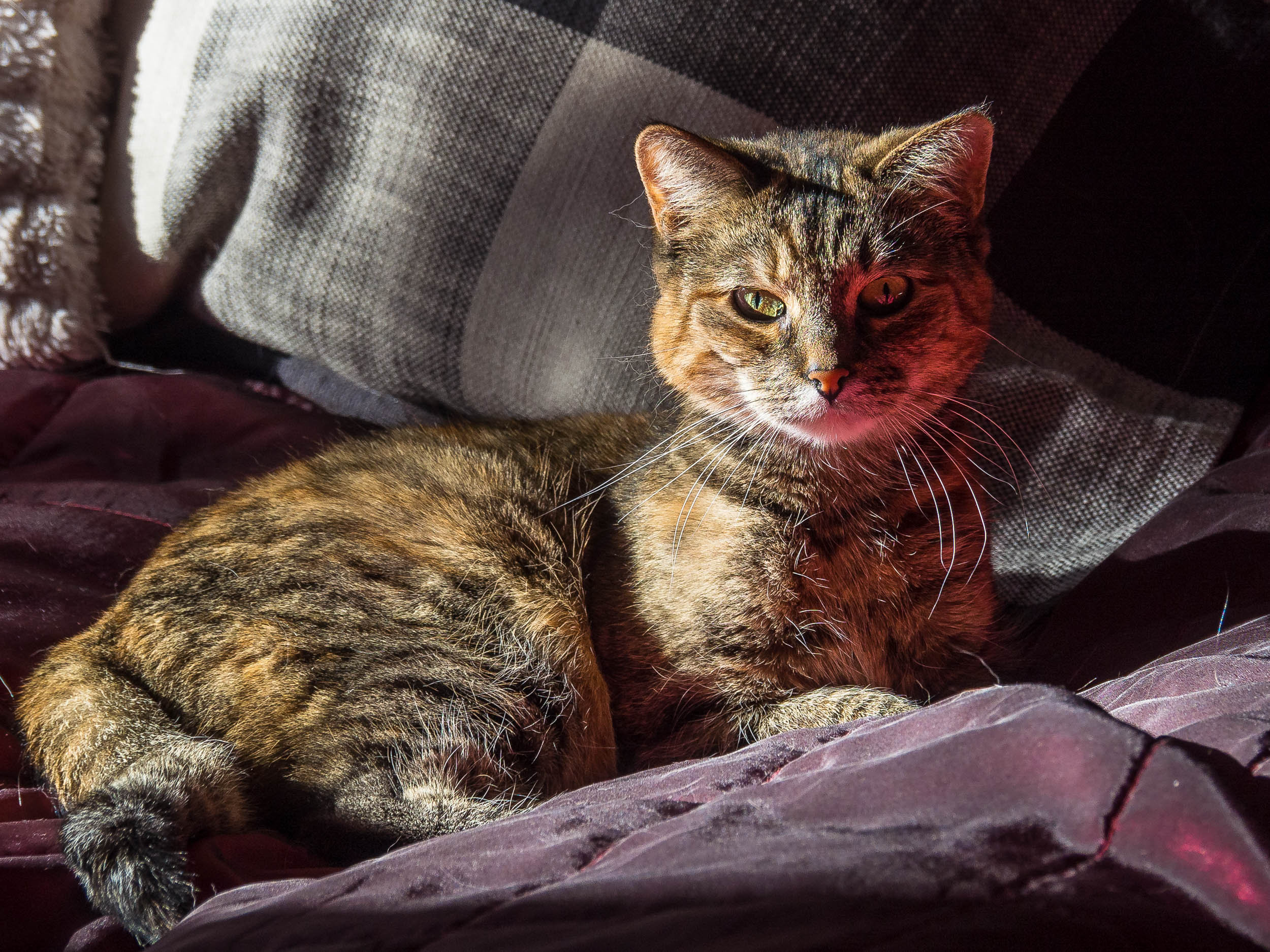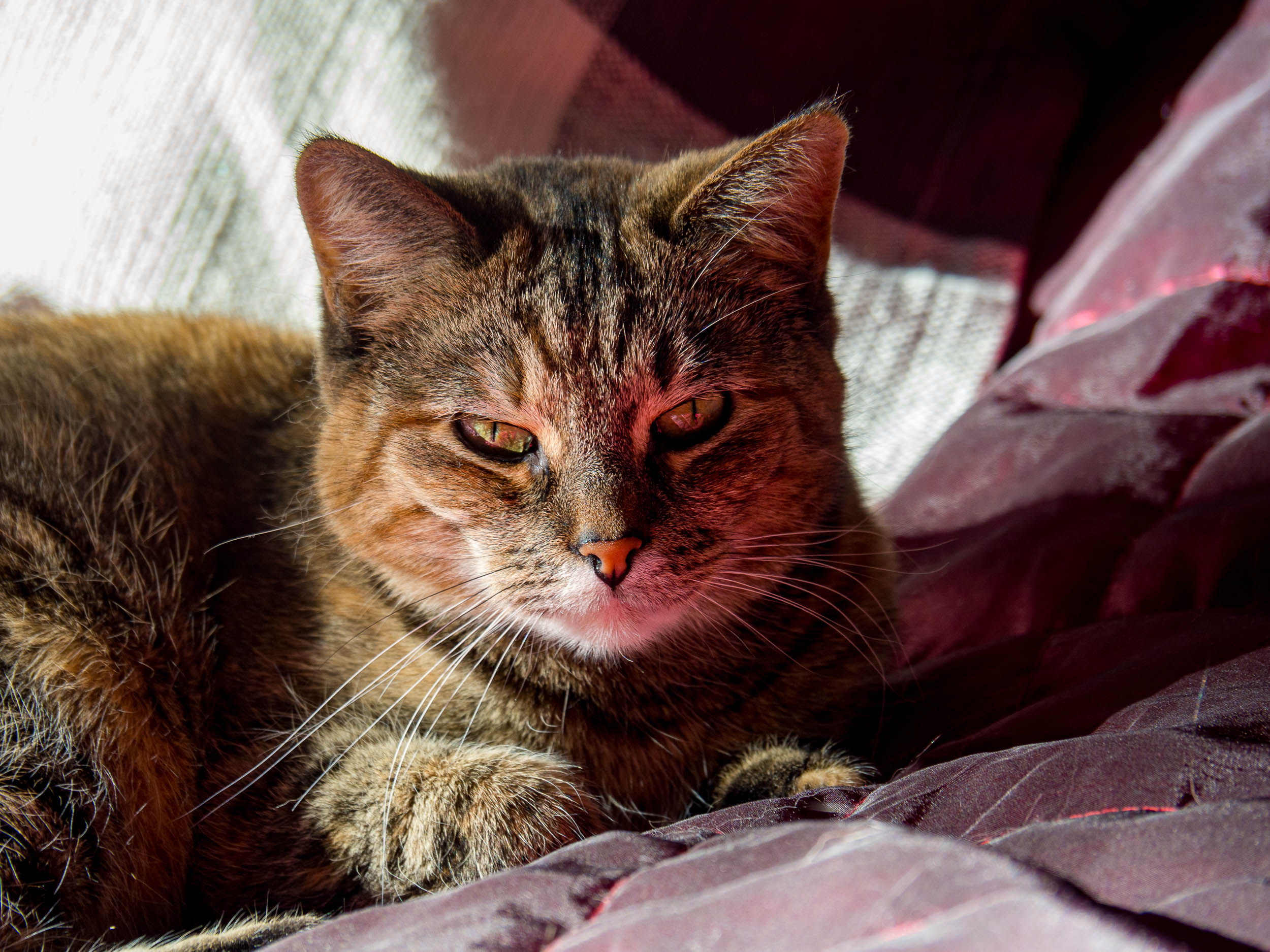 We have a new bedspread in this rich rich burgundy color, I liked how the color reflected to Tinka’s face in these photos.