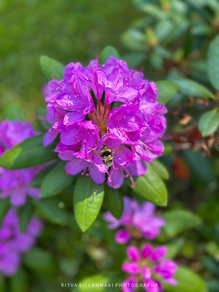 Close-up of vibrant pink Rhododendron flowers with a bee pollinating, captured in my backyard