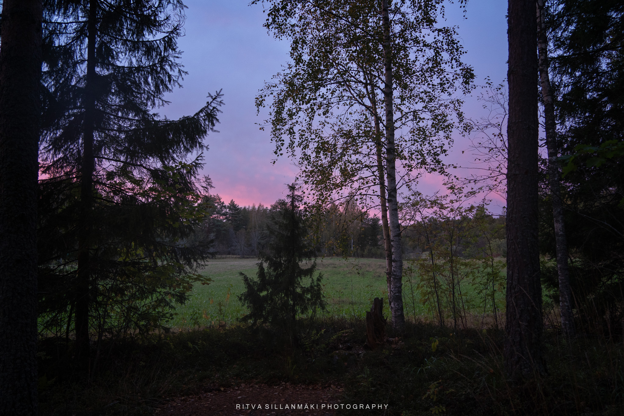 A serene view south facing a sunset showcasing vibrant pink and blue hues, framed by trees and an open field, capturing the beauty of nature.Capturing the serene hues of twilight on the northern sky with delicate branches in the foreground.