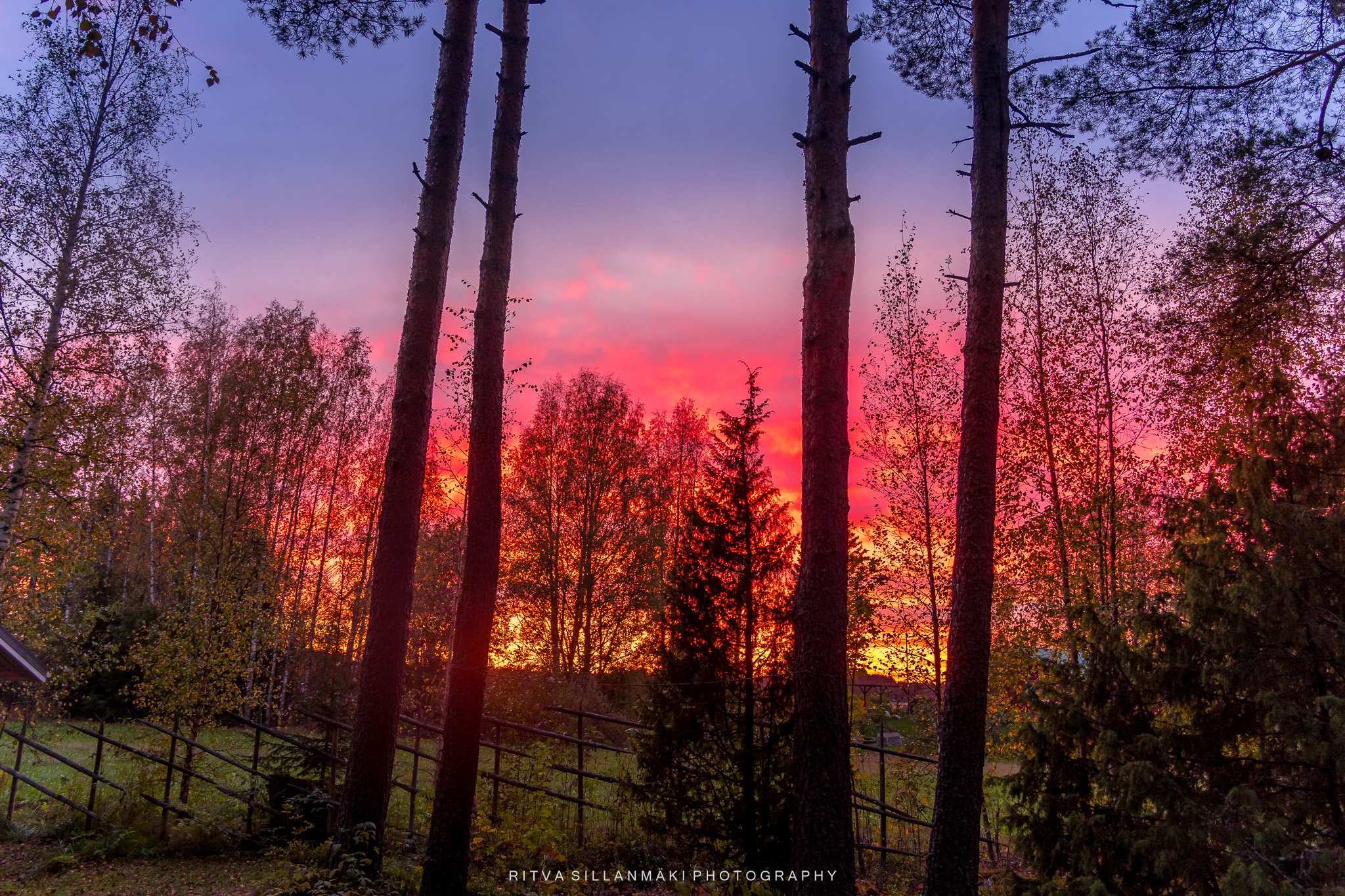 A stunning sunset with vibrant colors peeking through the trees, a glorious evening sky.