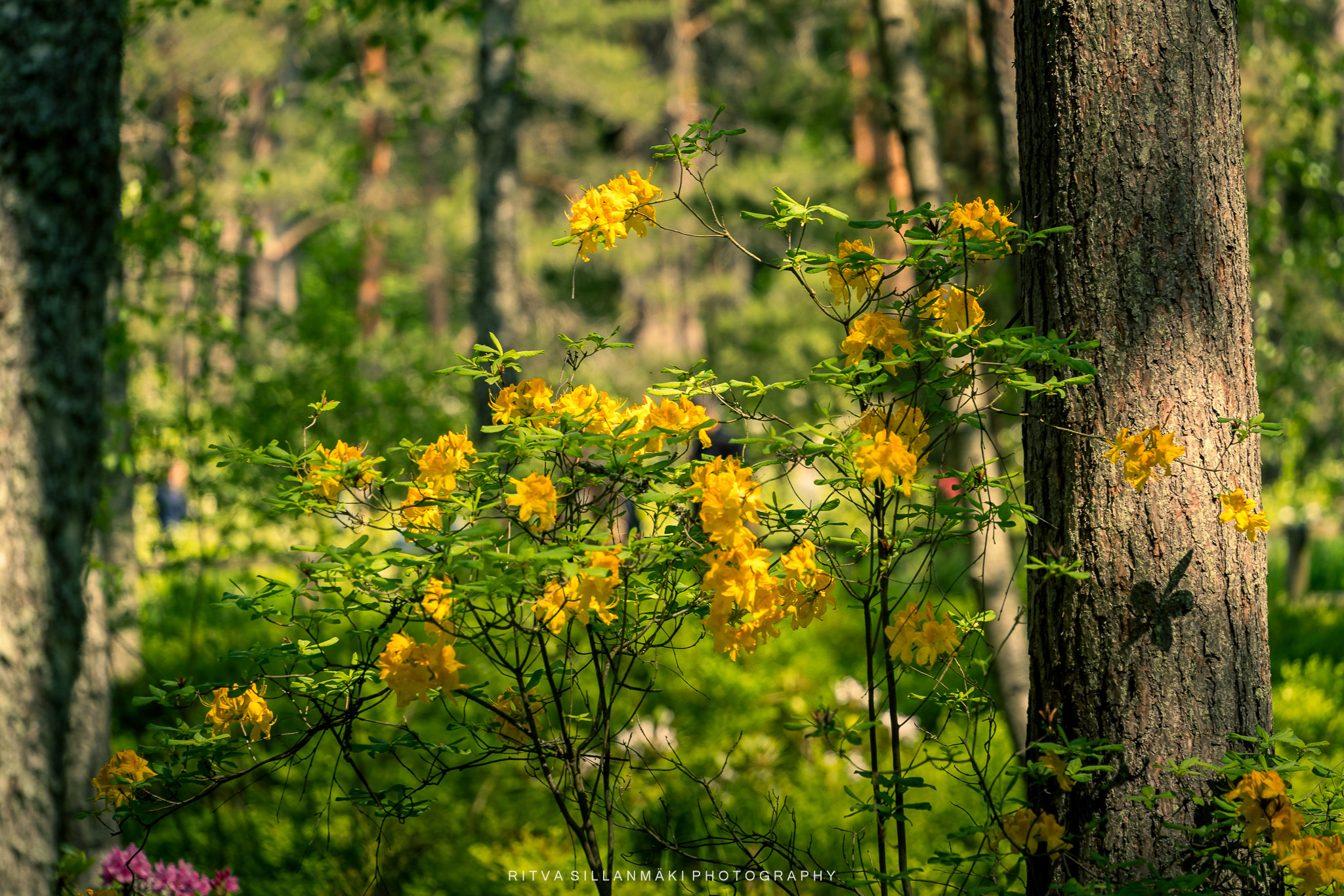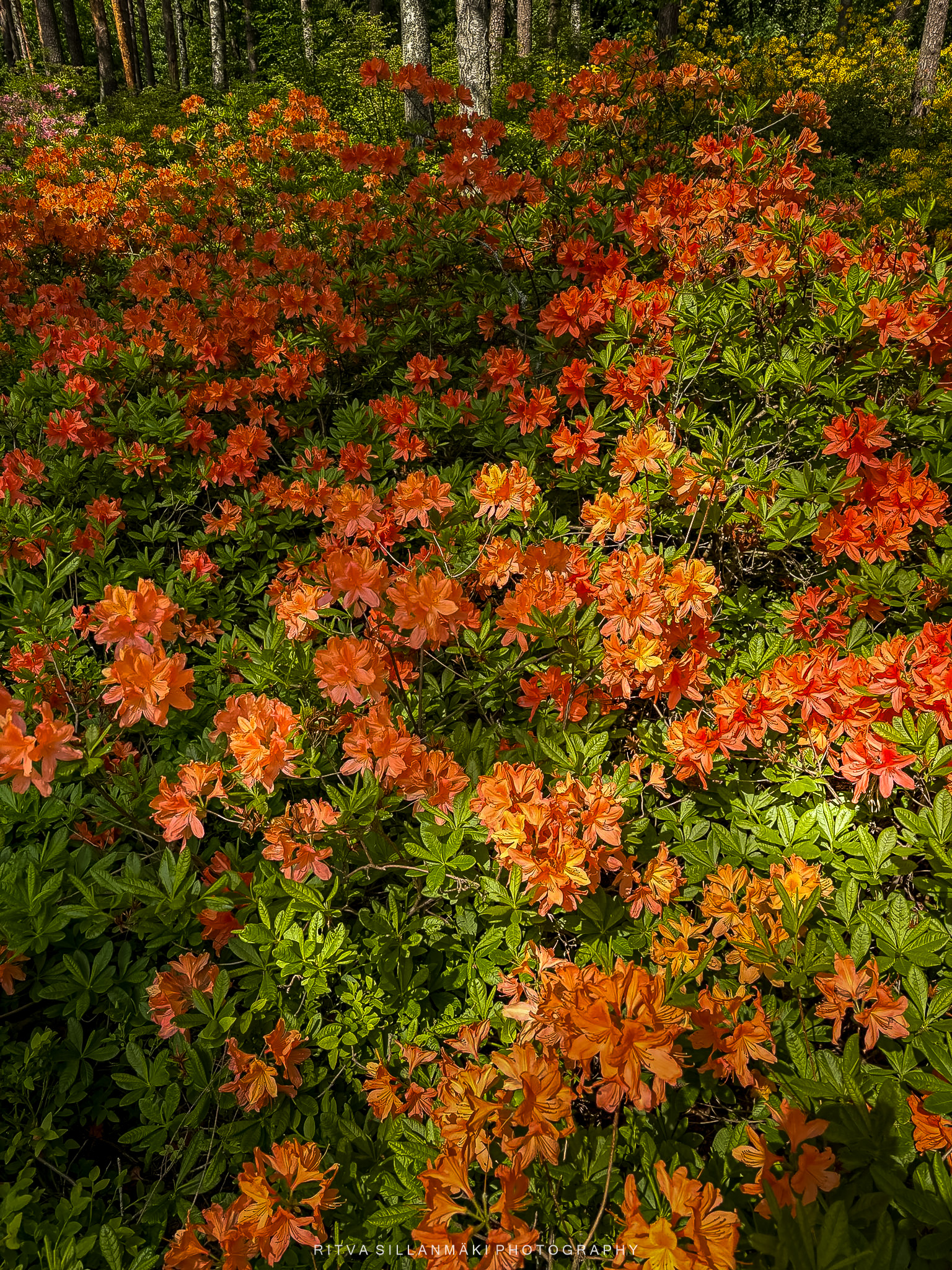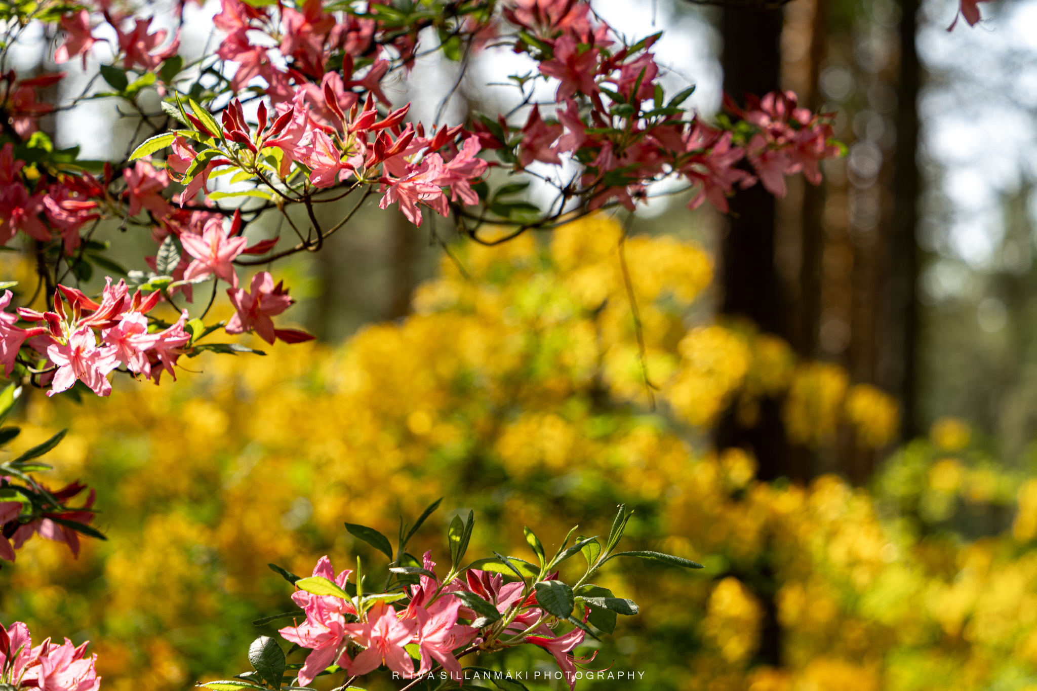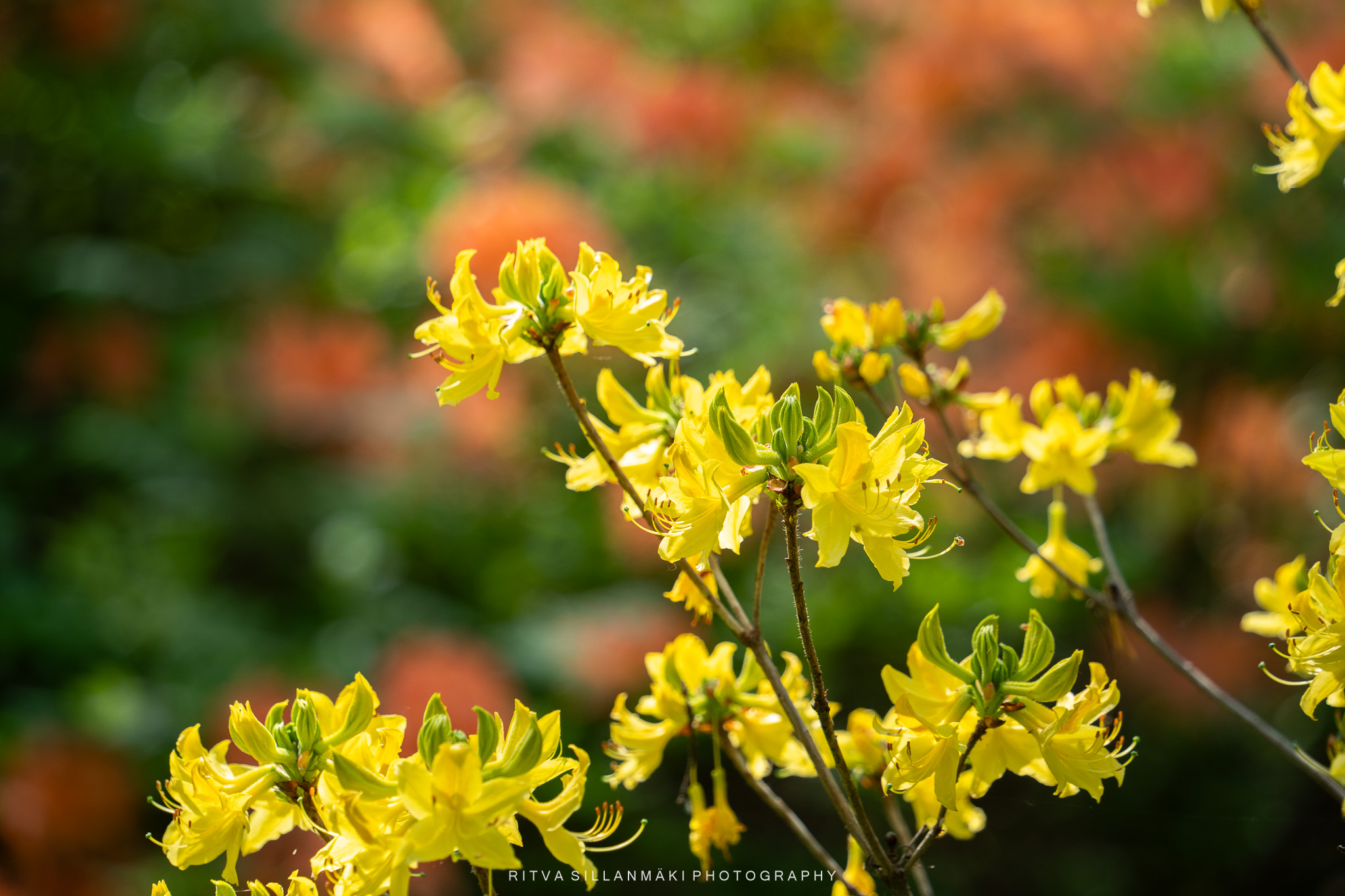 I took these photos this summer. As I mentioned in my previous post, I enjoy taking pictures of flowers, but I have been posting them sparingly . Recently, as I have been seeing these vibrant yellow and orange posts filling my feed, I couldn’t help but look back to my visit at the Rhododendron park in Helsinki, where these beautiful colors captured my attention. The vivid colors of the flowers the joy of a summer day spent wandering through the park, admiring nature’s artistry. Now seems like the perfect opportunity to share these images with all of you. I have lots of shots of the pink flowers – added two as the backdrop in yellow. Here are my Vibrant Yellow and Orange Hues.