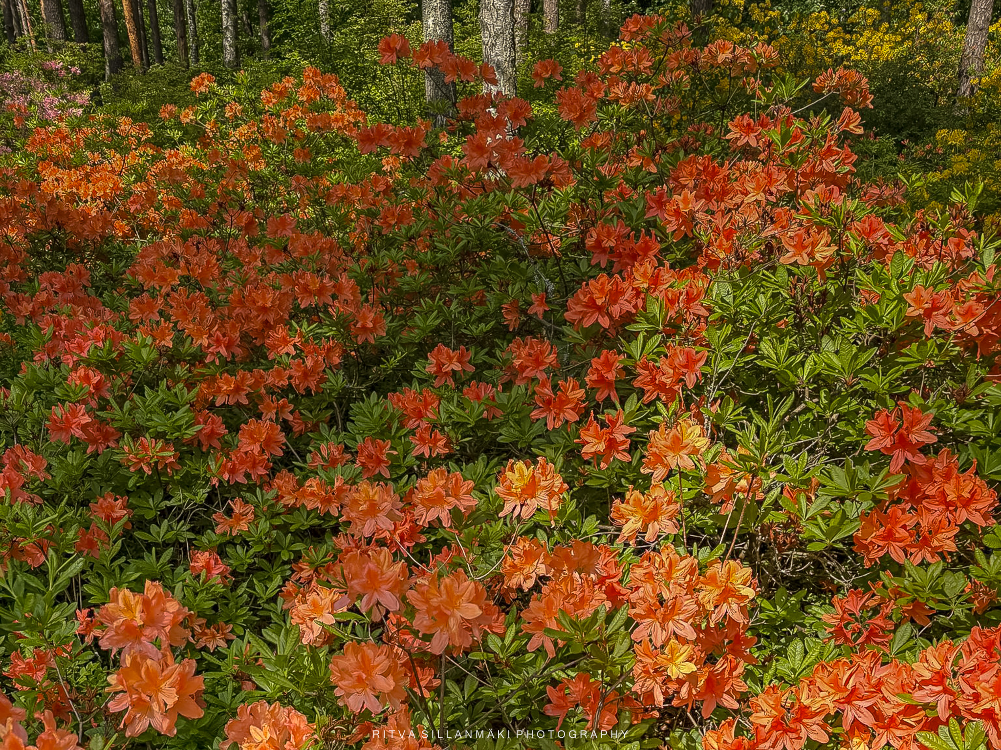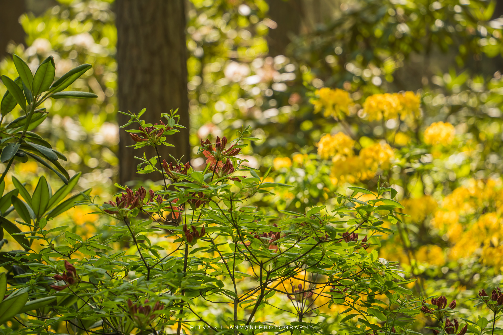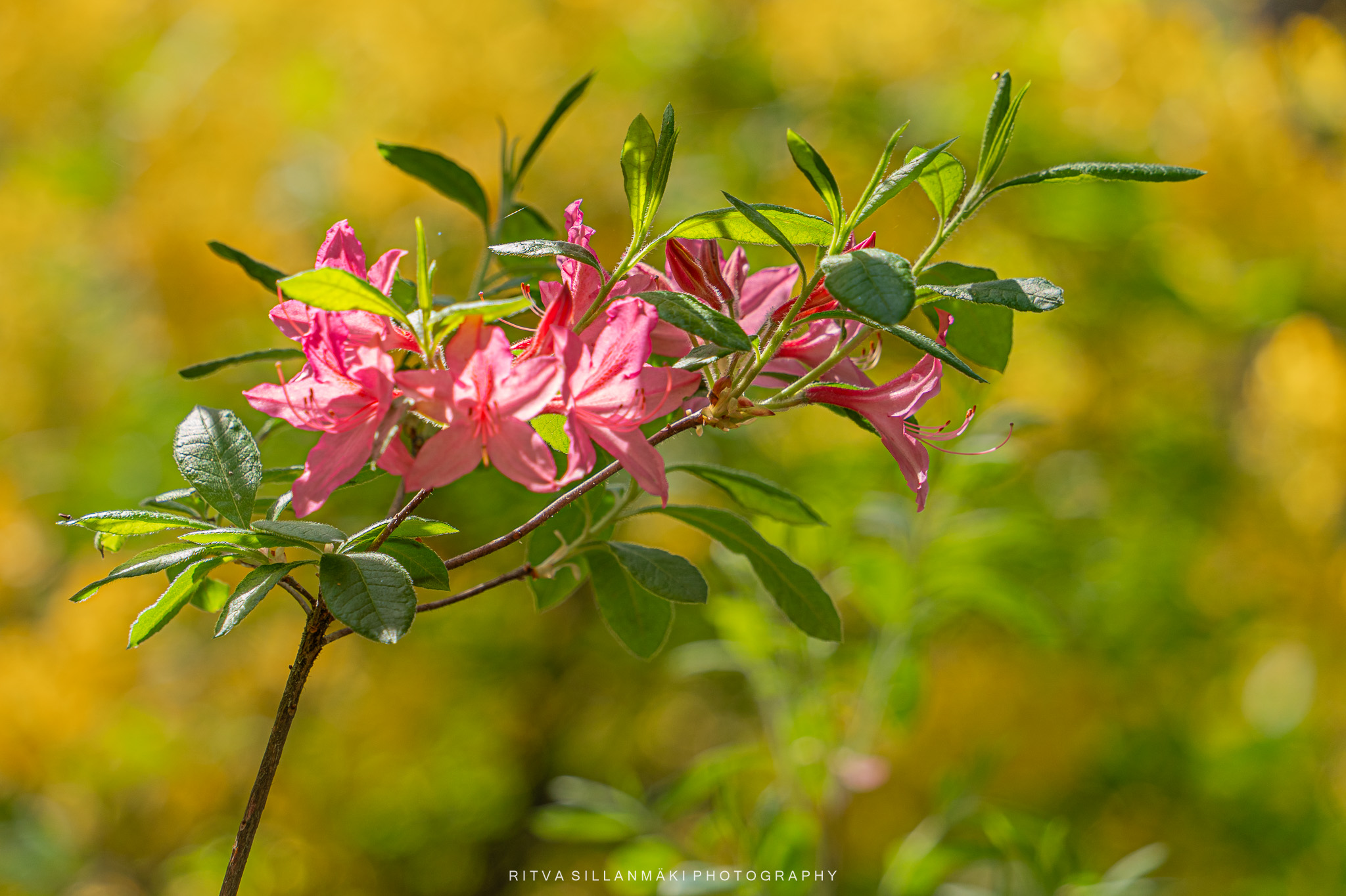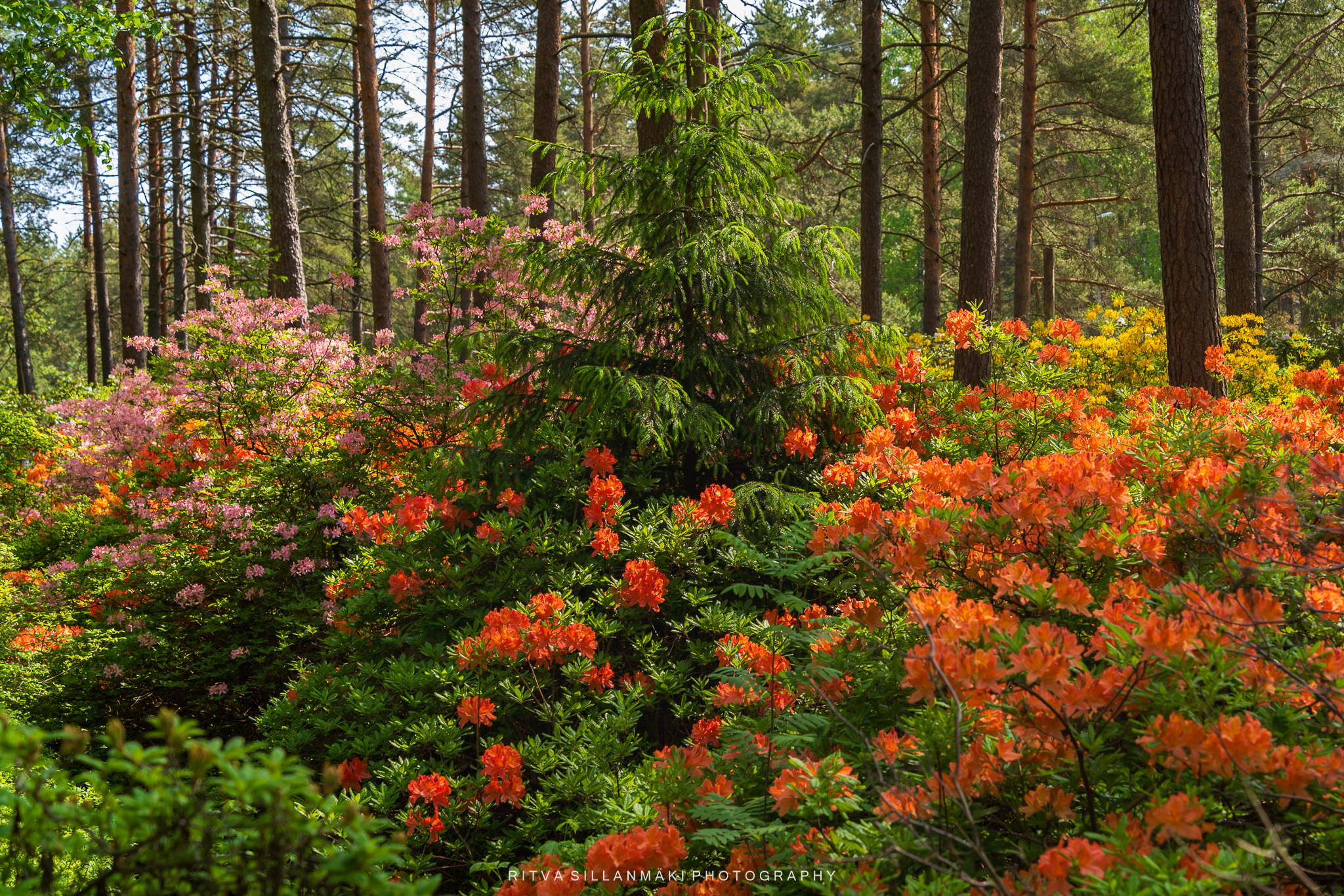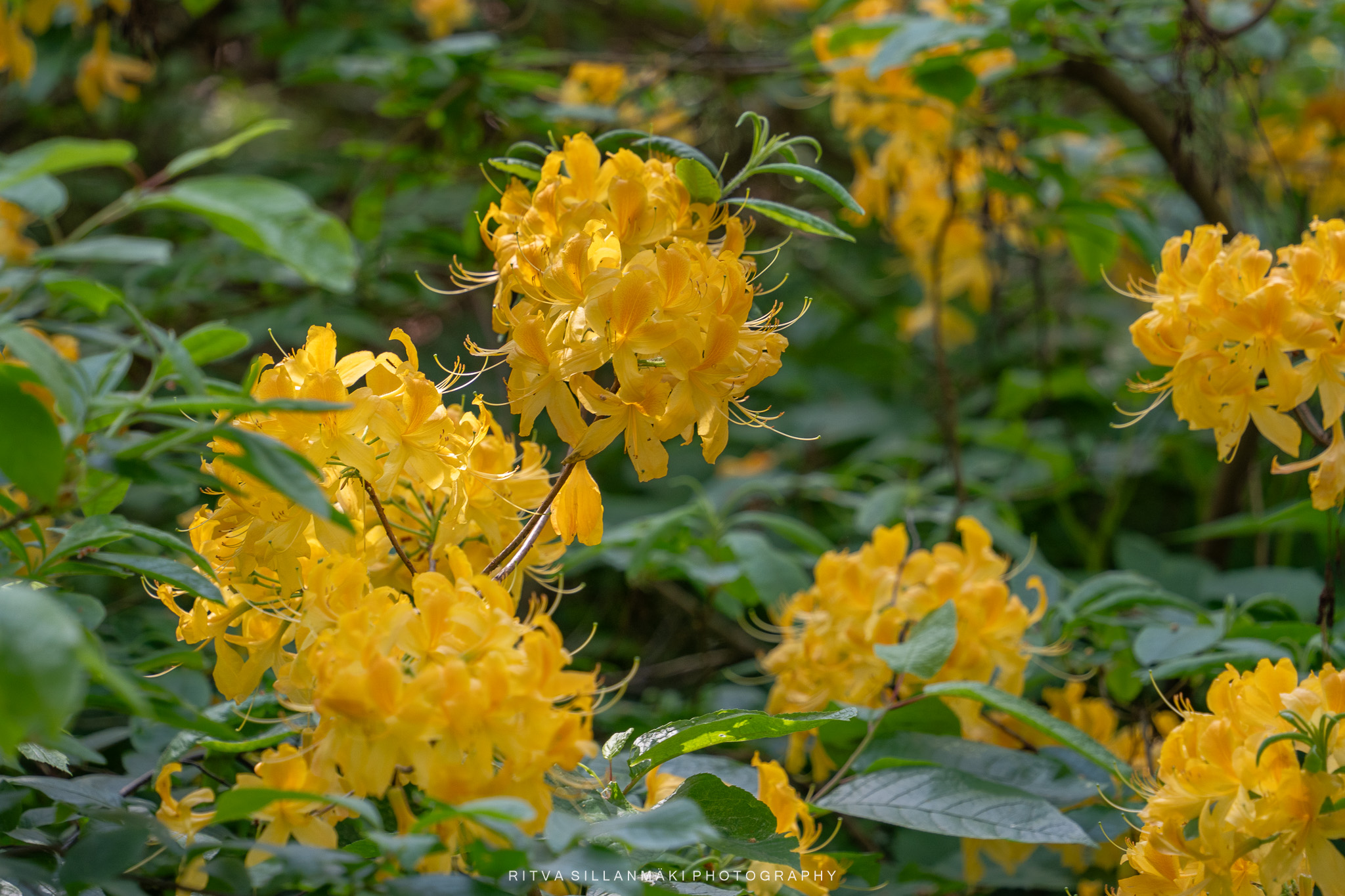 I took these photos this summer. As I mentioned in my previous post, I enjoy taking pictures of flowers, but I have been posting them sparingly . Recently, as I have been seeing these vibrant yellow and orange posts filling my feed, I couldn’t help but look back to my visit at the Rhododendron park in Helsinki, where these beautiful colors captured my attention. The vivid colors of the flowers the joy of a summer day spent wandering through the park, admiring nature’s artistry. Now seems like the perfect opportunity to share these images with all of you. I have lots of shots of the pink flowers – added two as the backdrop in yellow. Here are my Vibrant Yellow and Orange Hues.