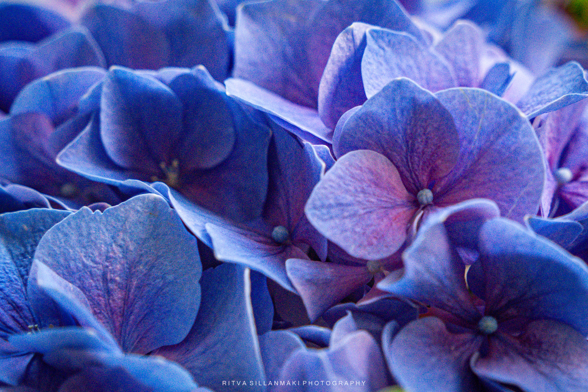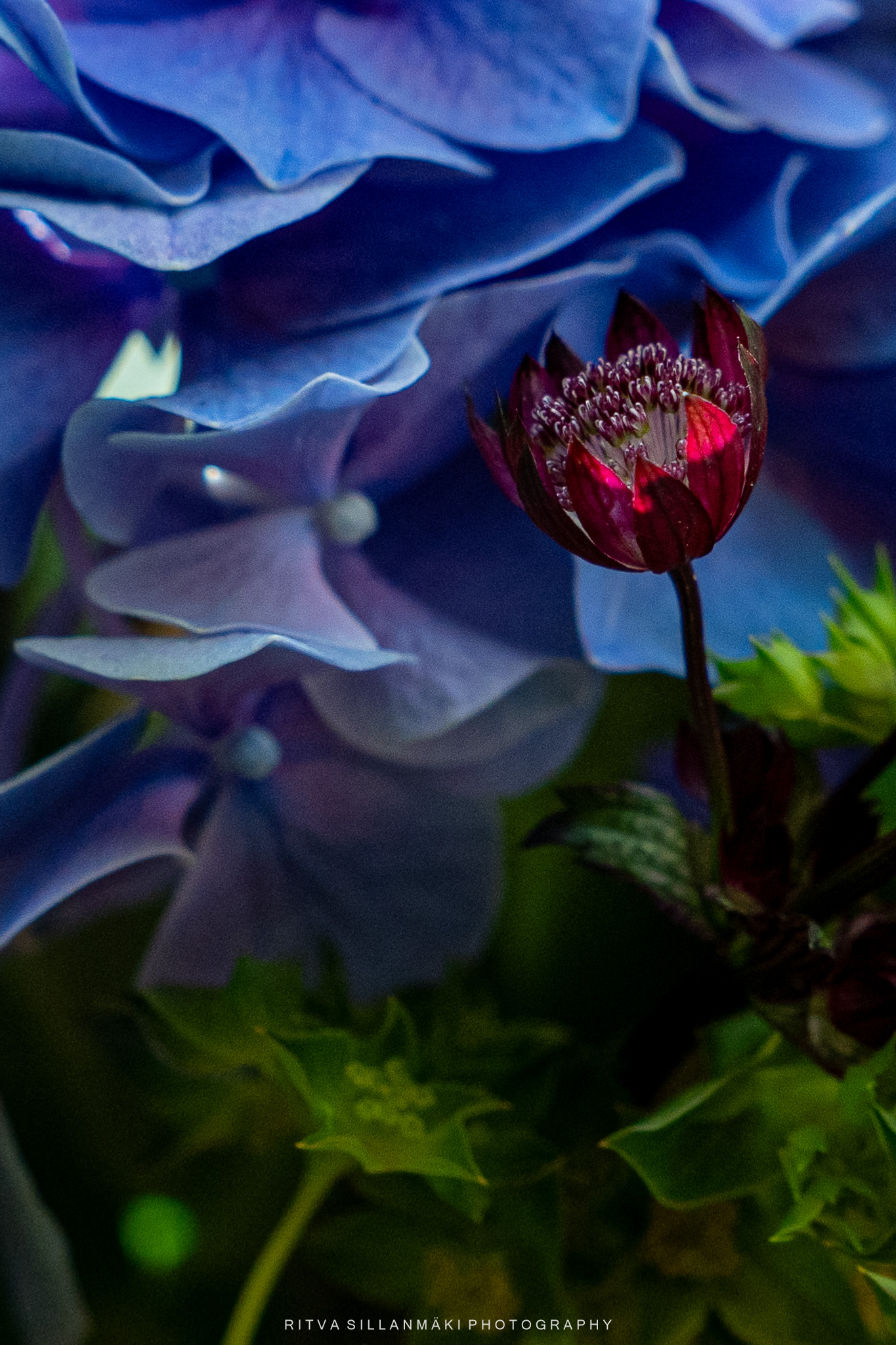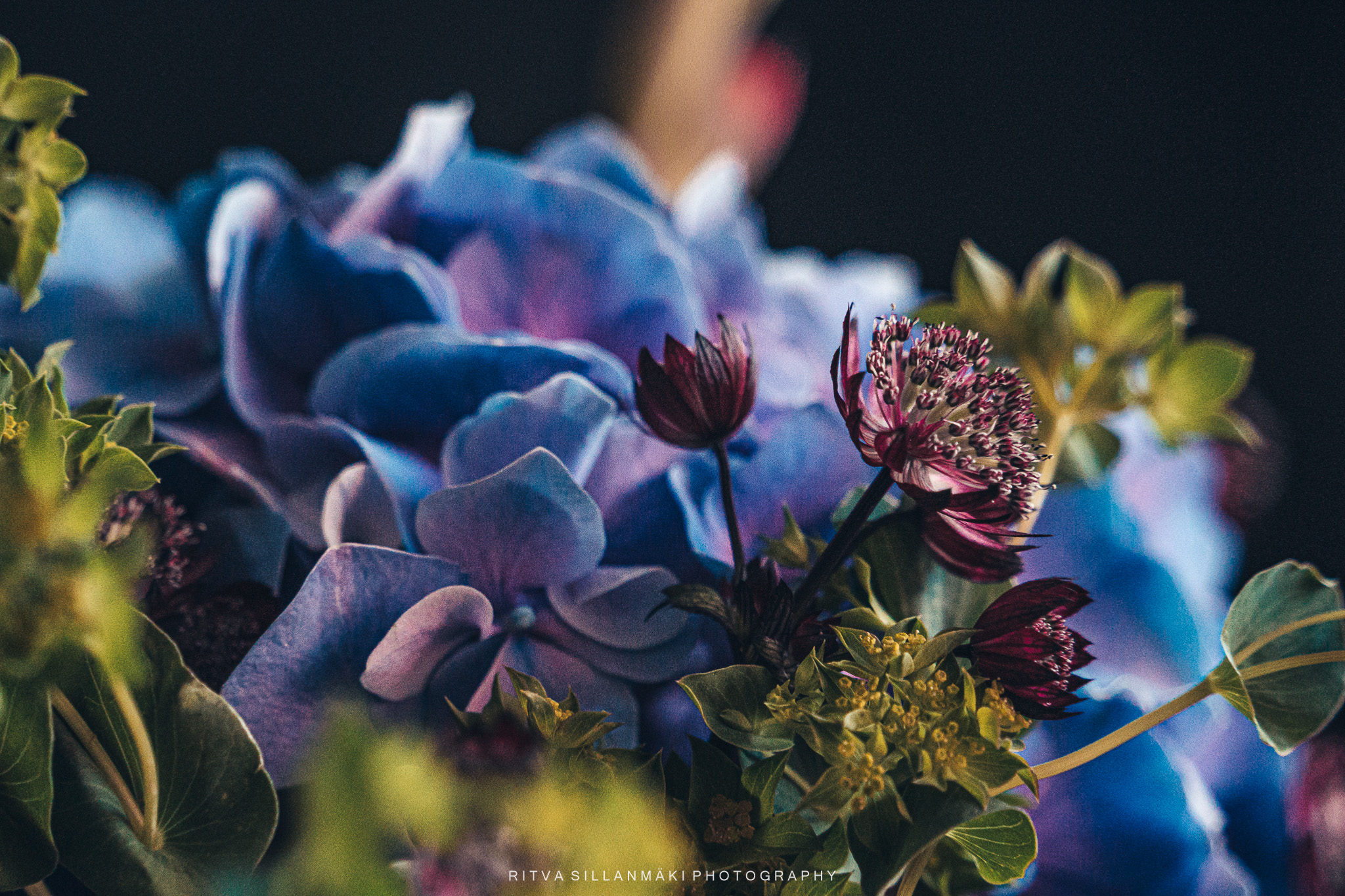 A close-up of vibrant floral arrangements featuring blue hydrangeas and rich, deep-toned flowers, perfect for interior design inspiration.