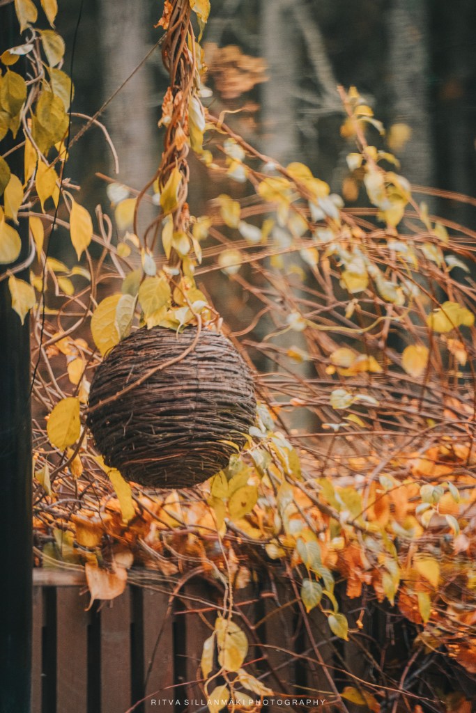 A whimsical round bird’s nest surrounded by twisting branches and vibrant autumn leaves.