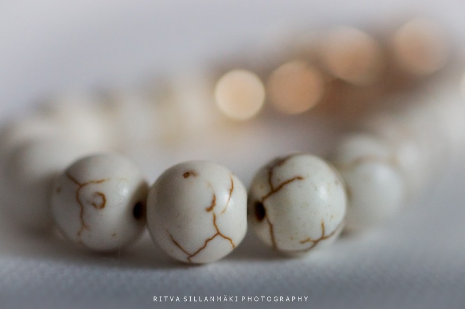 Close-up of a beautifully crafted beaded necklace with white stones with brown lines