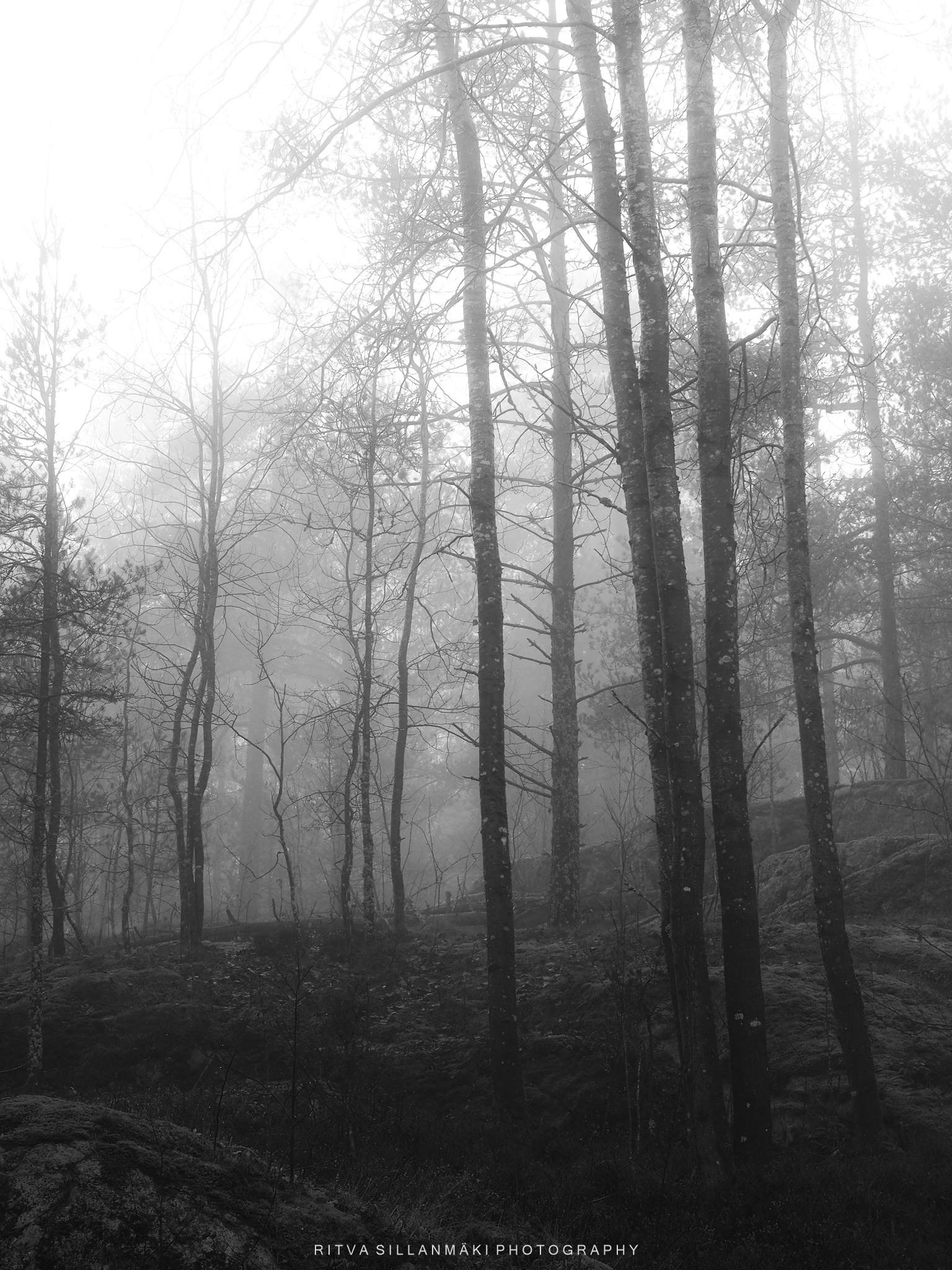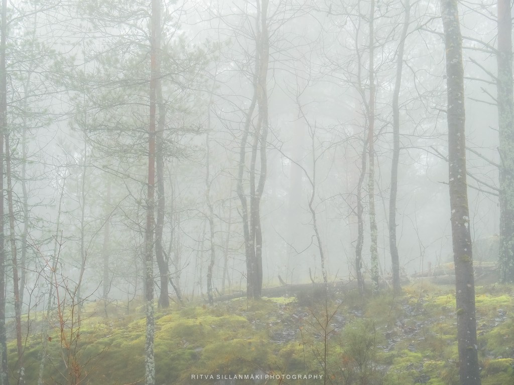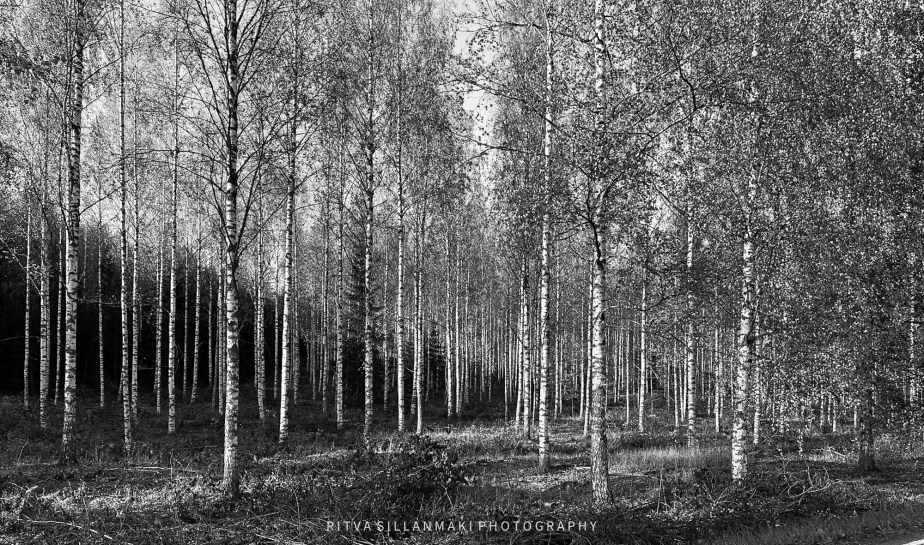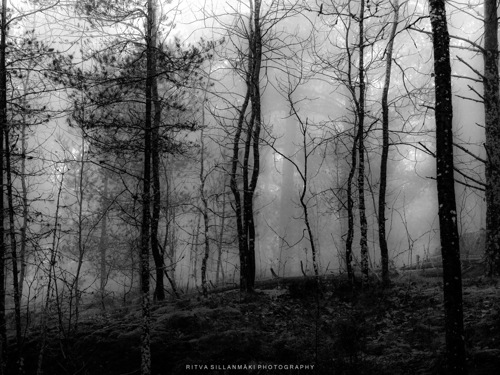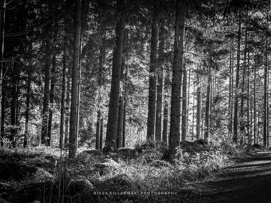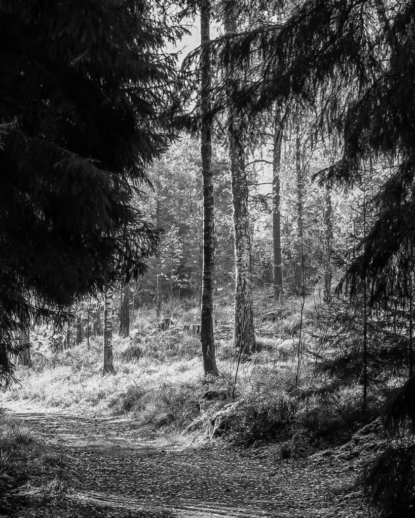 A misty forest scene and the beauty of our wooded landscape. This shot I took from my backyardThe birch trees, the inviting essence of a Finnish forest. The tall, slender trunks of spruce trees amid lush undergrowth amd fallen branches The natural beauty of the forest in KirkkonummiA black and white view of a forest path surrounded by tall trees, showcasing the beauty of woods