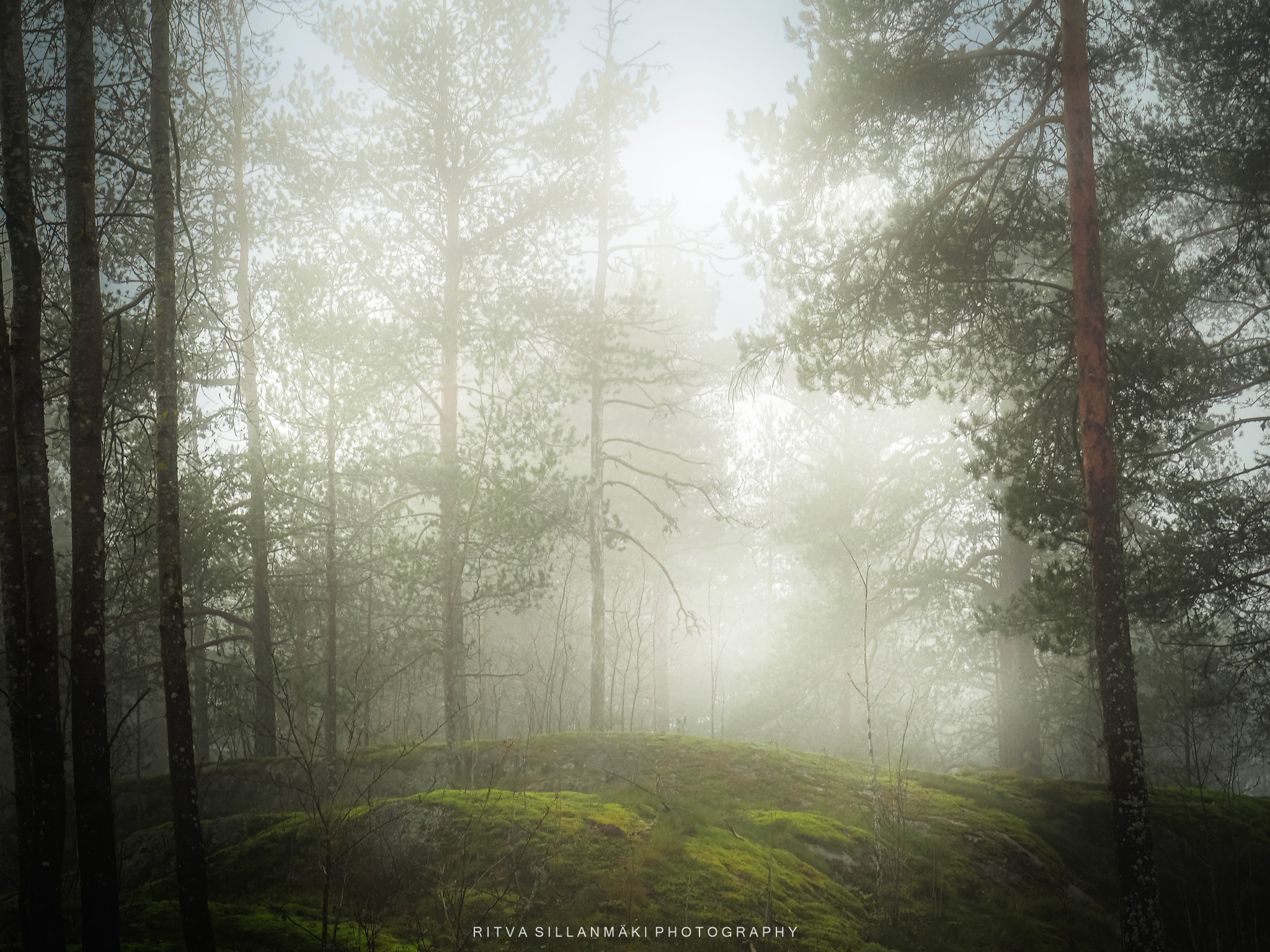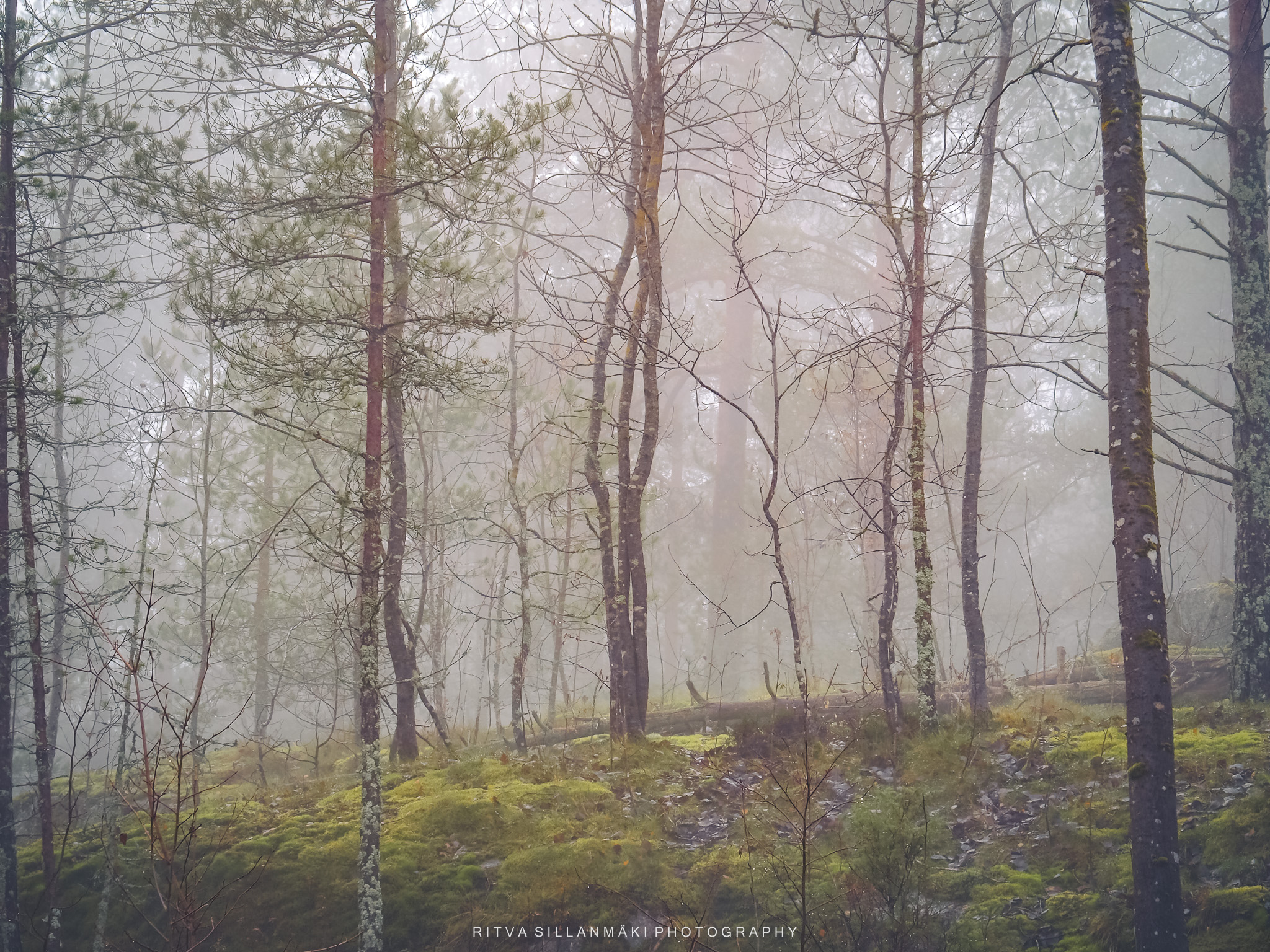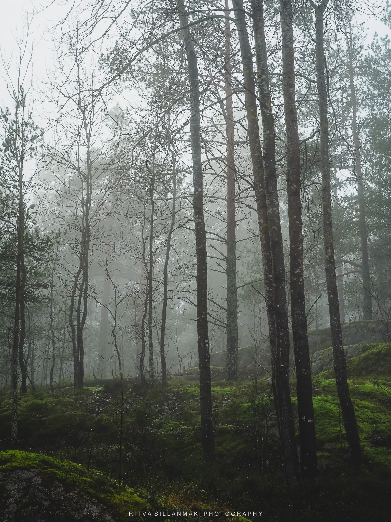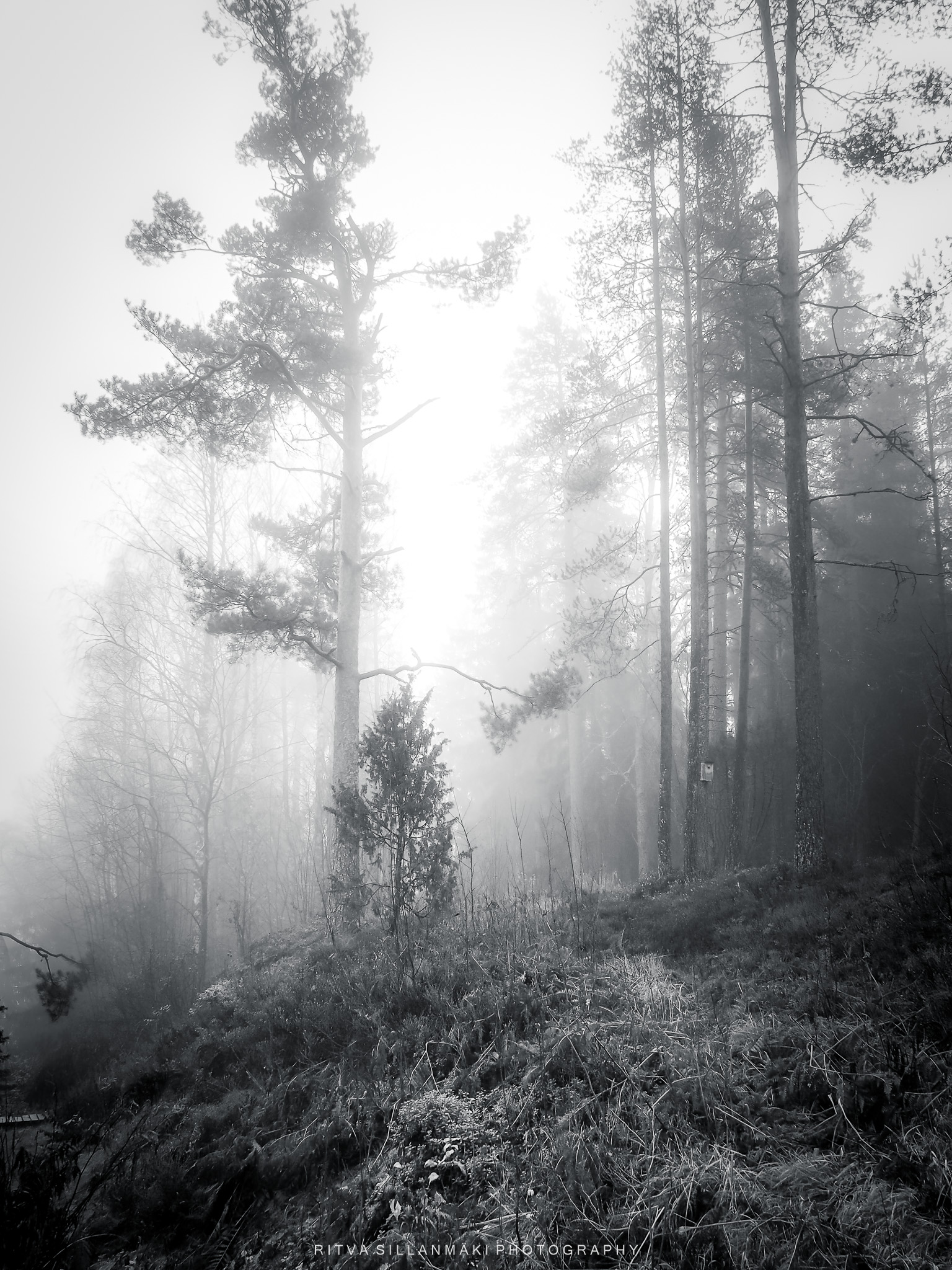 A misty forest scene and the beauty of our wooded landscape. This shot I took from my backyardThe birch trees, the inviting essence of a Finnish forest. The tall, slender trunks of spruce trees amid lush undergrowth amd fallen branches The natural beauty of the forest in KirkkonummiA black and white view of a forest path surrounded by tall trees, showcasing the beauty of woods