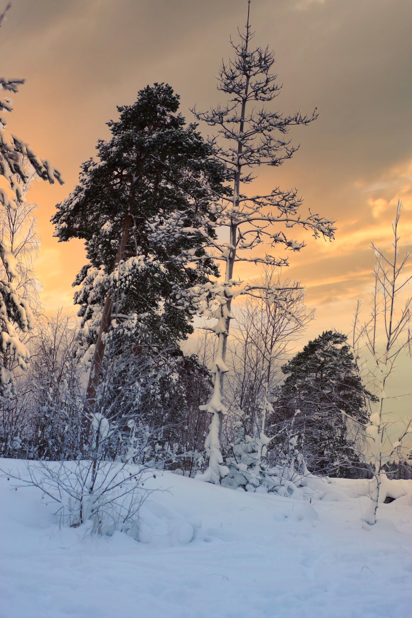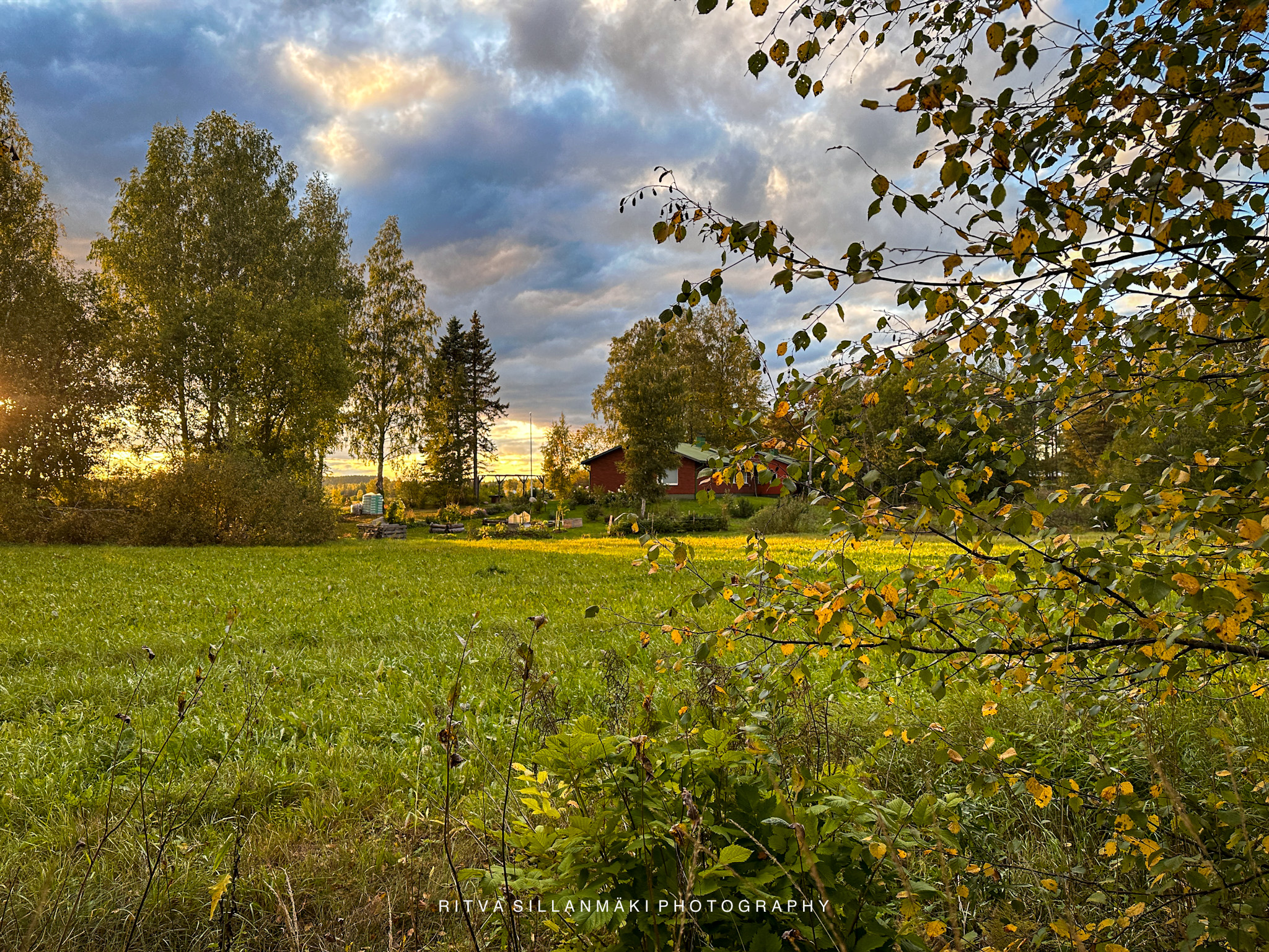 Across the fields, there are two houses standing in close proximity, each possessing its own unique charm. One is a bright and visible red house that catches the eye from a distance; until last summer, it was somewhat concealed behind four enormous spruce trees. However, the new owners decided to cut those majestic trees down, eager to allow more sunlight into their yard, especially in the morning when the sunlight paints everything in a golden hue. The other house, in contrast, stays hidden for most of the year, only revealing itself when the leaves have fallen, creating a picturesque scene reminiscent of a painting. This second house is captured in the sunset shot below.