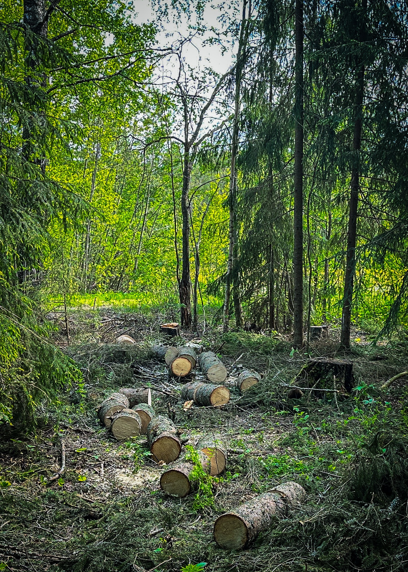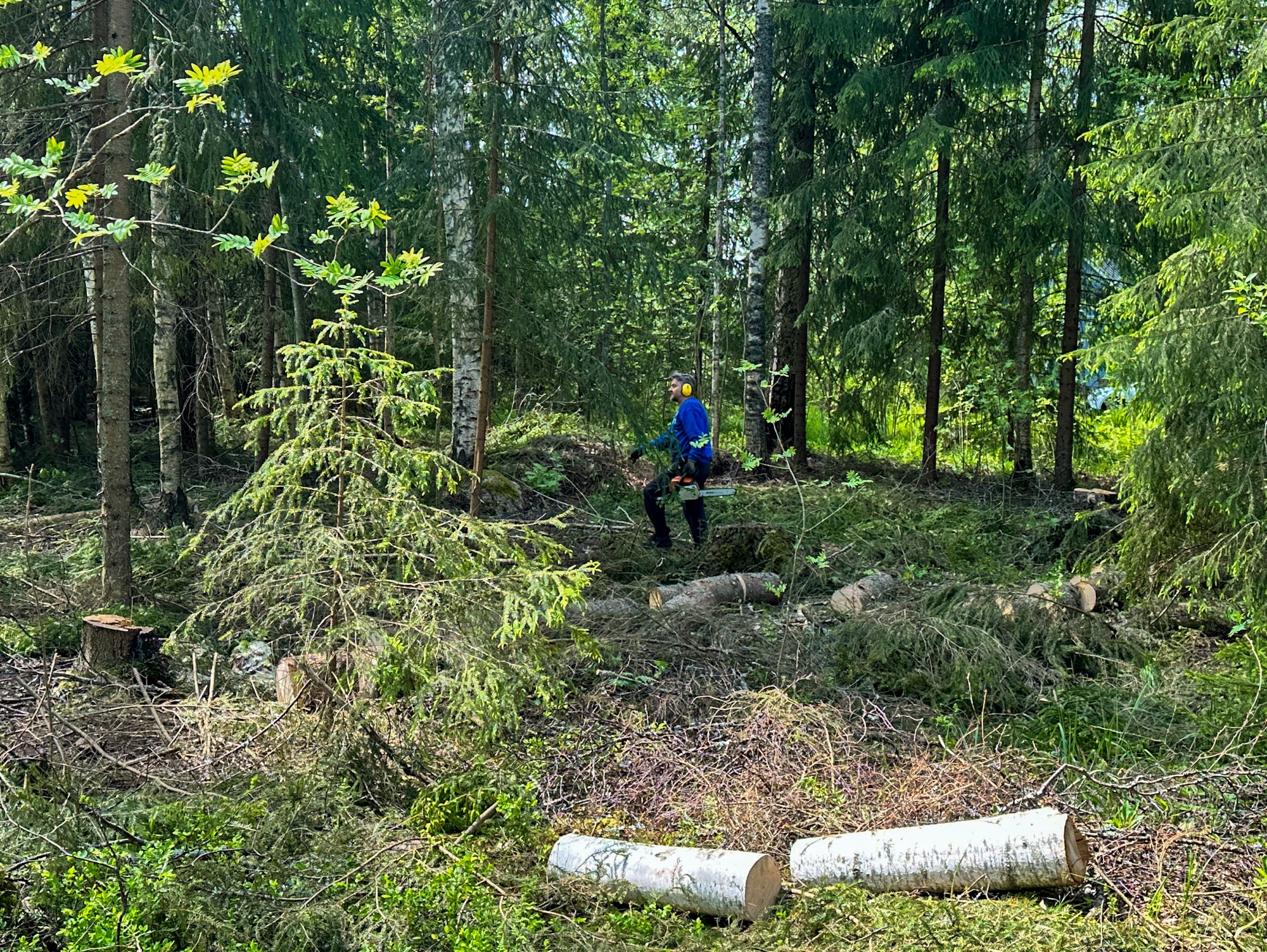 That was yesterday, the last day of May; we were at our summer house. I took some photos on my iPhone of one corner of our grounds. My husband is having fun with his chainsaw, clearing the area of small spruce trees to let some light into the corner and make it look nicer, as it was overgrown and not at all pleasing to look at. Well, it doesn’t look that way now either, but hopefully soon.