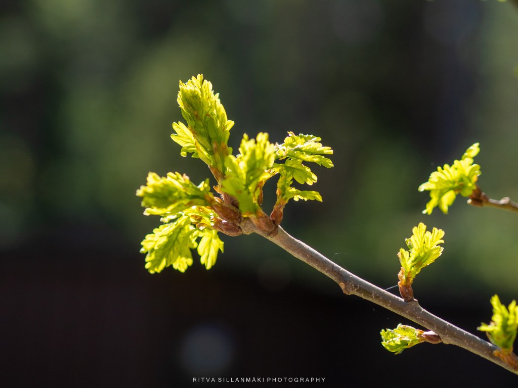 This I took with my Olympus – lens OLYMPUS M.45mm F1.8 while sitting on my patio at home watching the oak leaves starting to open from the warmth of the sun.