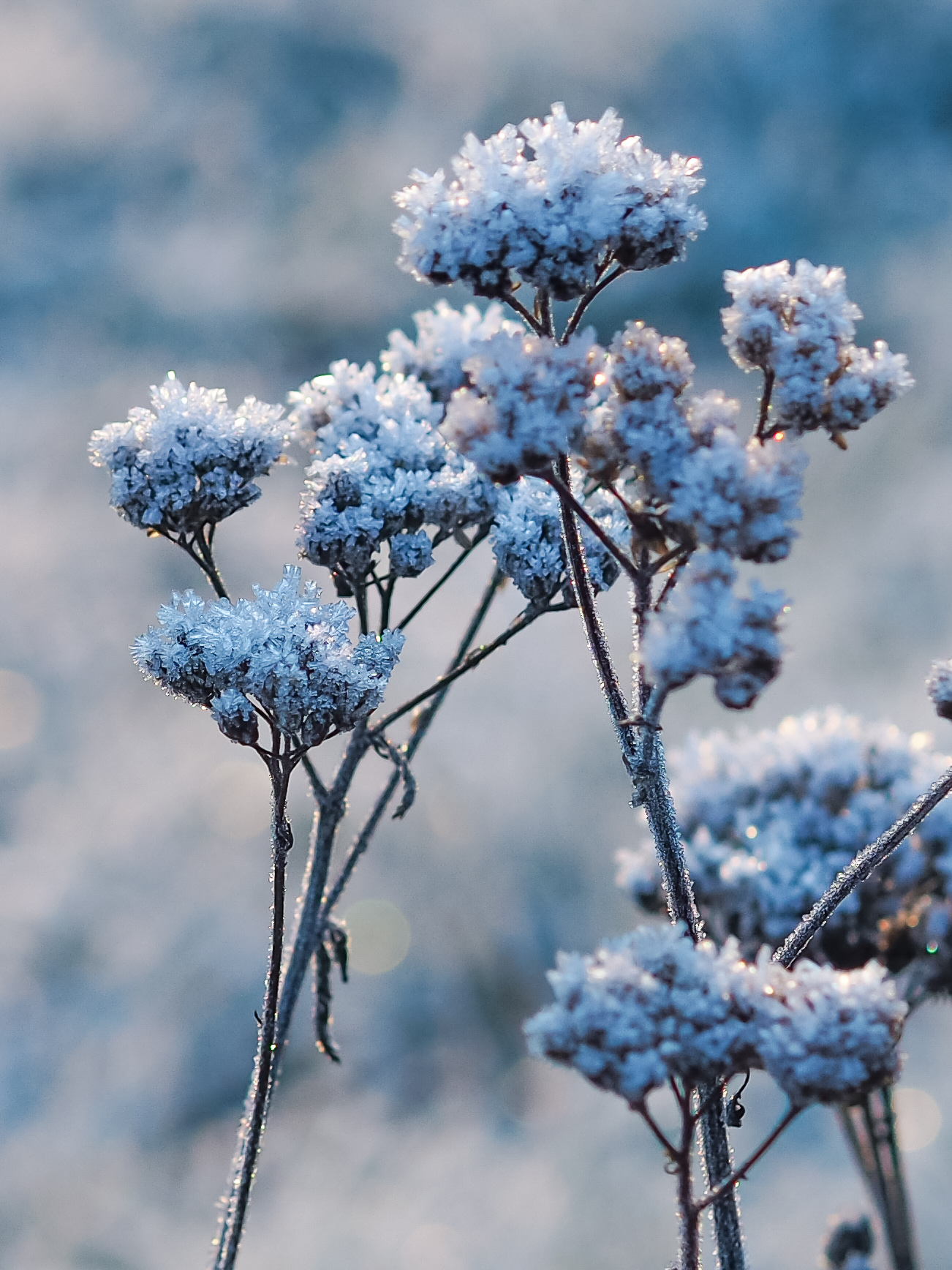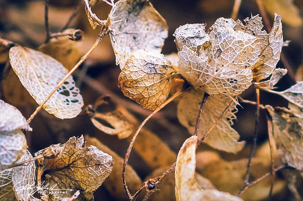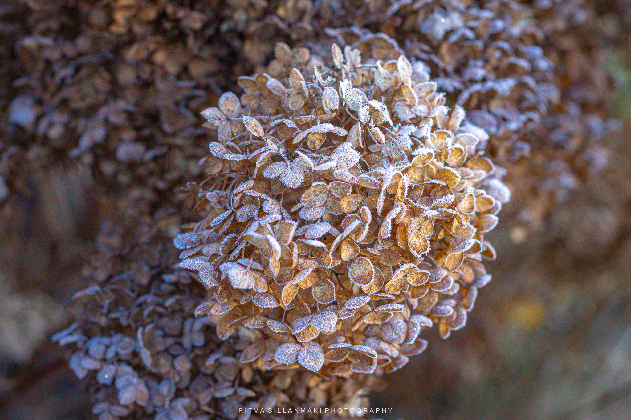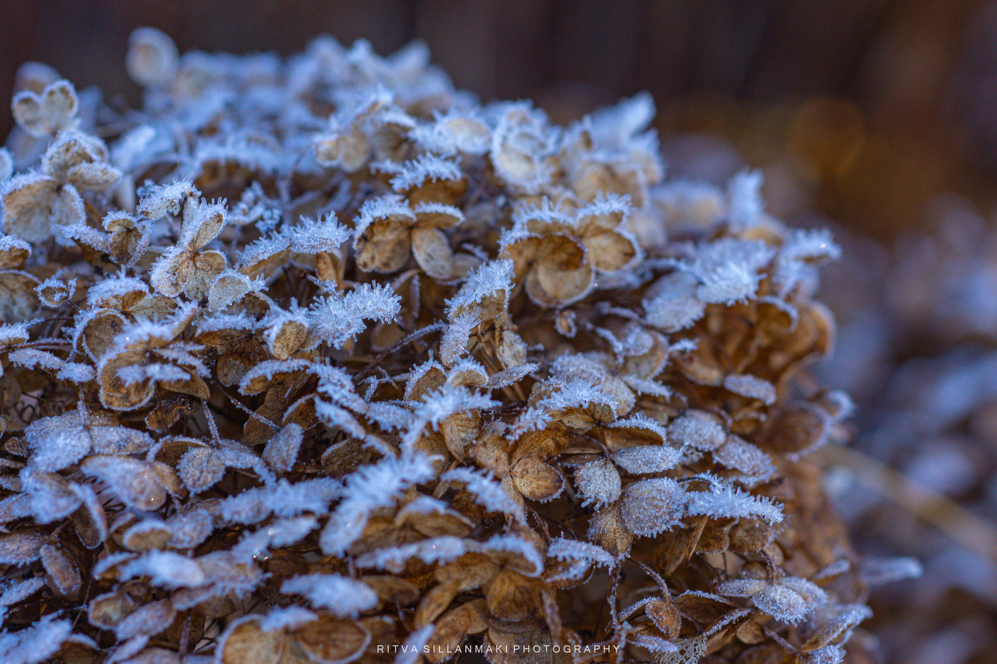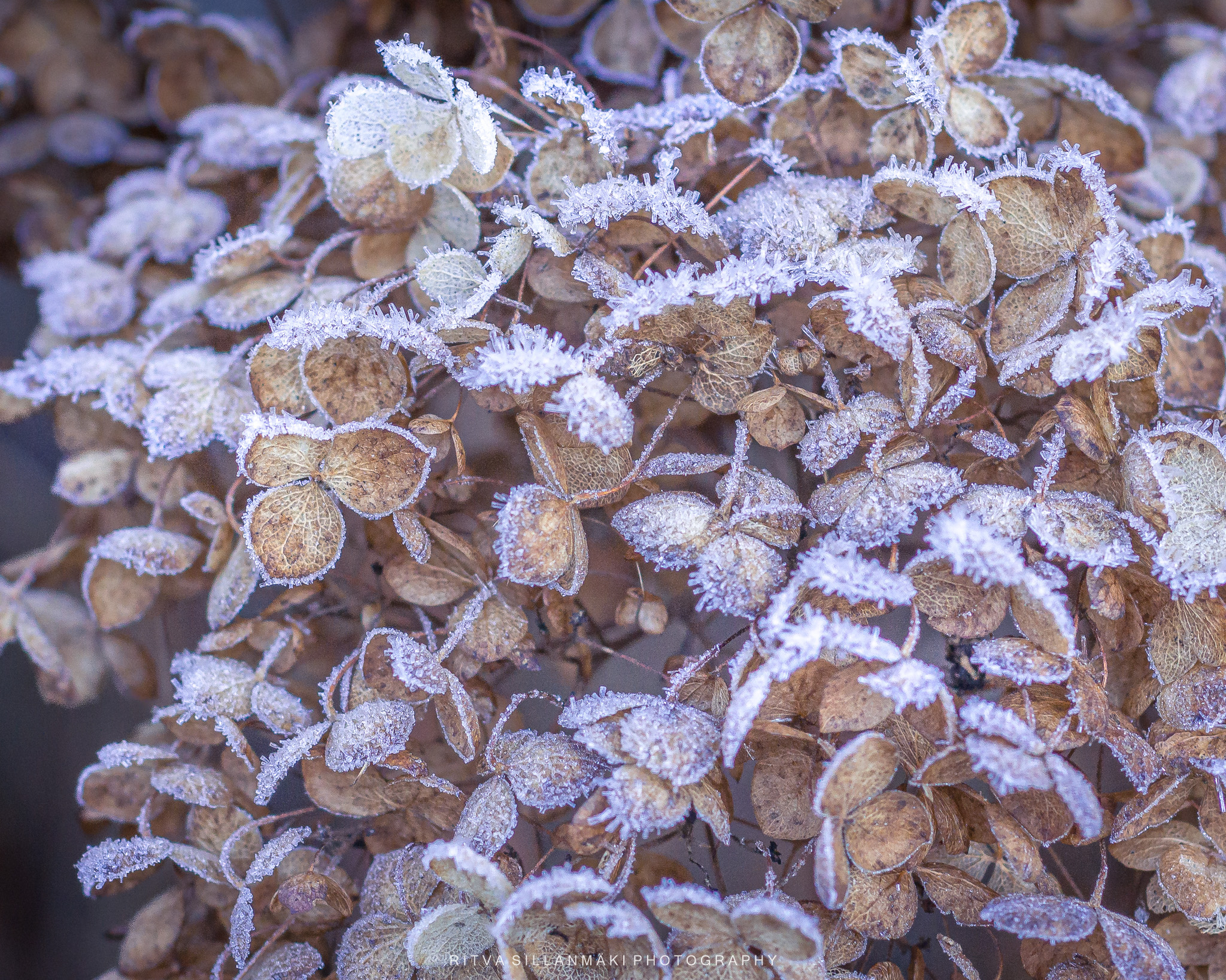 Close-up of frost-covered dried hydrangea flowers, showcasing their delicate texture and muted color palette.Close-up of intricate, dried floral structures showcasing delicate lace-like patterns.