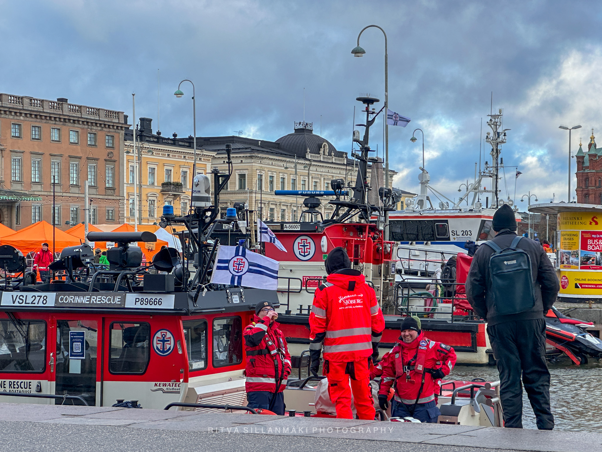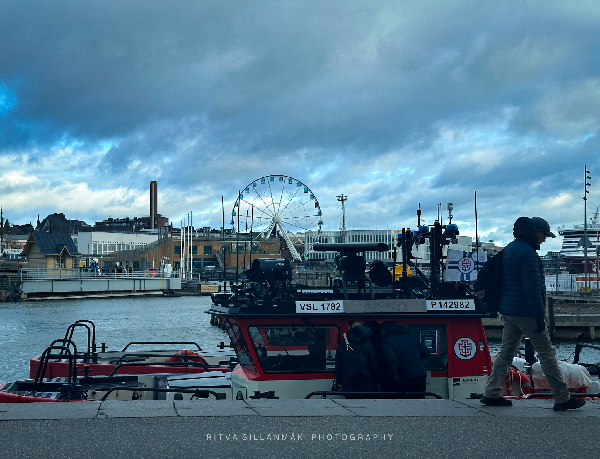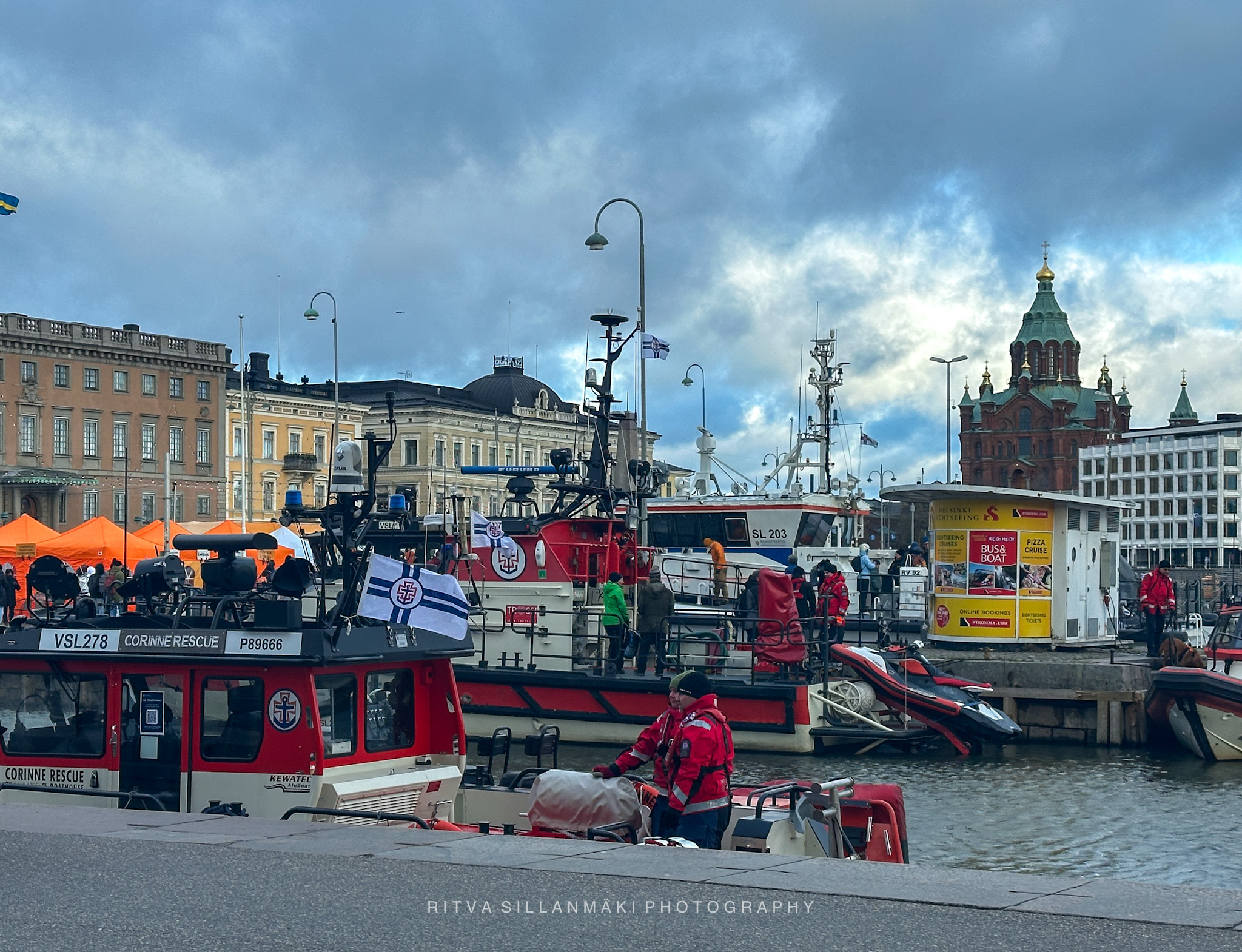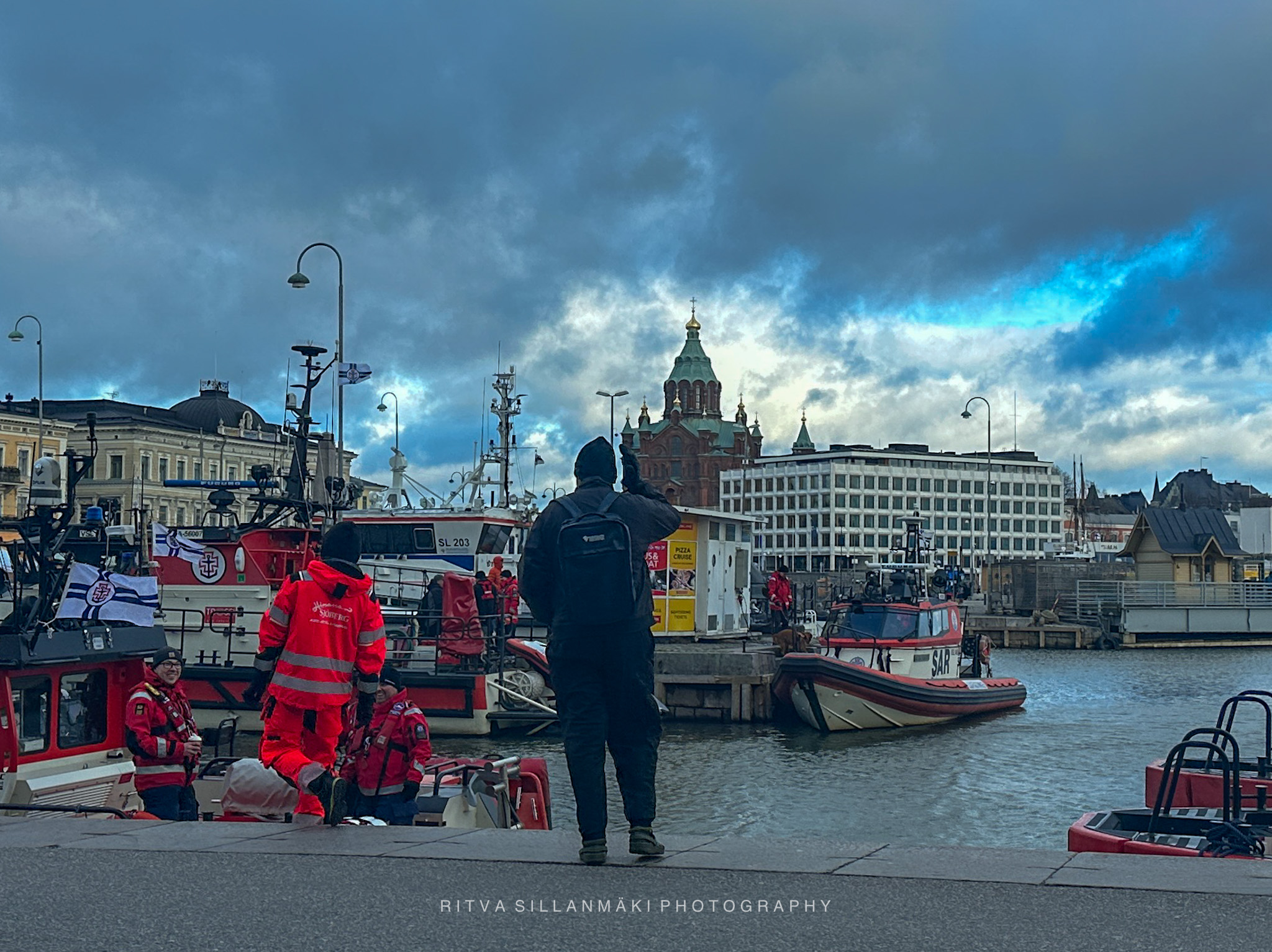 The wind that blew yesterday in Helsinki was so, so cold, slicing through the streets like a sharp knife, making each passerby pull their coats tighter around themselves. Despite the frigid temperatures, there were still some dedicated souls about, braving the chill to learn about the rescue service boats by the marketplace.