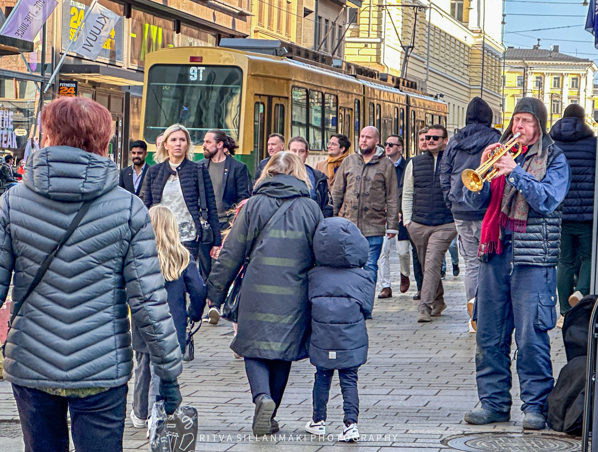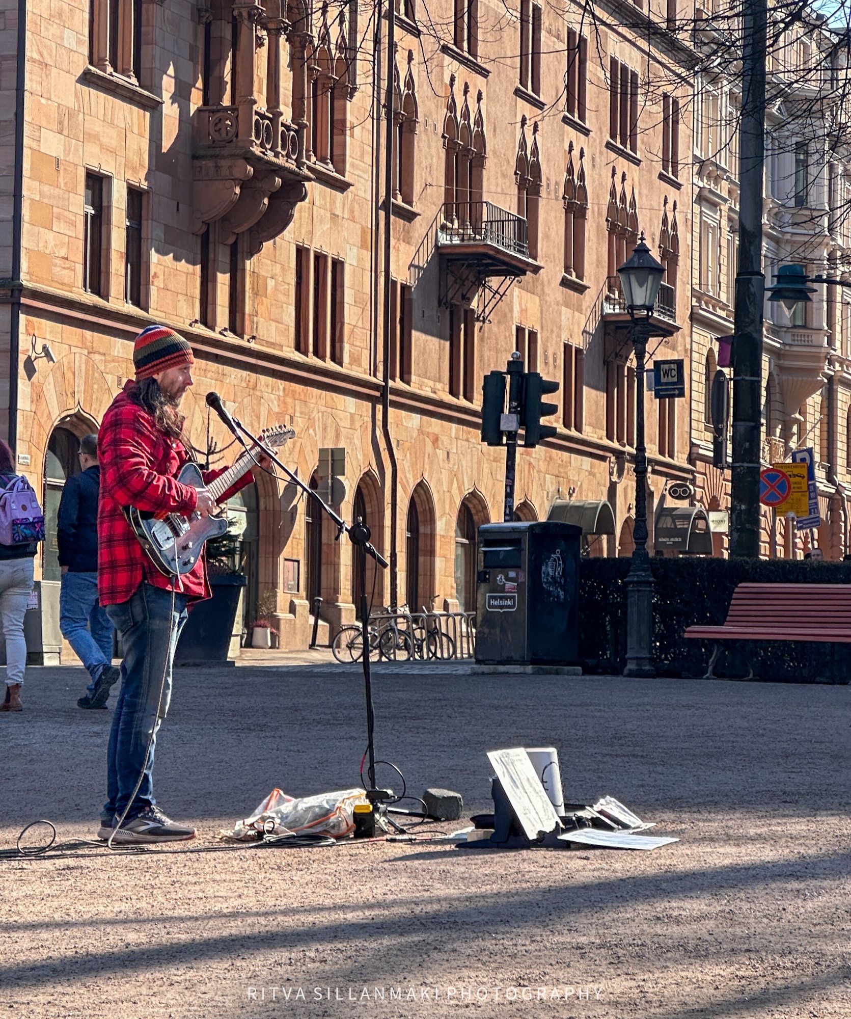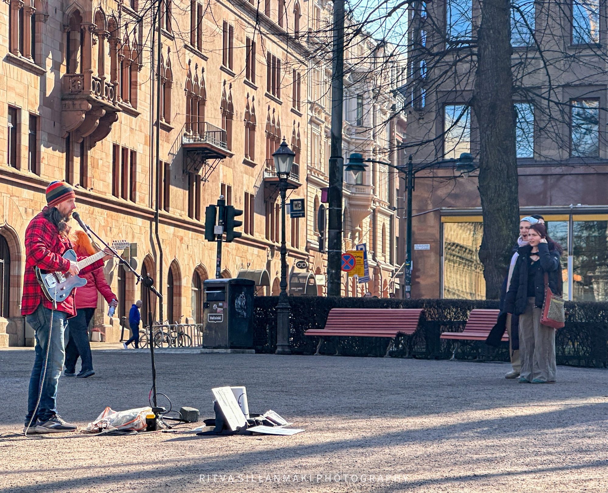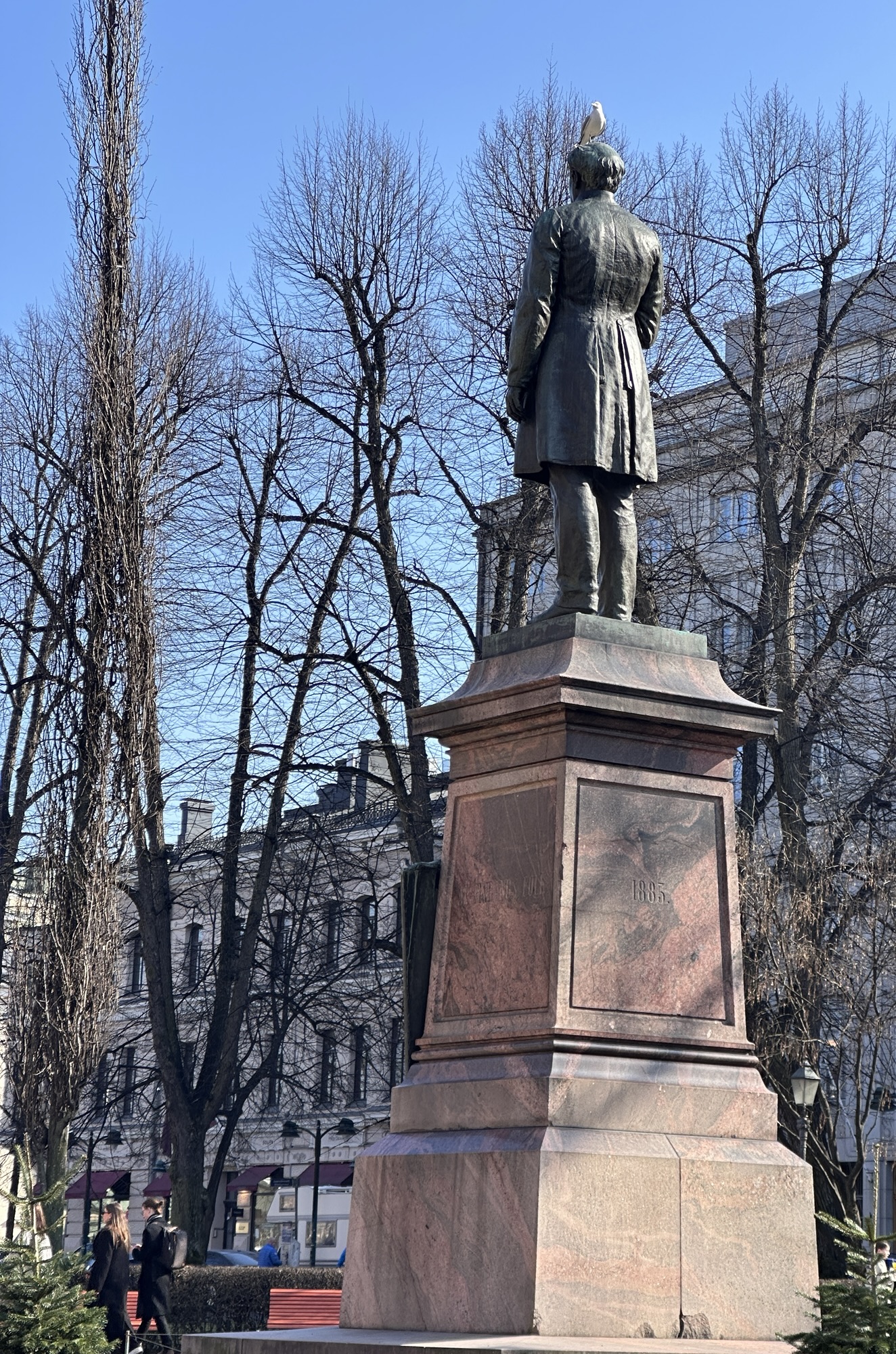 I took in the sight of the seagull perched majestically on top of The Johan Ludvig Runeberg Monument, which is a revered tribute to the esteemed poet J. L. Runeberg, located in Esplanade Park in Helsinki, Finland. The staue intricately sculpted by his son, Walter Runeberg, has stood as a proud symbol of Finnish heritage since its unveiling in 1885. While I paused to appreciate its significance, my attention was drawn to a street musician nearby, passionately singing “Hallelujah,” as his soulful voice filled the air, drawing in a small crowd of curious passersby. Moving on, I continued to soak in the vibrant spring atmosphere and soon found myself listening to a skilled trumpet player on a bustling corner of Aleksanterin katu, surrounded by the rhythmic pulse of city life, where countless people dressed in dark clothes walked by, adding to the tapestry of urban existence.