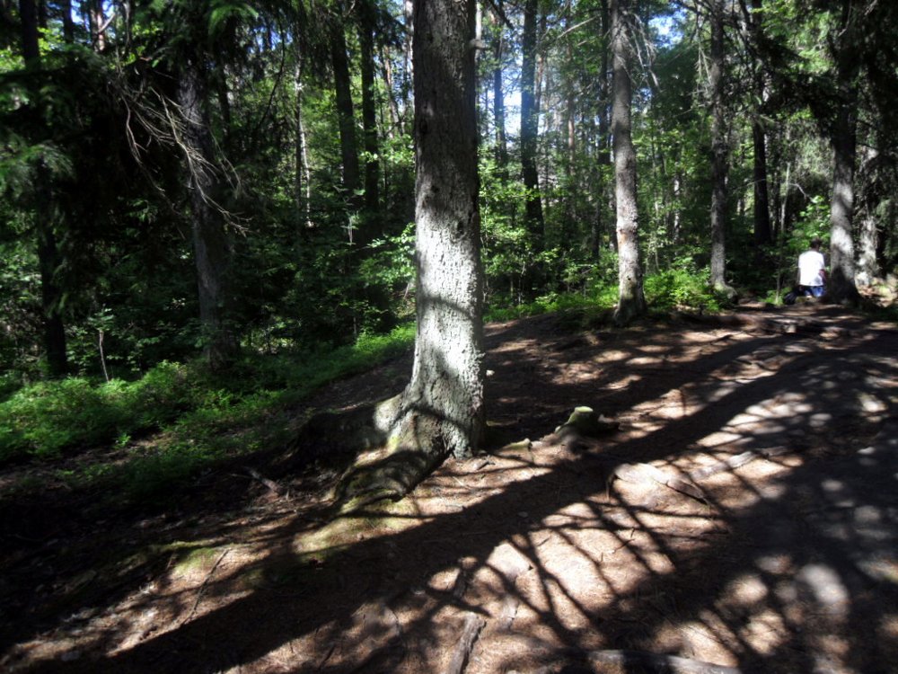 Intricate roots and rocky terrain in the lush surroundings of Juveninkoski waterfall.