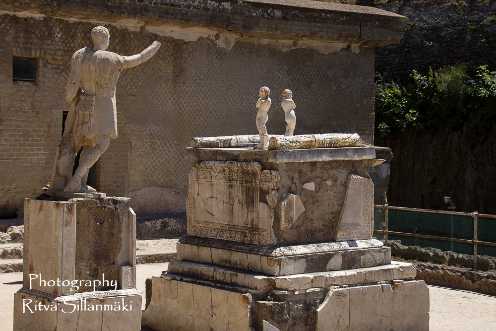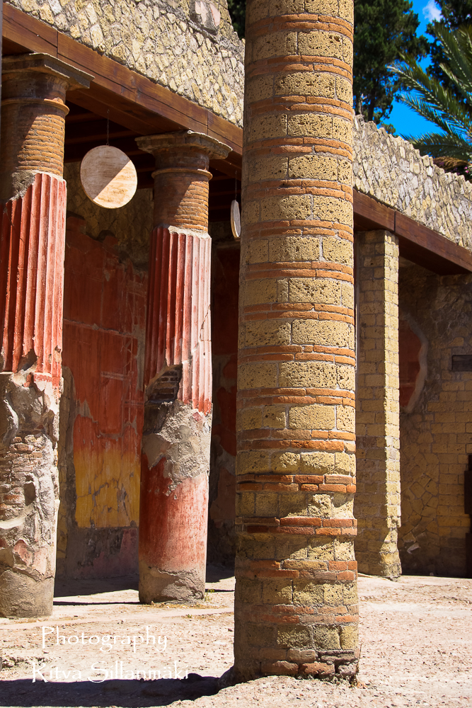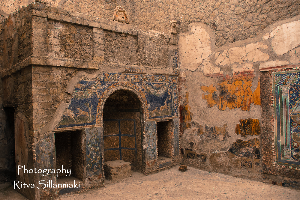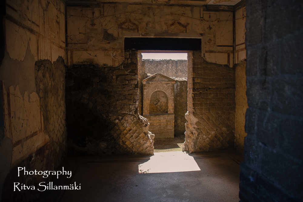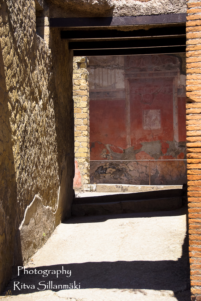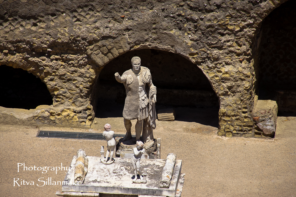 Herculaneum was an ancient Roman town destroyed by volcanic pyroclastic flows in 79 AD. Its ruins are located in the commune of Ercolano, Campania, Italy.s a UNESCO World Heritage Site, it is famous as one of the few ancient cities that can now be seen in much of its original splendour, as well as for having been lost, along with Pompeii, in the eruption of Mount Vesuvius in AD 79 that buried it. Unlike Pompeii, the deep pyroclastic material which covered it preserved wooden and other organic-based objects such as roofs, beds, doors, food and even some 300 skeletons which were surprisingly discovered in recent years along the seashore. Here are few shots seen when entering the the site and The “Boat houses” where skeletons were found.