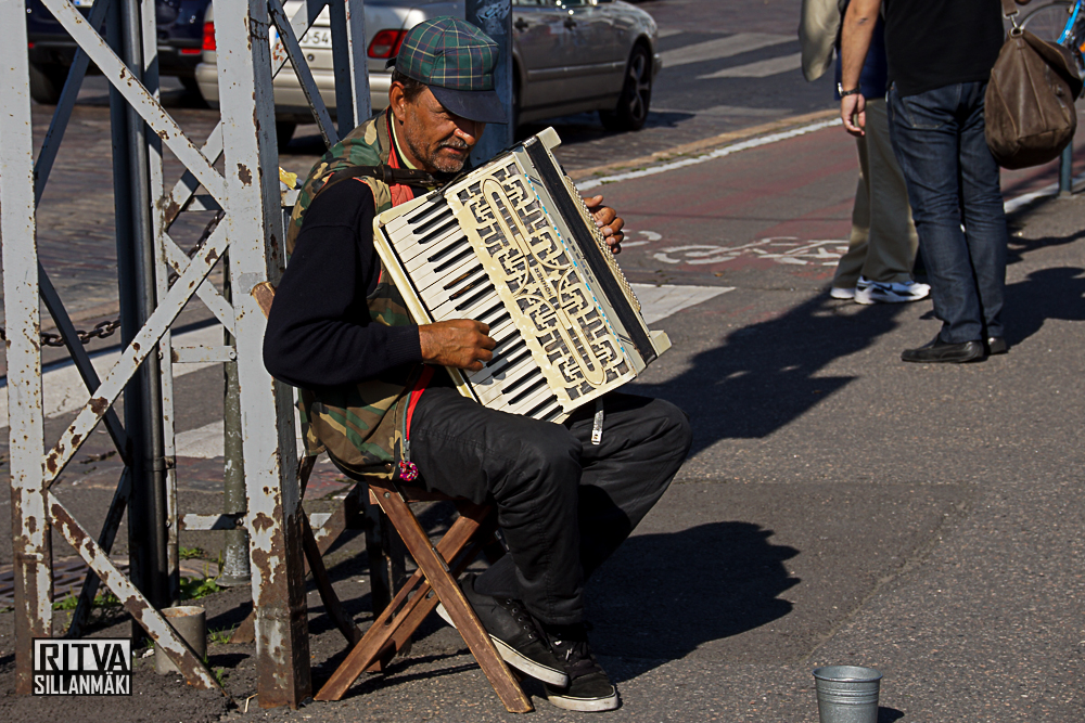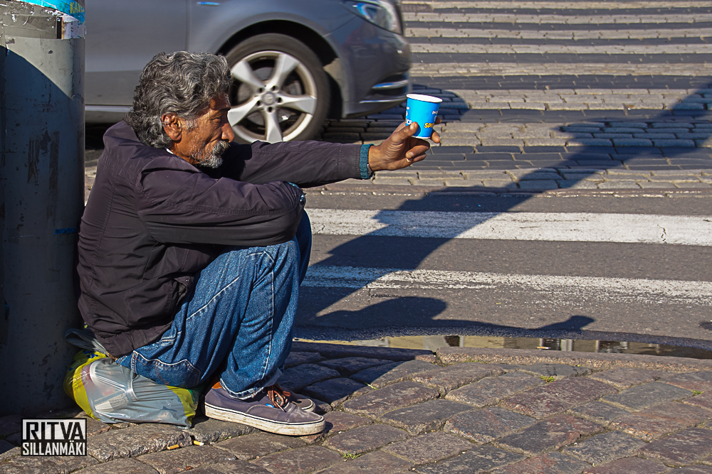 A Romanian beggar sitting on the side of the road, unfortunately, a common sight in Helsinki today. this summer there were about 230 staying temporarily in Helsinki. I would not be able to endure this life.