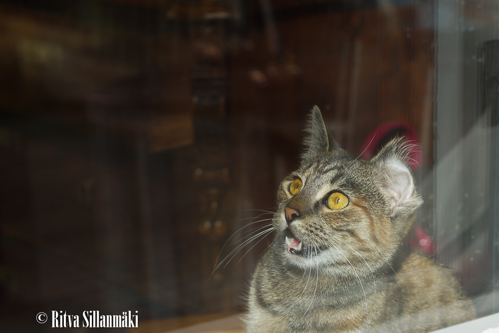 This week I did not have time to search for reflections, So I took a photo of our kitty through the window, its me and the greenness of spring reflecting from a dirty window 🙂