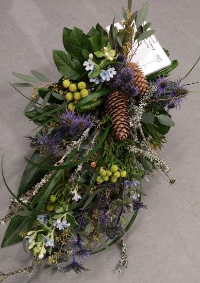 I want to it to represent a him, I do not wish it to be so traditional more personal. So I requested that it would have materials from the forest on it pine tree branches, tree cones, different greens and season appropriate flowers as he was a outdoor kind of man.